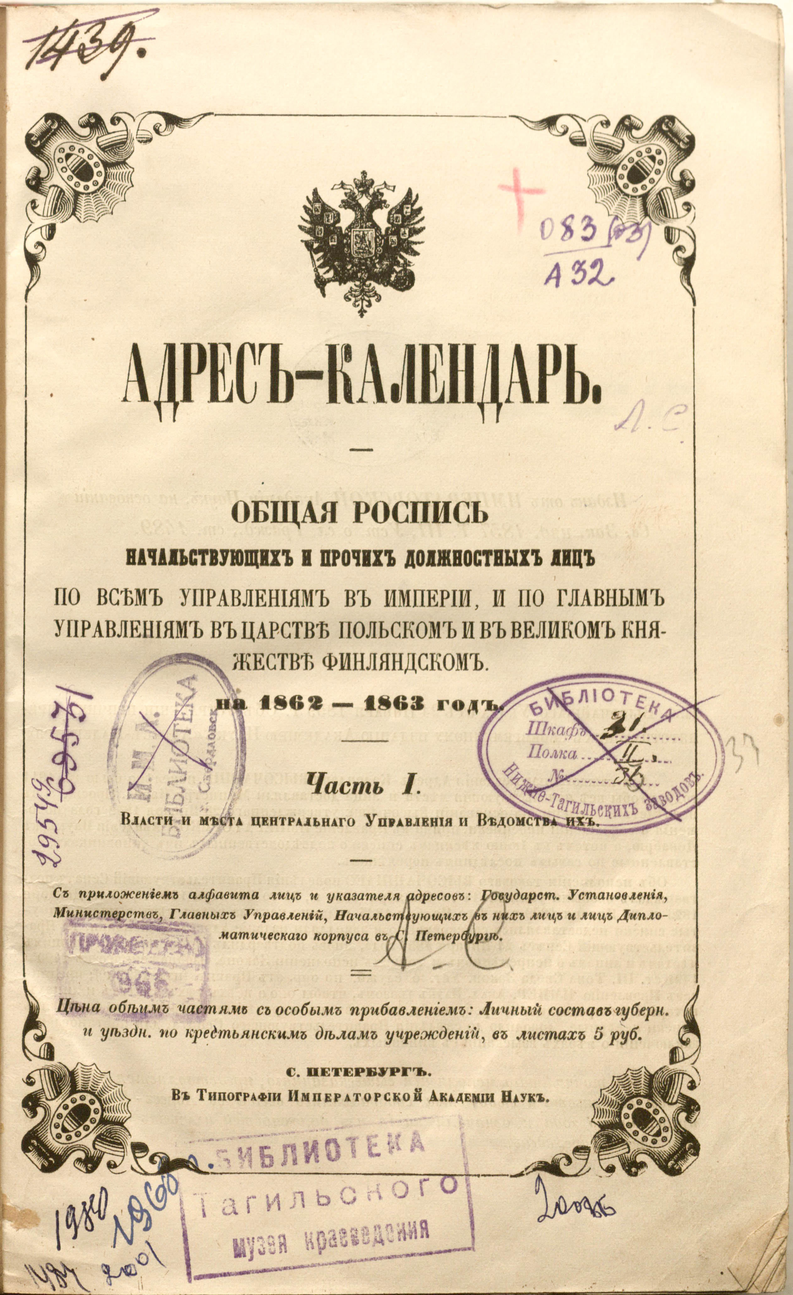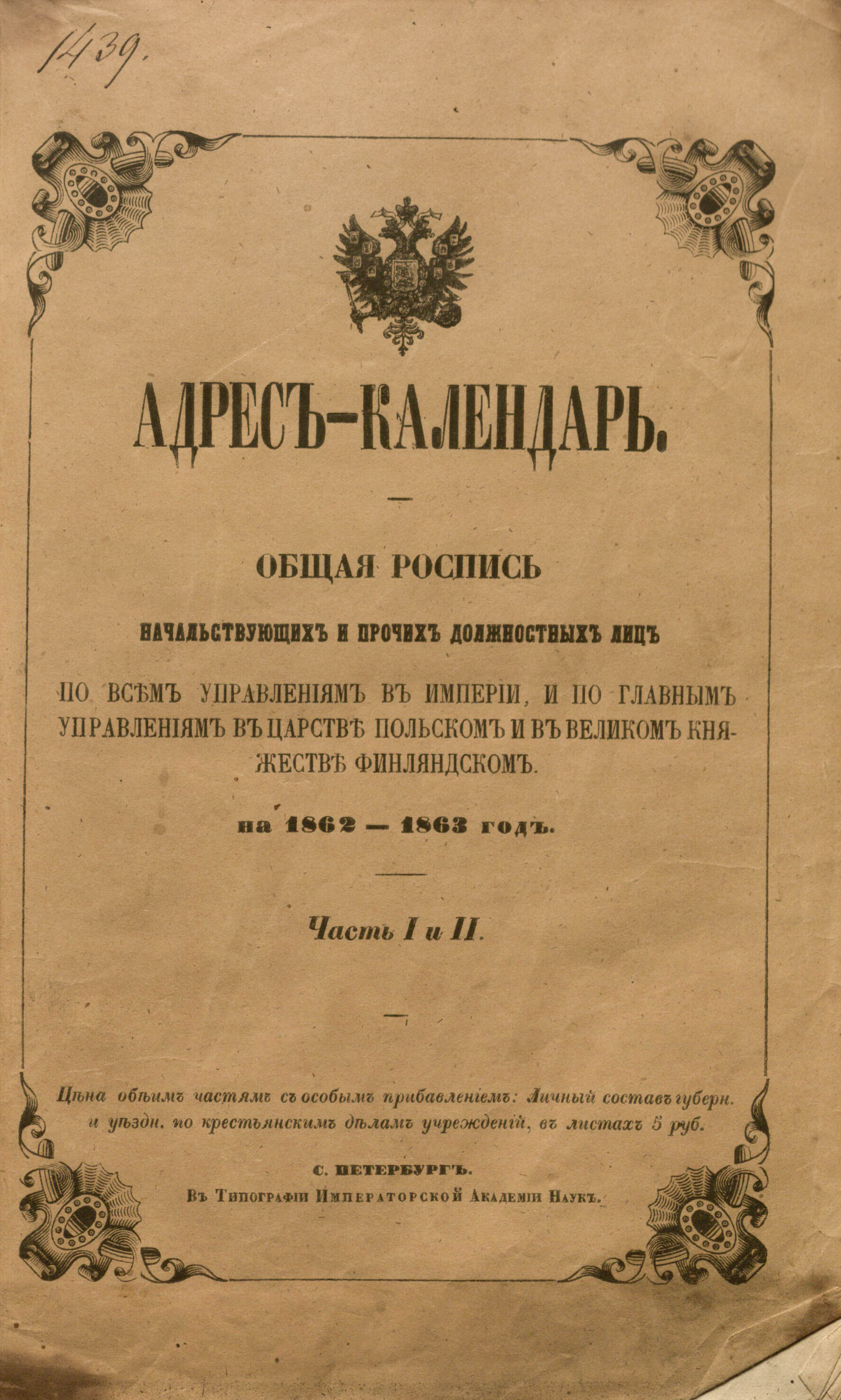 Адрес-календарь : общая роспись начальствующих и прочих должностных лиц по всем управлениям в Российской Империи по главным управлениям в царстве Польском и в Великом княжестве Финляндском на 1862-1863 год. Ч. 1- 2. — Санкт-Петербург : в типографии Императорской Академии Наук, 1863. — разд. пагинация ; 25х16 см.