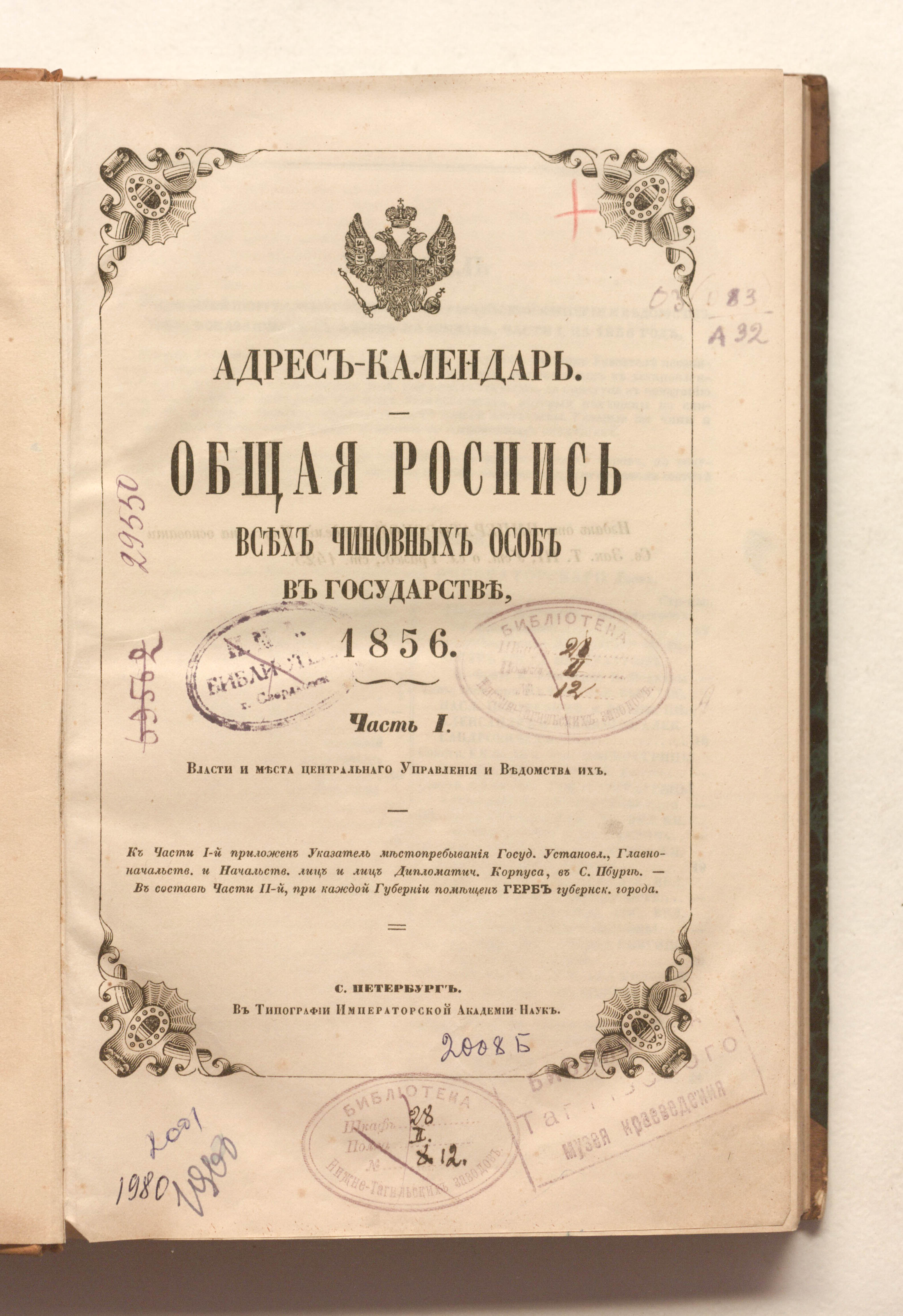 Адрес-Календарь : общая роспись всех чиновных особ в государстве. Ч. 1. — Санкт-Петербург : тип. императорской Академии наук, 1856. — 309, 7, 98 с. ; 25х16 см.