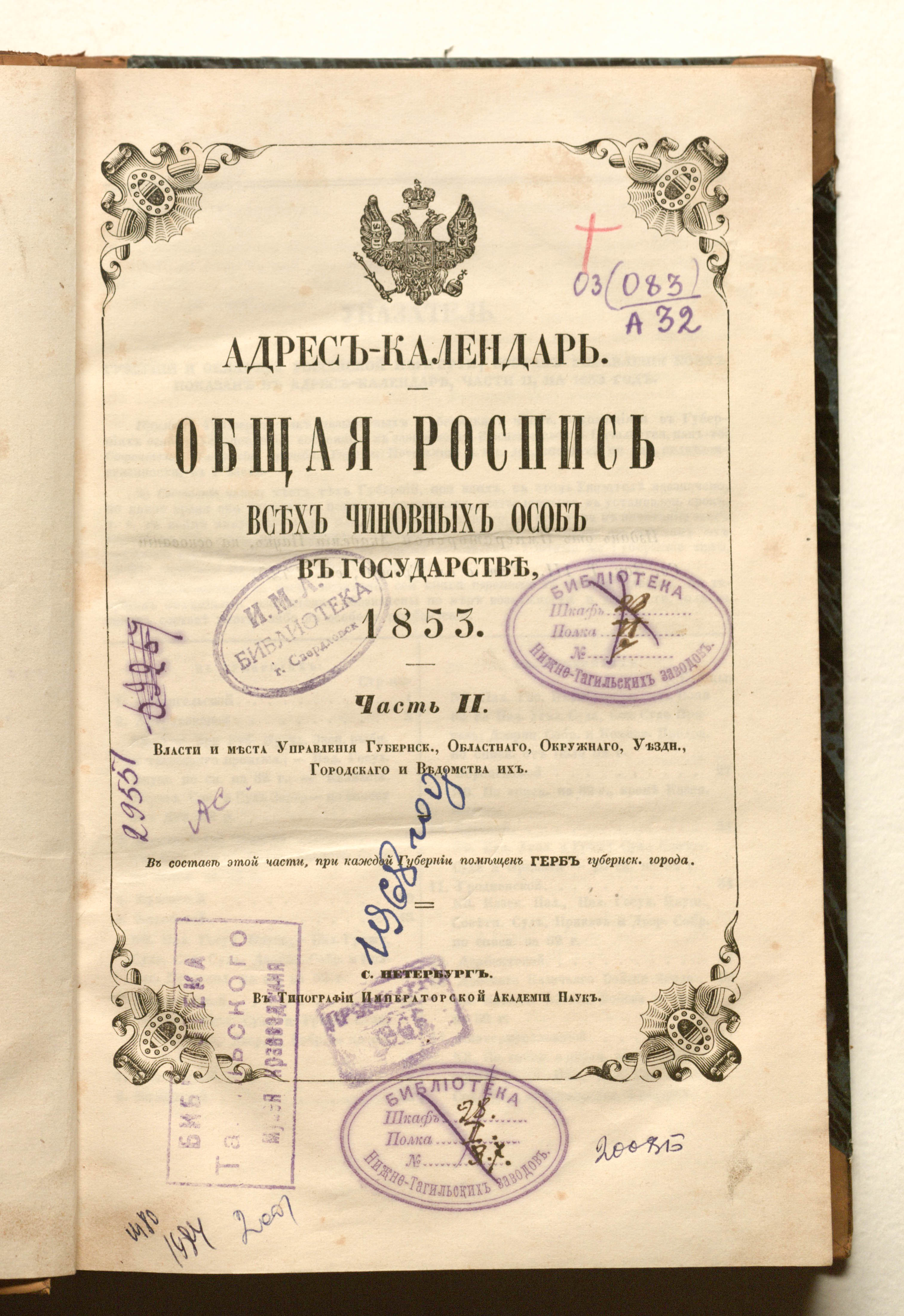 Адрес-Календарь : общая роспись всех чиновных особ в государстве. Ч. 2. — Санкт-Петербург : тип. императорской Академии наук, 1853. — 3, 199, 66 с. ; 25х16,5 см.