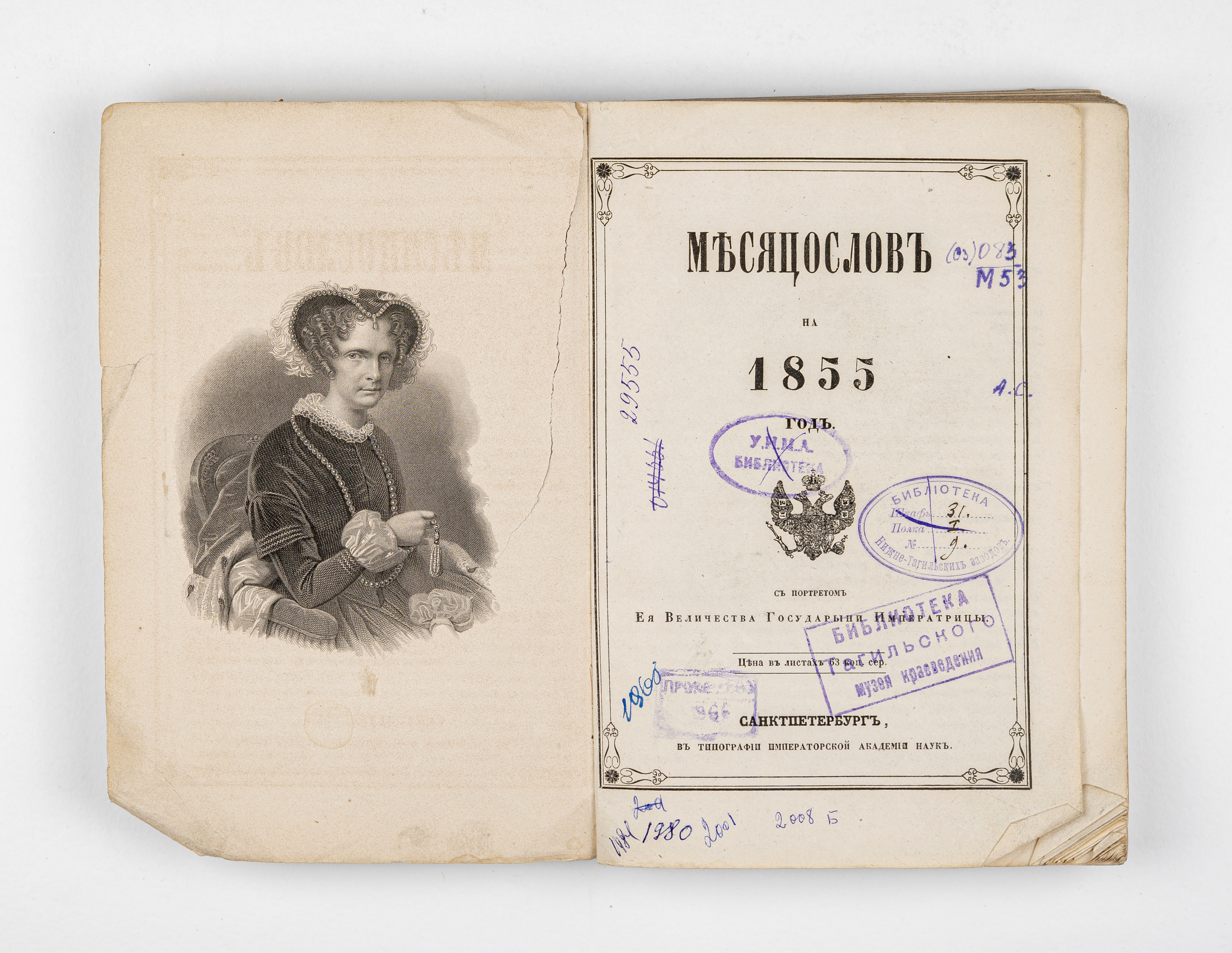 Месяцослов на 1855 год. – Санкт-Петербург : типография Императорской Академии наук, 1855. – 334, XVIII c. : грав. фронт. ; 21,5х14 см.