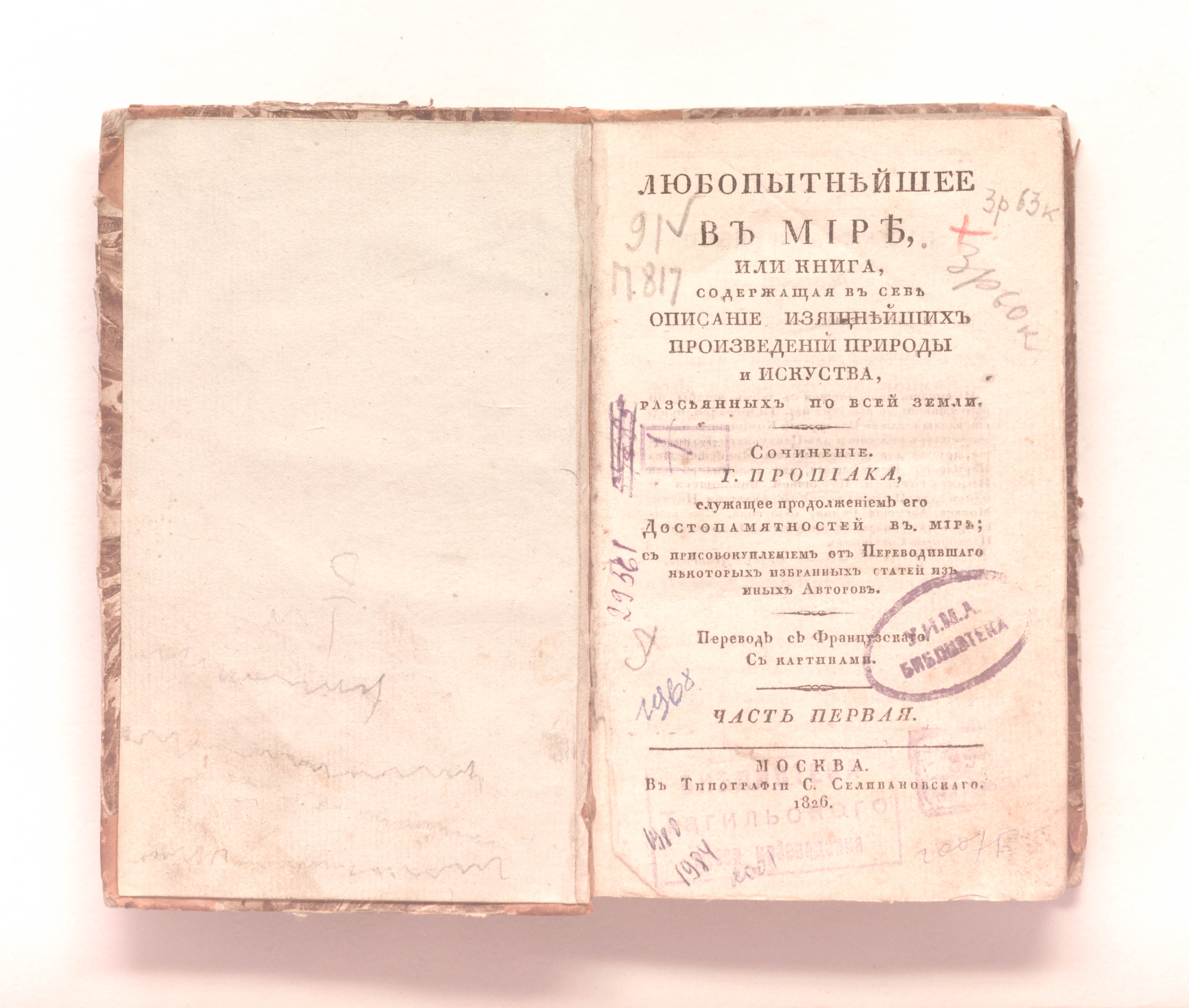 Ч. 1 / сочинение г. Пропиака, служащее продолжением его Достопамятностей в мире, с присовокуплением от переводившаго некоторых избранных статей из иных авторов ; перевод с французскаго. — Москва : В типографии С. Селивановскаго, 1826. — XII, 263 с. ; 17,5х11 см.