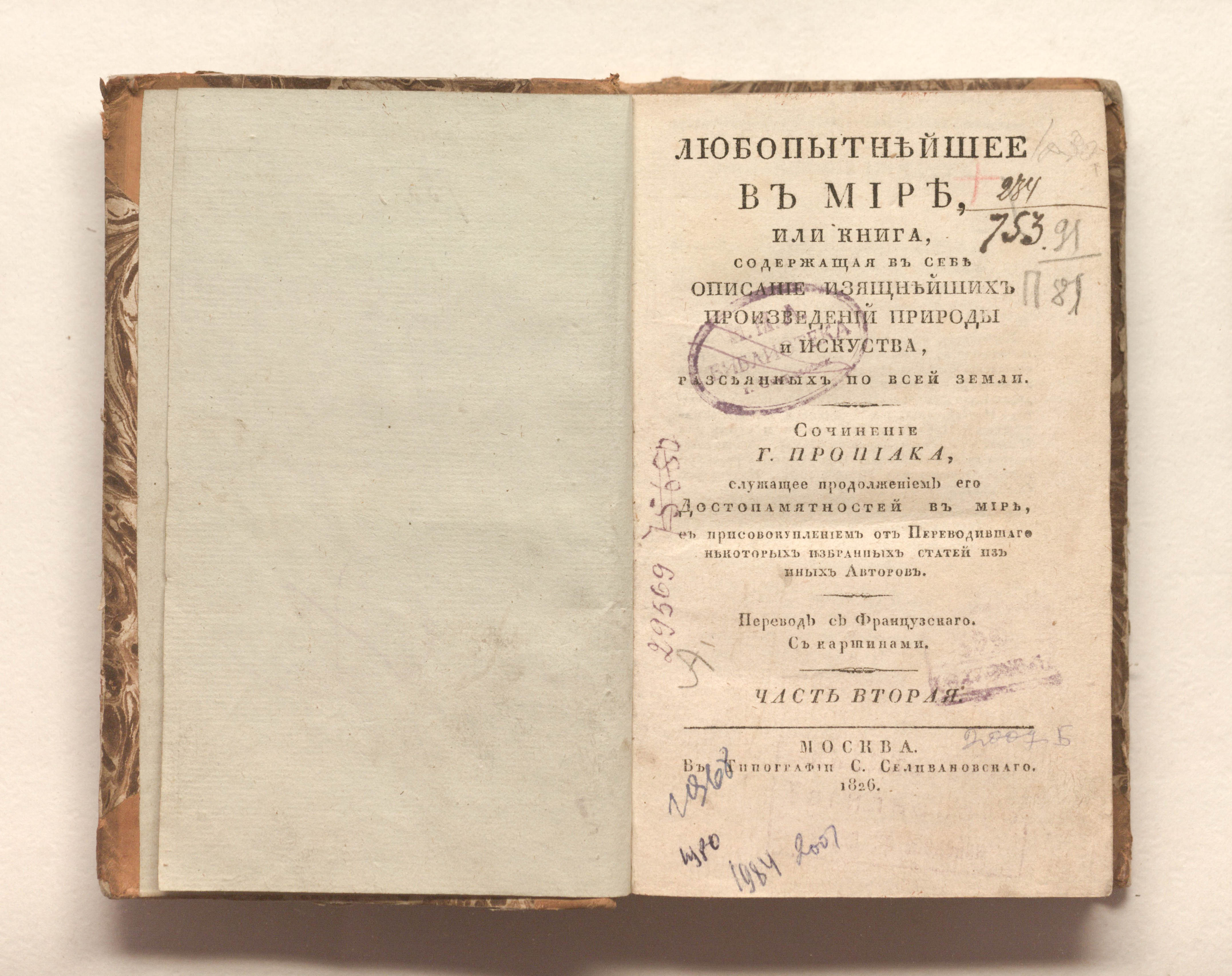 Любопытнейшее в мире, или книга, содержащая в себе описание изящнейших произведений природы и искуства, разсеянных по всей земли. Ч. 2 / сочинение г. Пропиака, служащее продолжением его Достопамятностей в мире, с присовокуплением от переводившаго некоторых избранных статей из иных авторов ; перевод с французскаго. — Москва : в типографии С. Селивановскаго, 1826. — [2], V, 281 с. ; 17,5х11 см.