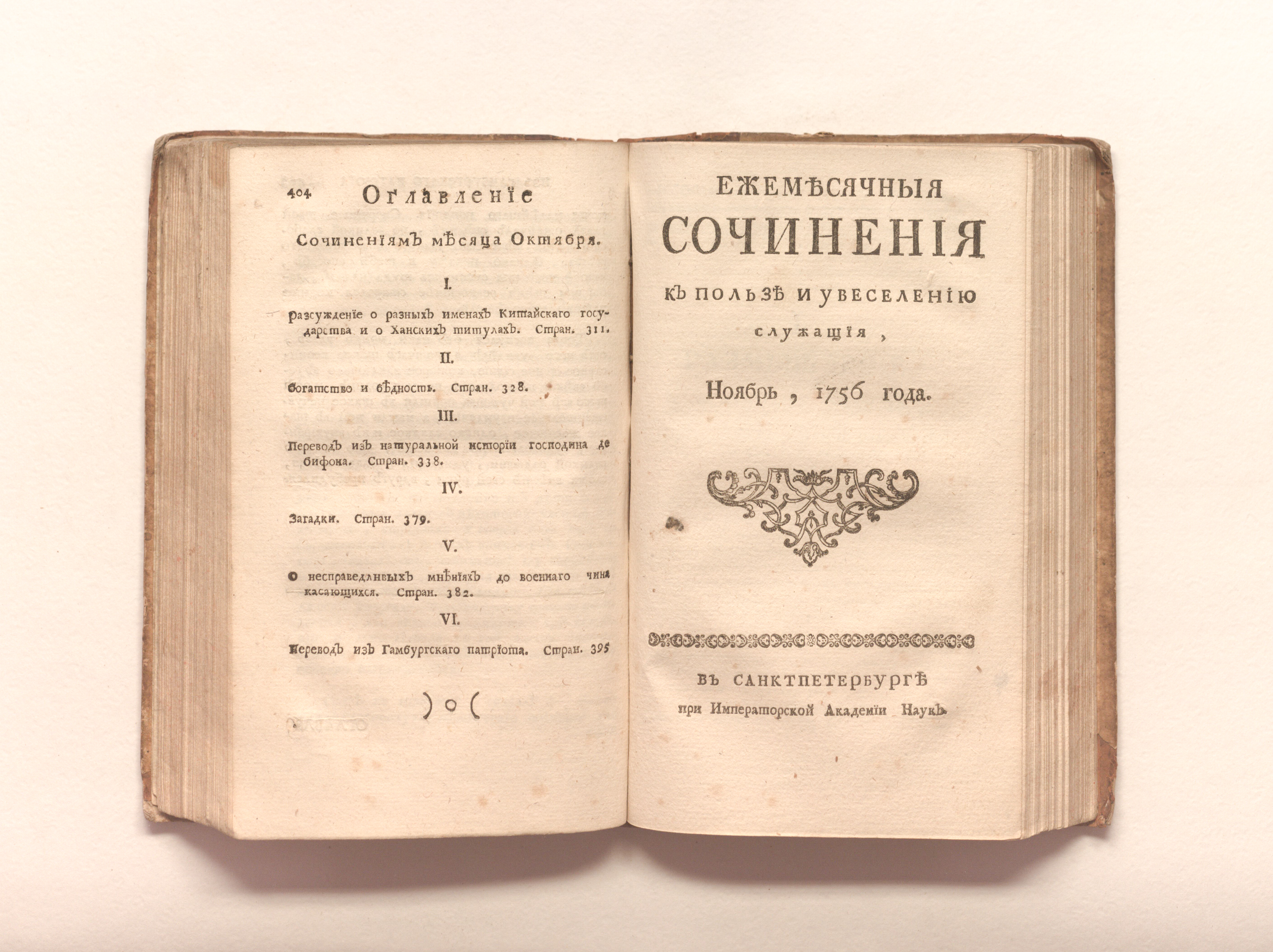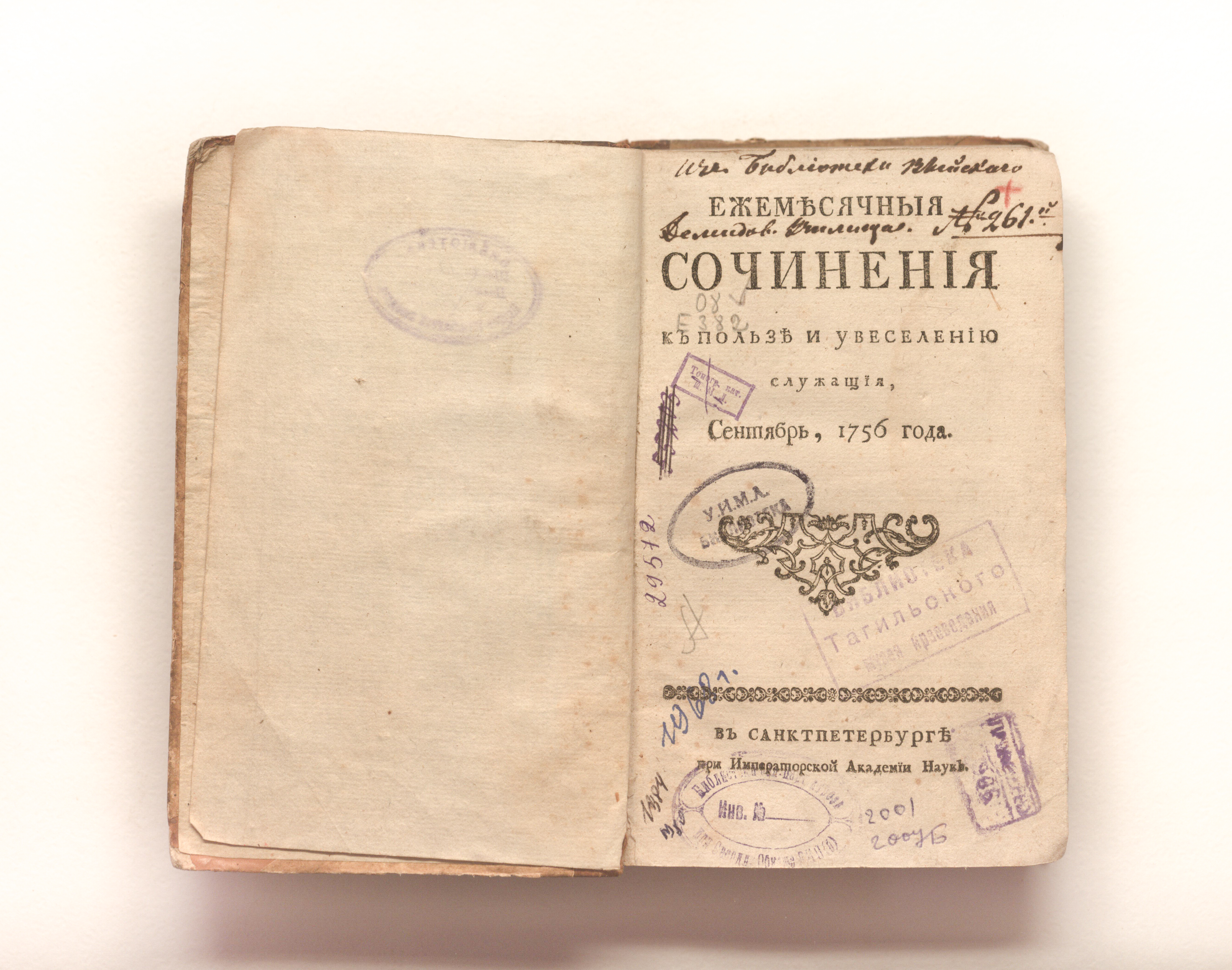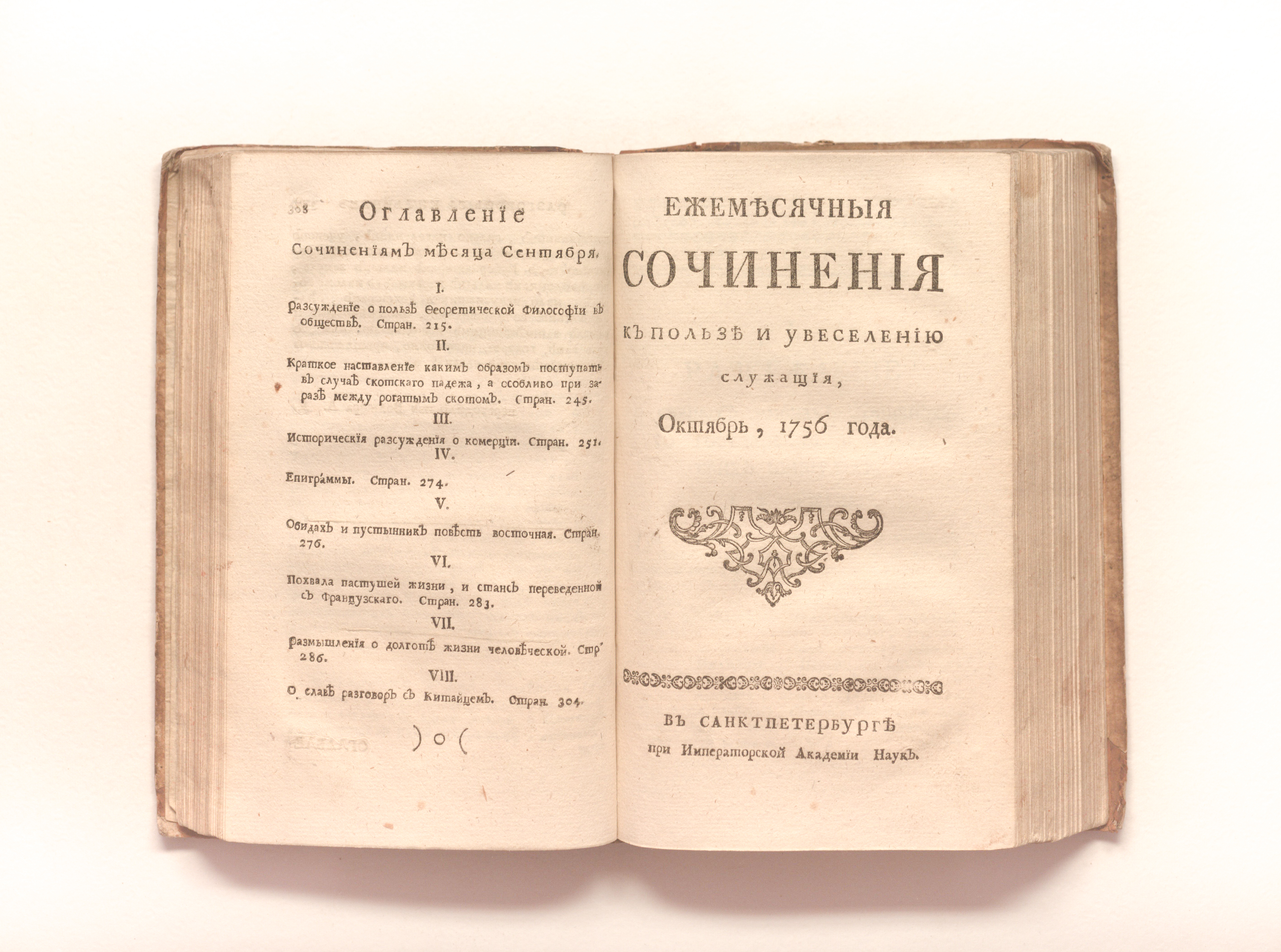 Ежемесячныя сочинения к пользе и увеселению служащия. — Санкт-Петербург : При Императорской Академии наук. — 1756. — Сентябрь-август. — 215-600 с. ; 19х12 см.