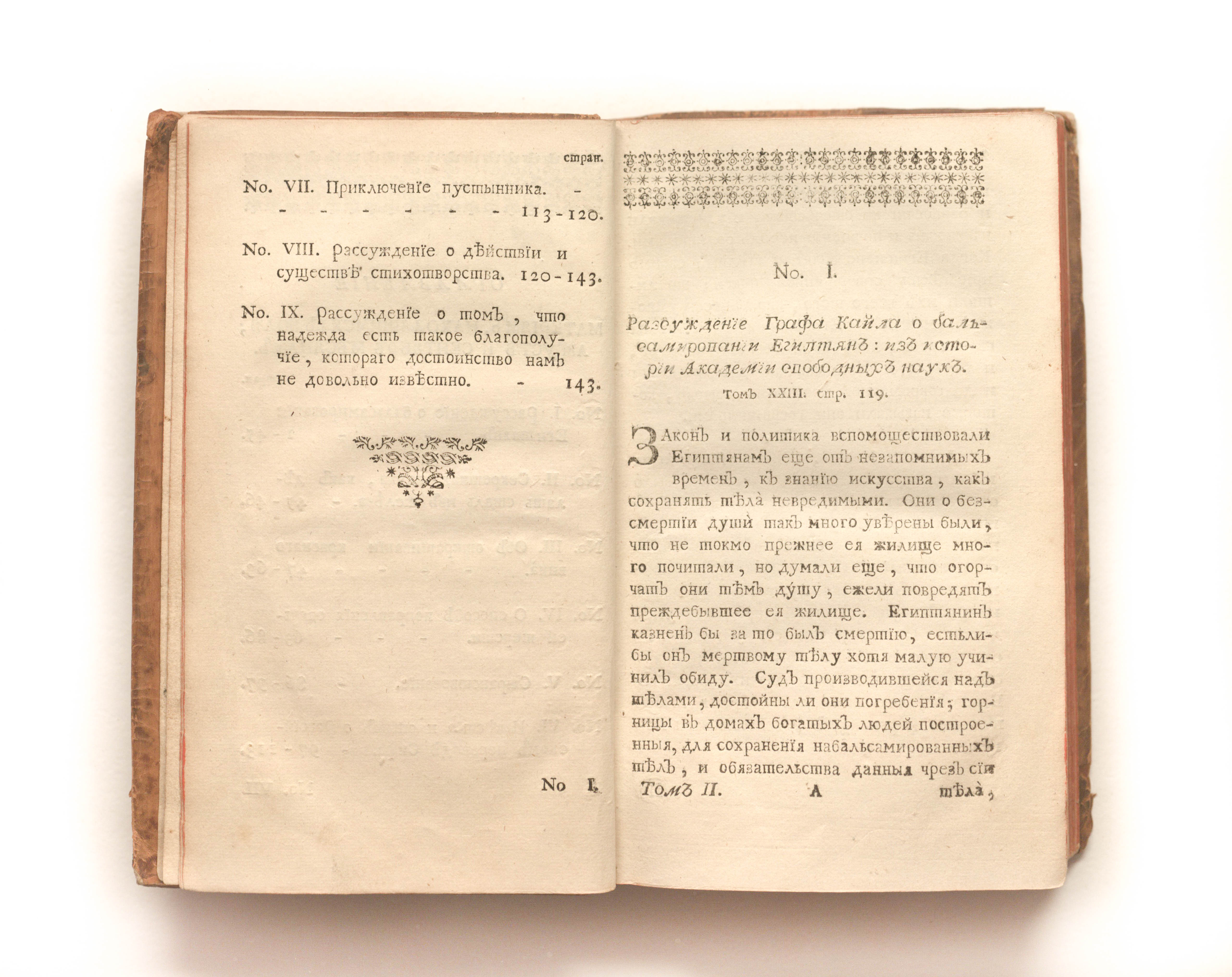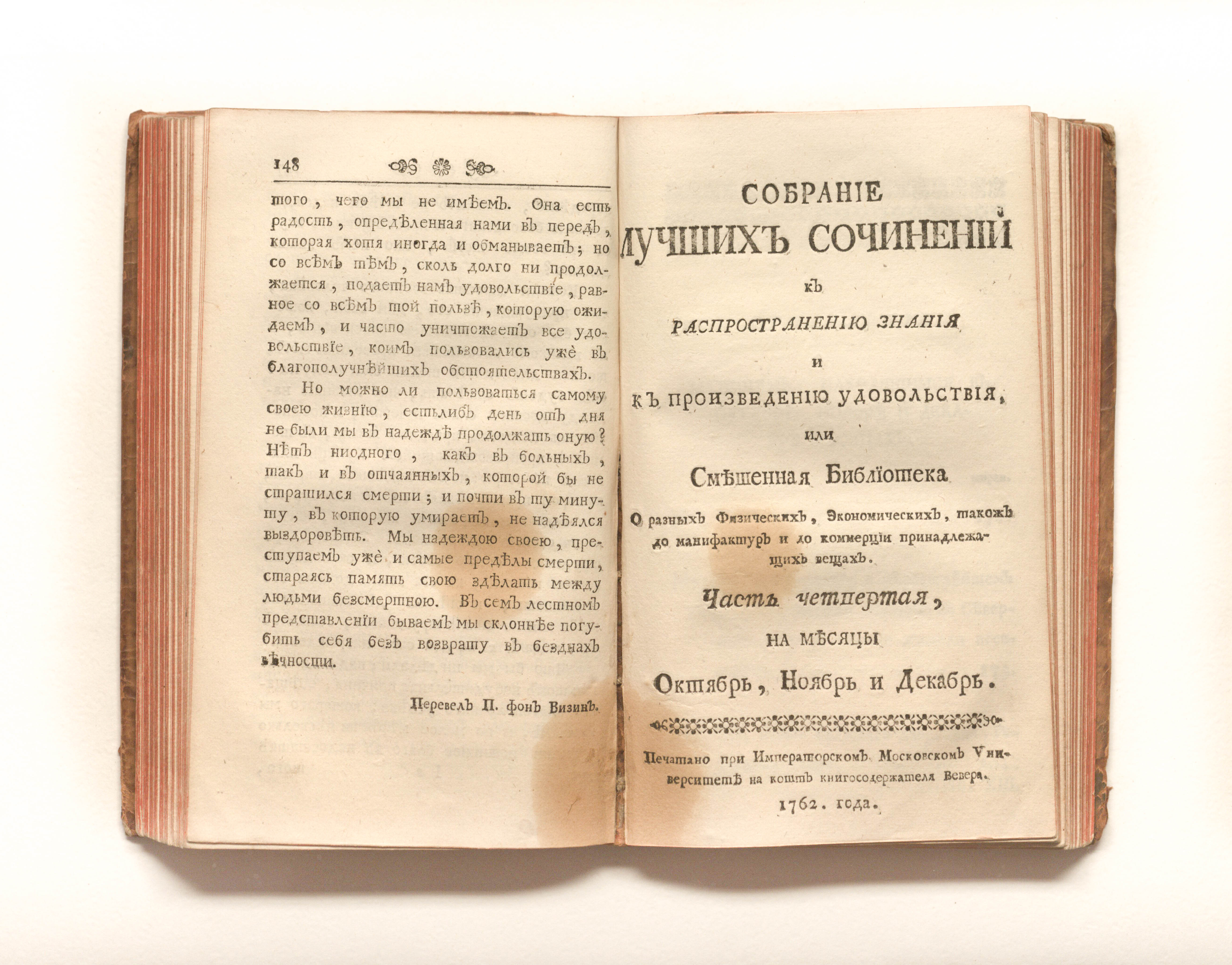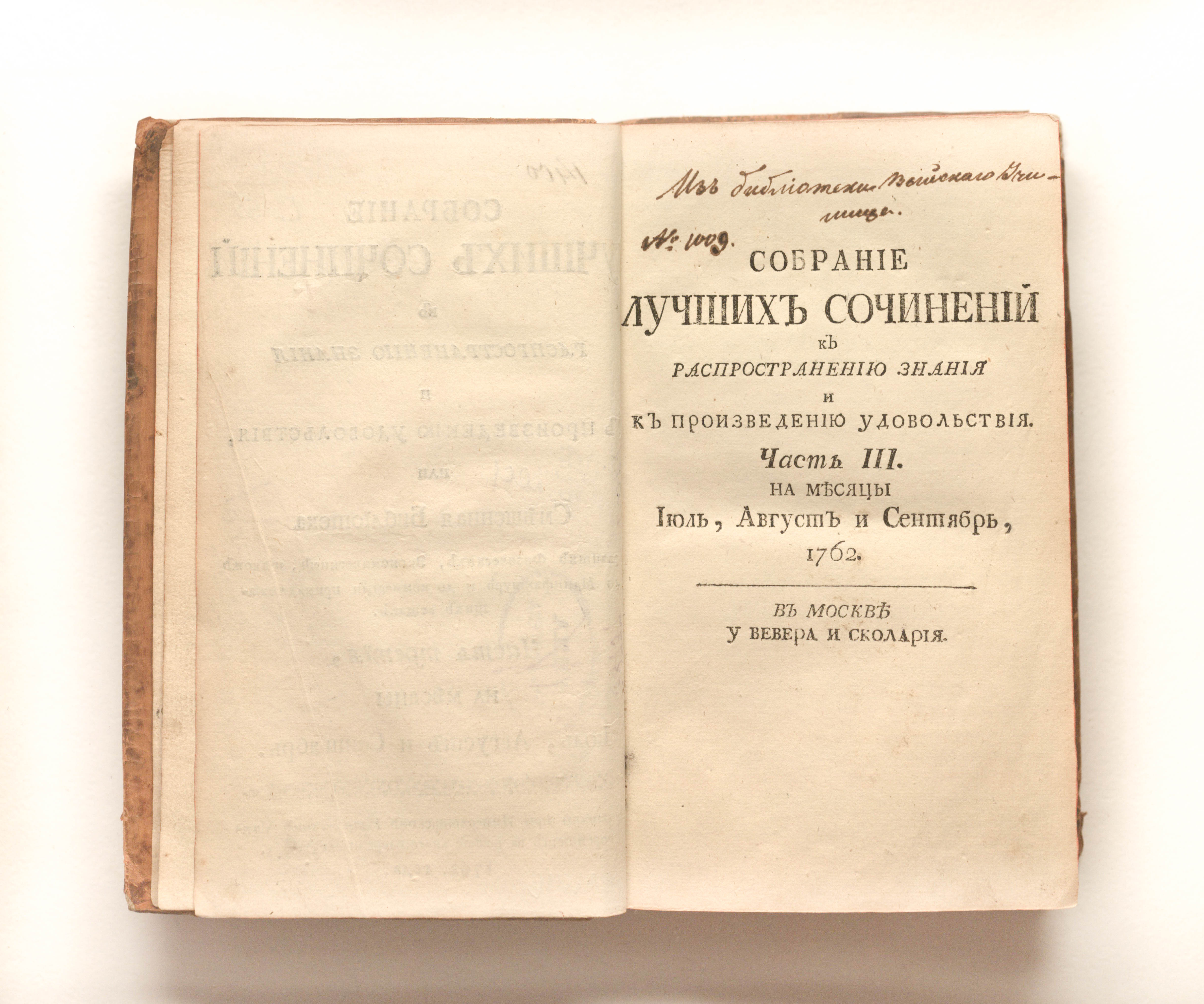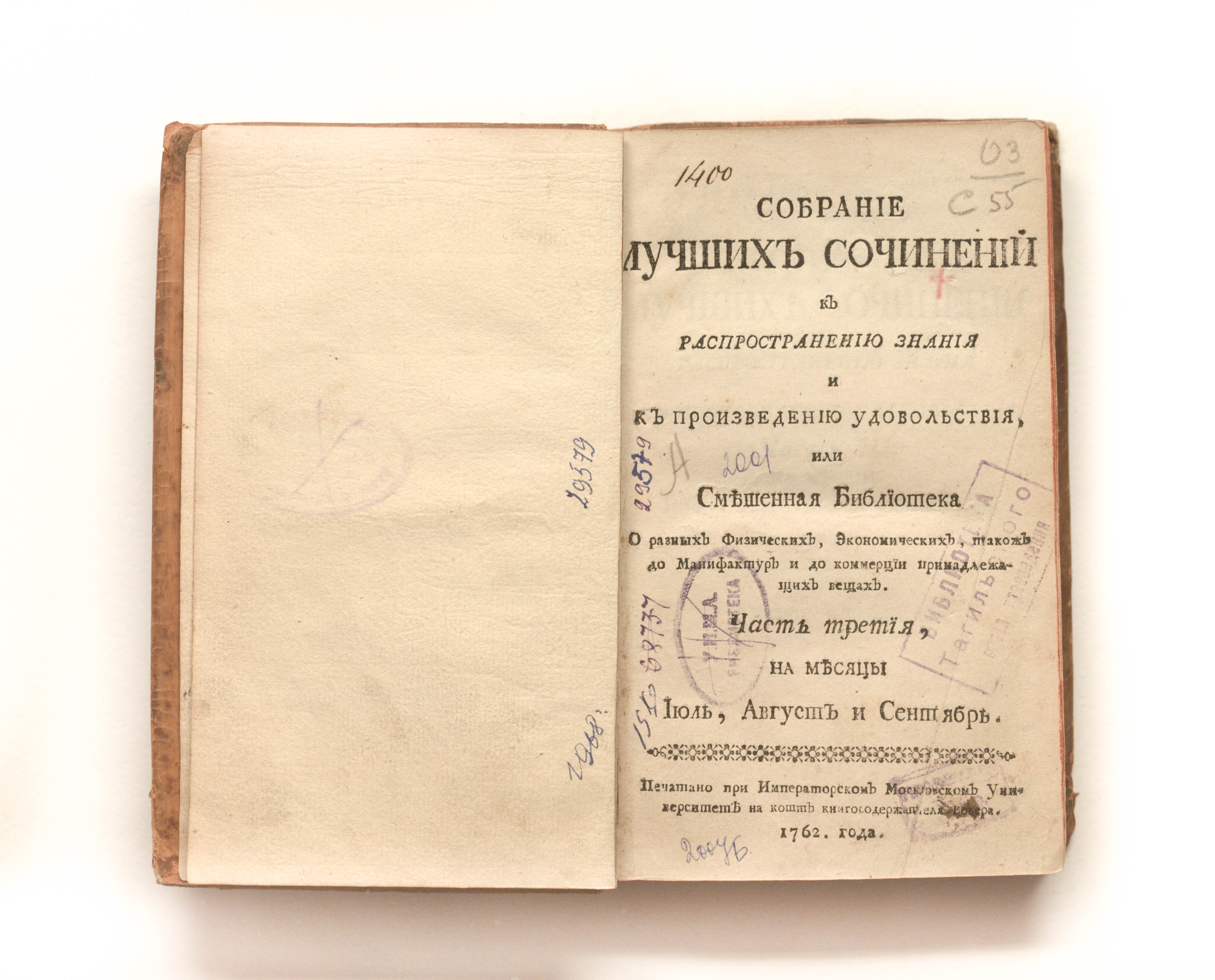 Собрание лучших сочинений к распространению знания и к произведению удовольствия, или Смешанная библиотека о разных физических, экономических, також до манифактур и до коммерции принадлежащих вещах. Часть третия, на месяцы июль, август, сентябрь. Часть четвертая, на месяцы октябрь, ноябрь, декабрь. — Москва : при Императорском Московском университете, 1762. — [4], 286 с. ; 19х12 см.