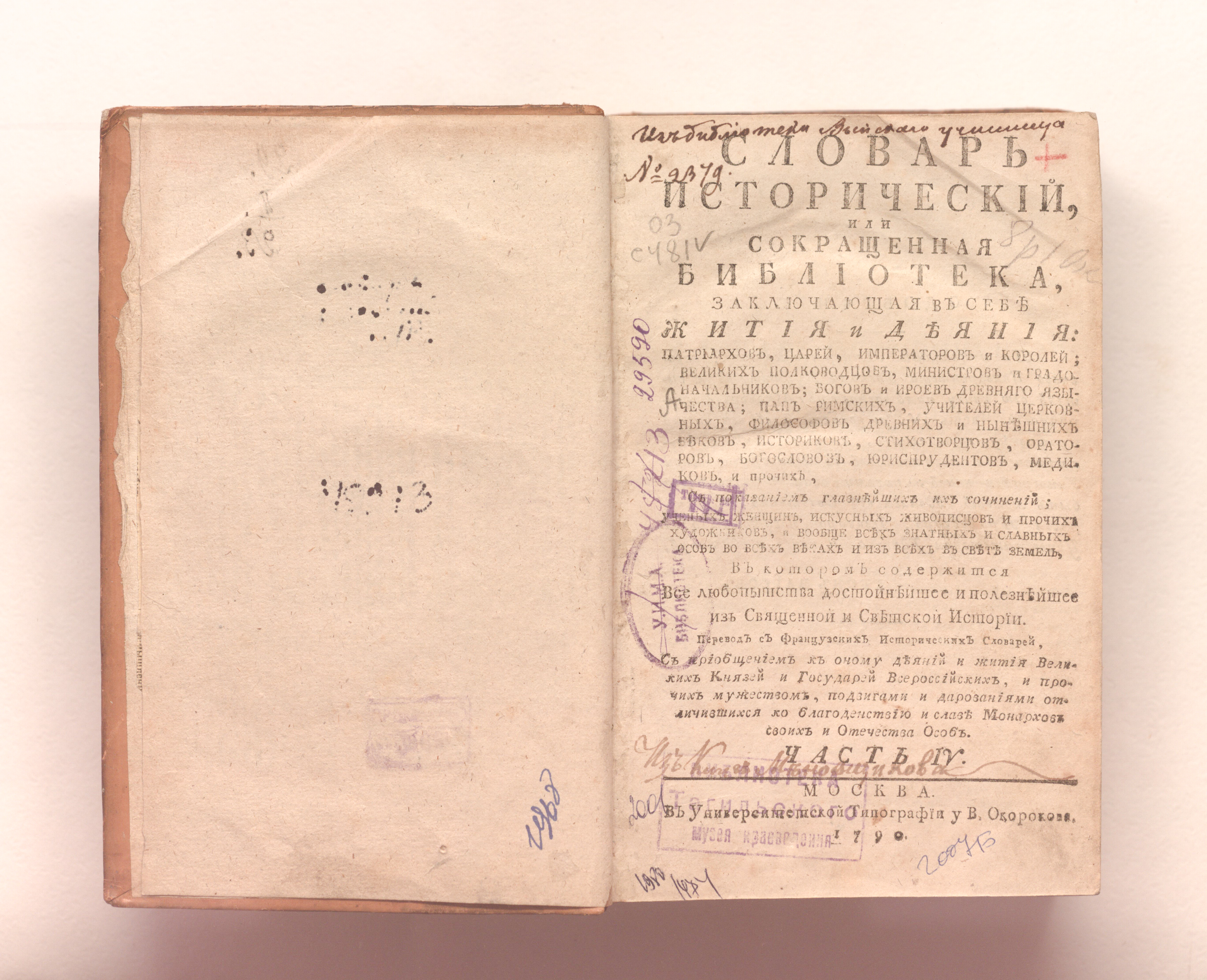 "Из библиотеки Выйскаго училища № 2379»(тит. л.); "Из книг Меновщикова»(тит. л.).