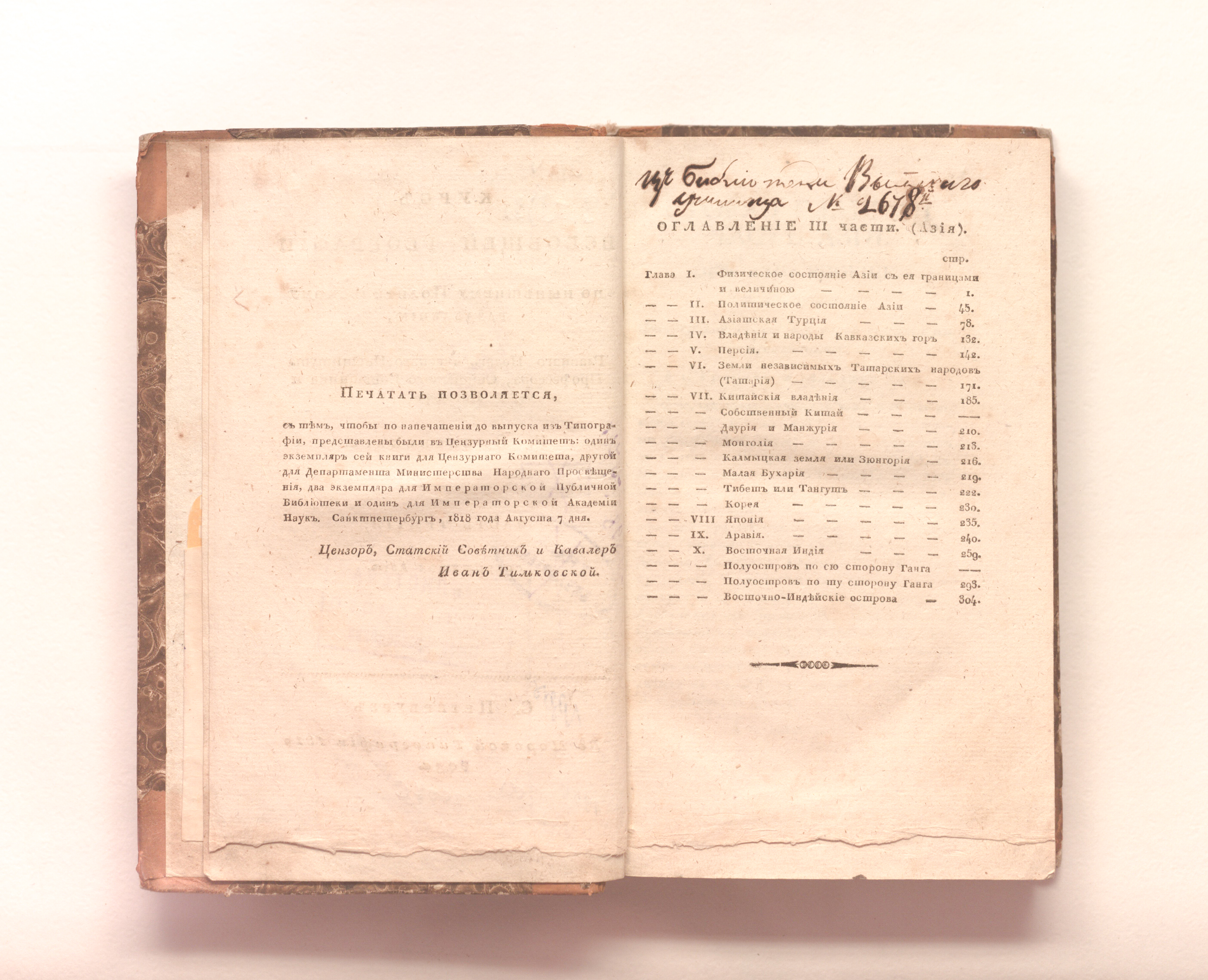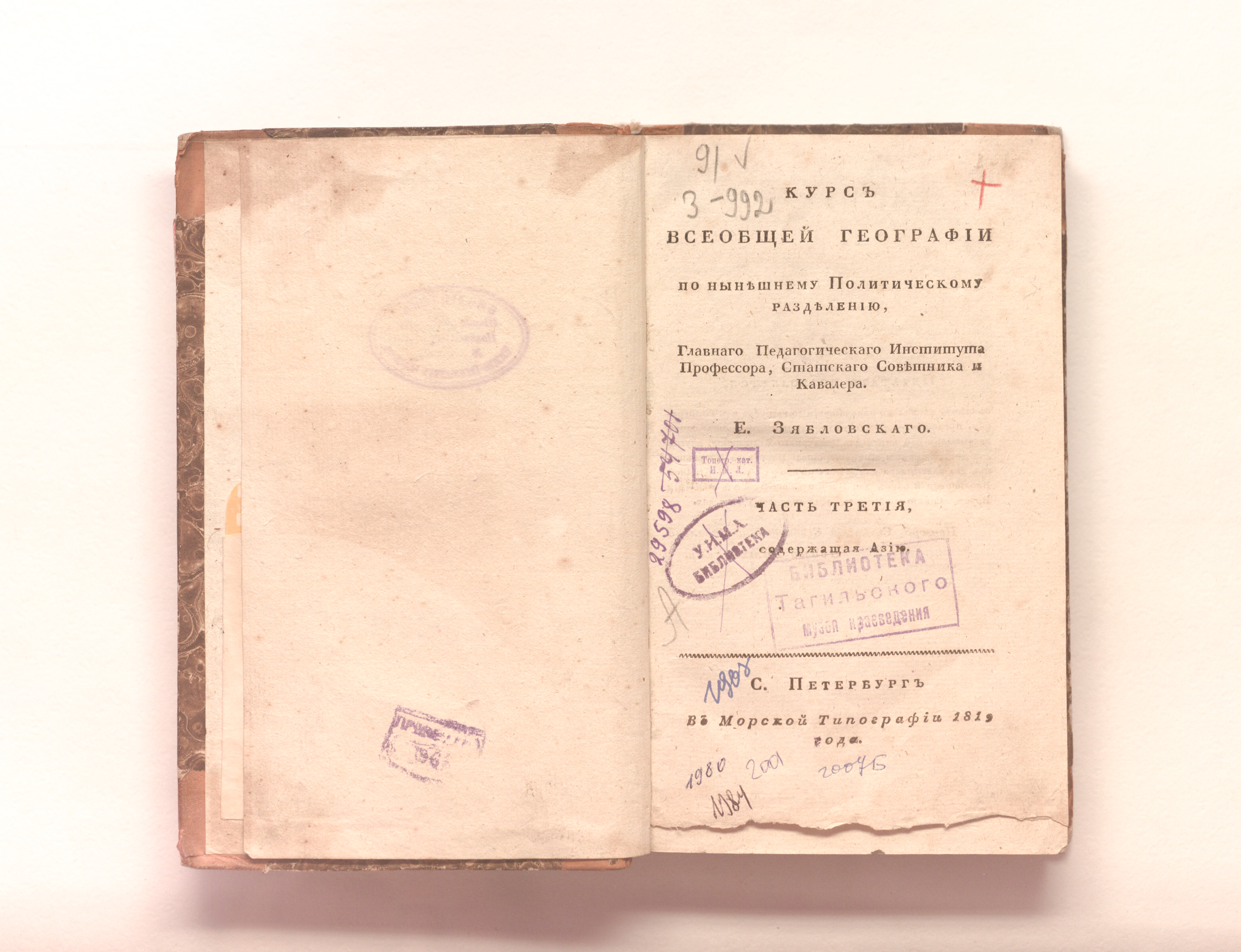 Зябловский, Евдоким Филиппович (1764-1846). Курс всеобщей географии по нынешнему политическому разделению / главнаго педагогическаго института профессора, статскаго советника и кавалера Е. Зябловскаго. – Ч. 3. Содержащая Азию. – Санкт-Петербург : в Морской типографии, 1819. – [3], 322 с. ; 21,5х13,5 см.