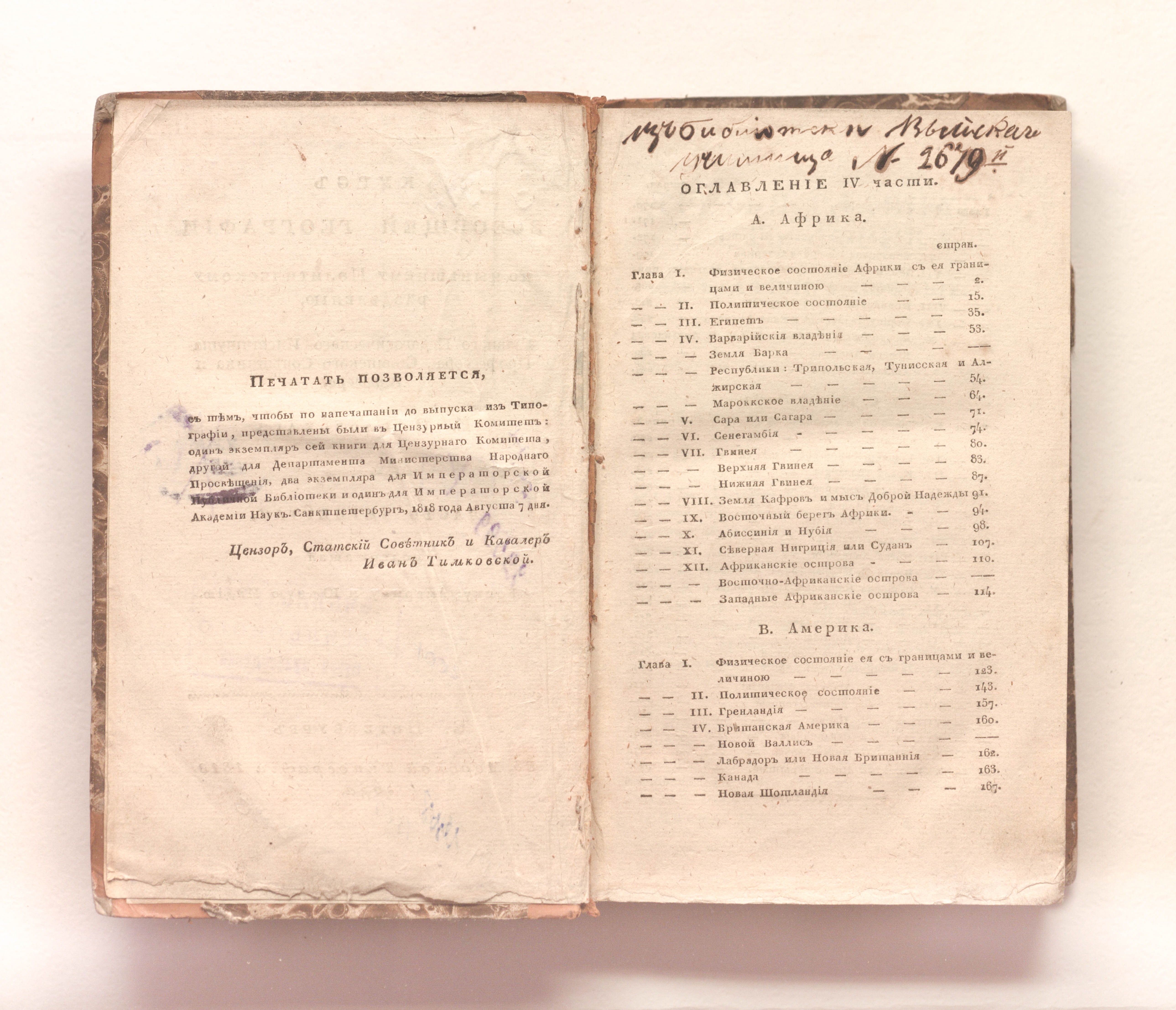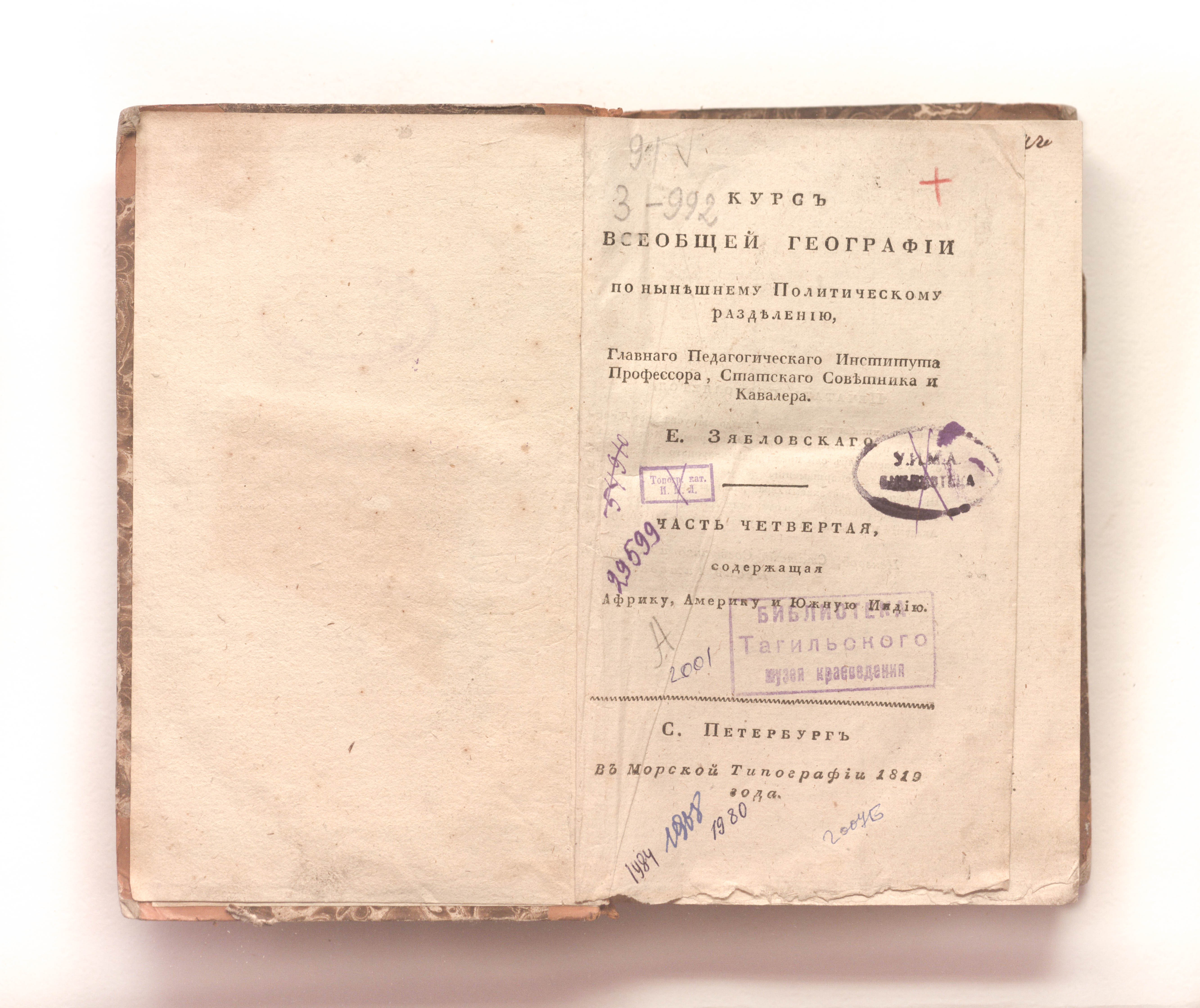 Зябловский, Евдоким Филиппович (1763-1846). Курс всеобщей географии по нынешнему политическому разделению. Ч. 4. Содержащая Африку, Америку и Южную Индию / главнаго педагогическаго института профессора, статскаго советника и кавалера Е. Зябловскаго. — Санкт-Петербург : в Морской типографии, 1819. — [4], 331 ; [7], 50 с. ; 21,5х13 см.