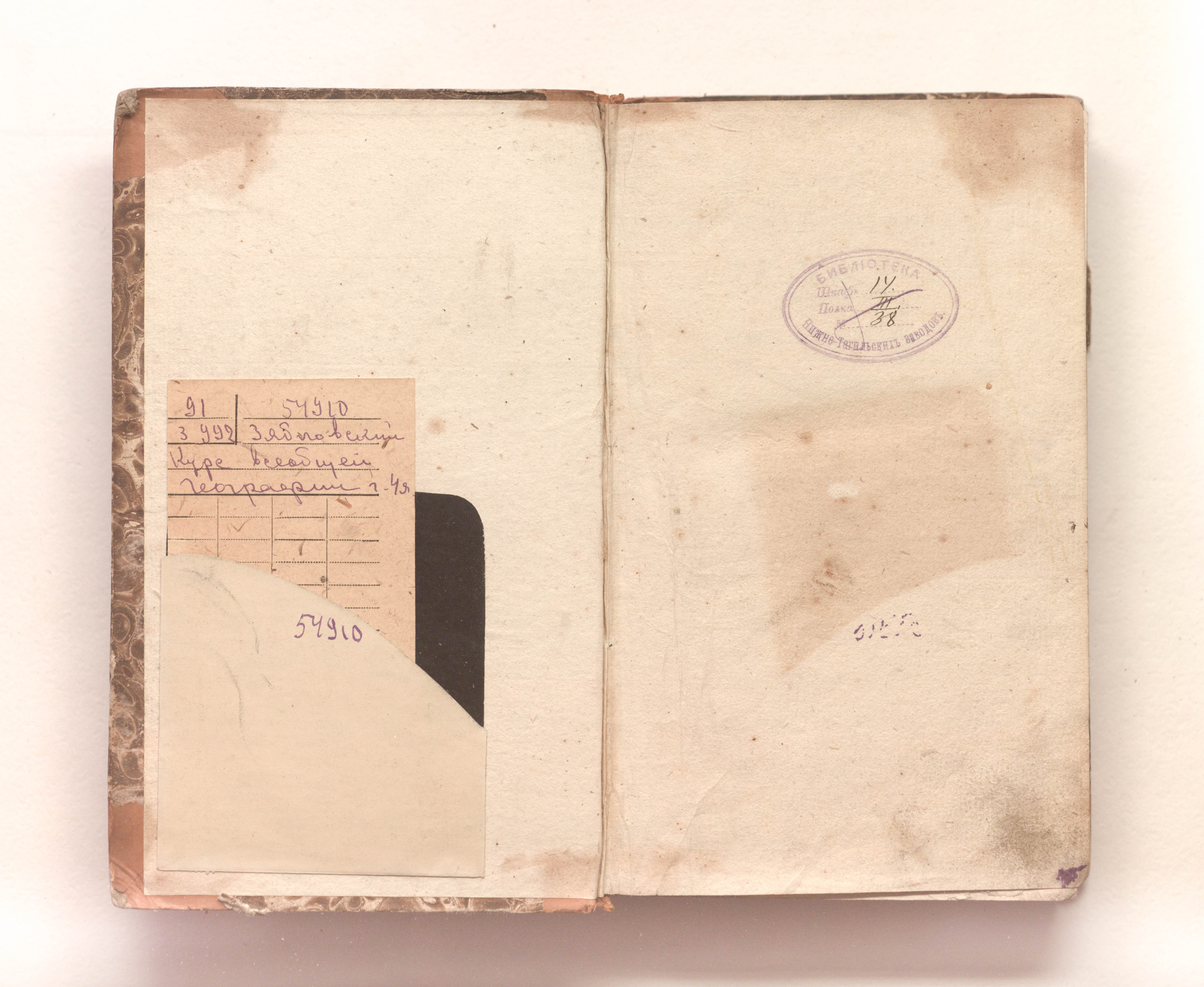 Штампы: «Библиотека Нижне-Тагильских заводов. Шкаф 14. Полка III. № 38» (форзац.); «У.И.М.Л. Библиотека» (тит. л.).