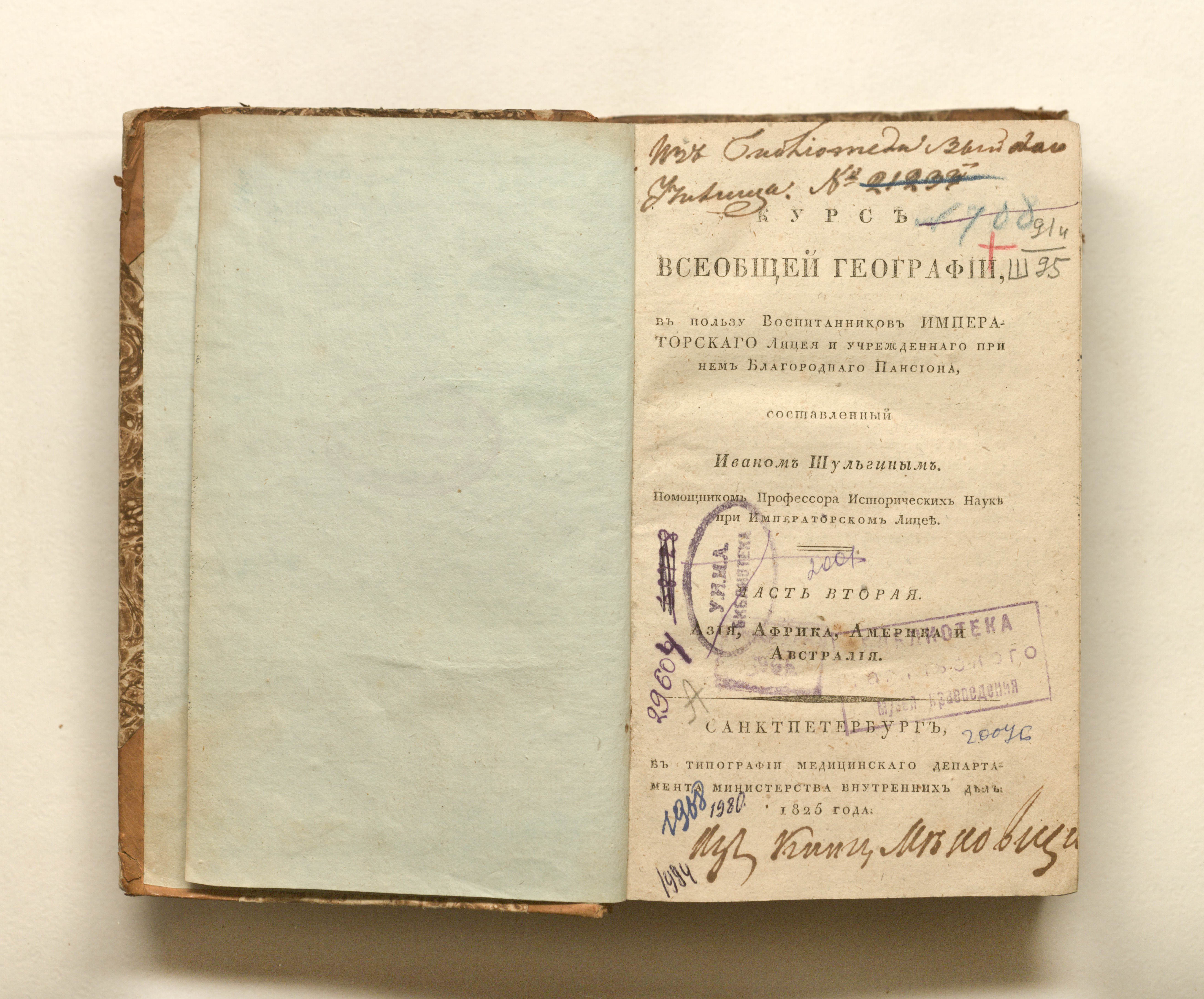 Шульгин, Иван Петрович (1795 - 1869). Курс всеобщей географии : пользу воспитанников Императорскаго лицея и учрежденнаго при нем Благороднаго пансиона / составленный Иваном Шульгиным, помощником профессора исторических наук при Императорском лицее. — Санкт-Петербург : в типографии Медицинского департамента Министерства внутренних дел, 1824-1825. ; 21х13 см.
