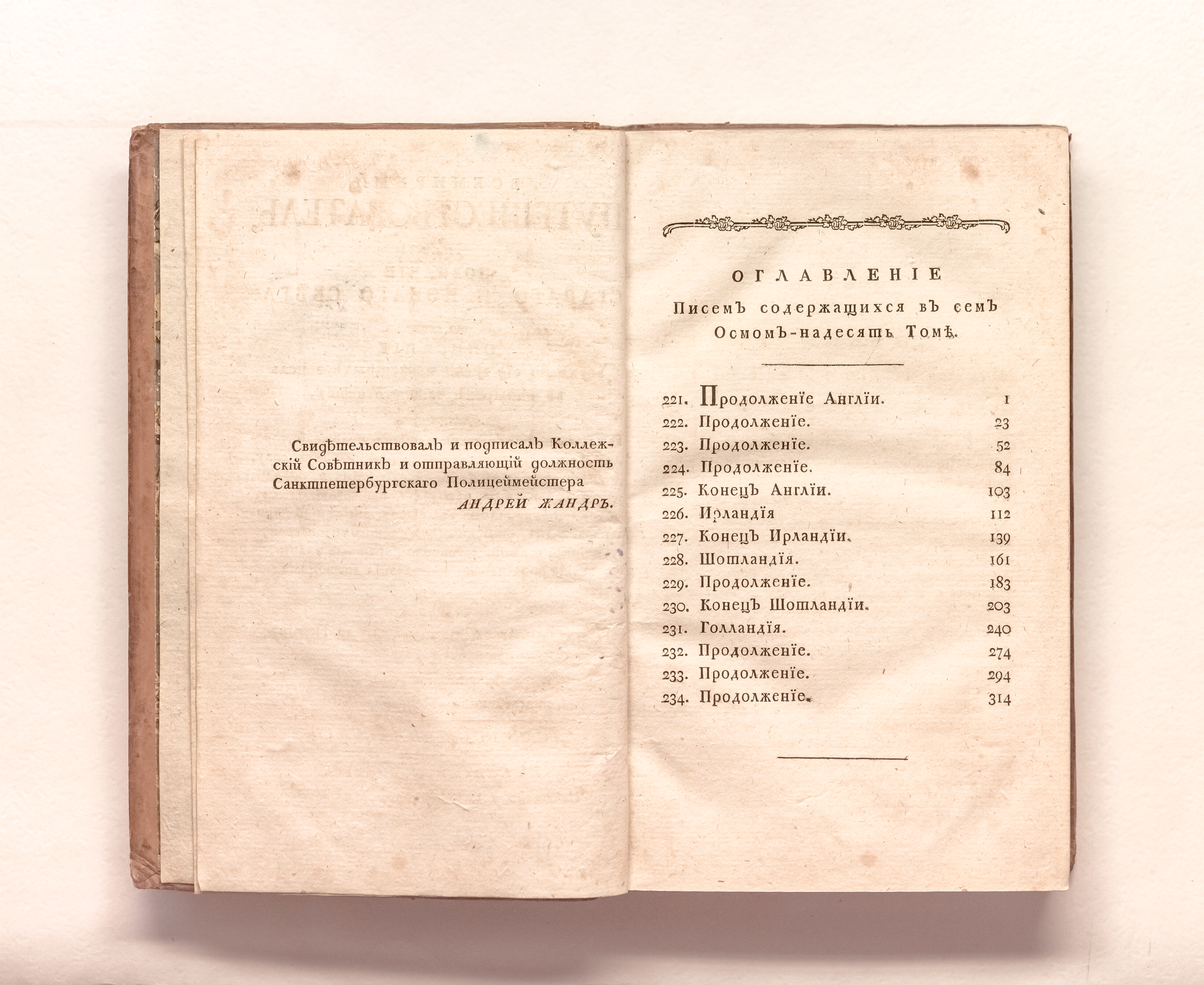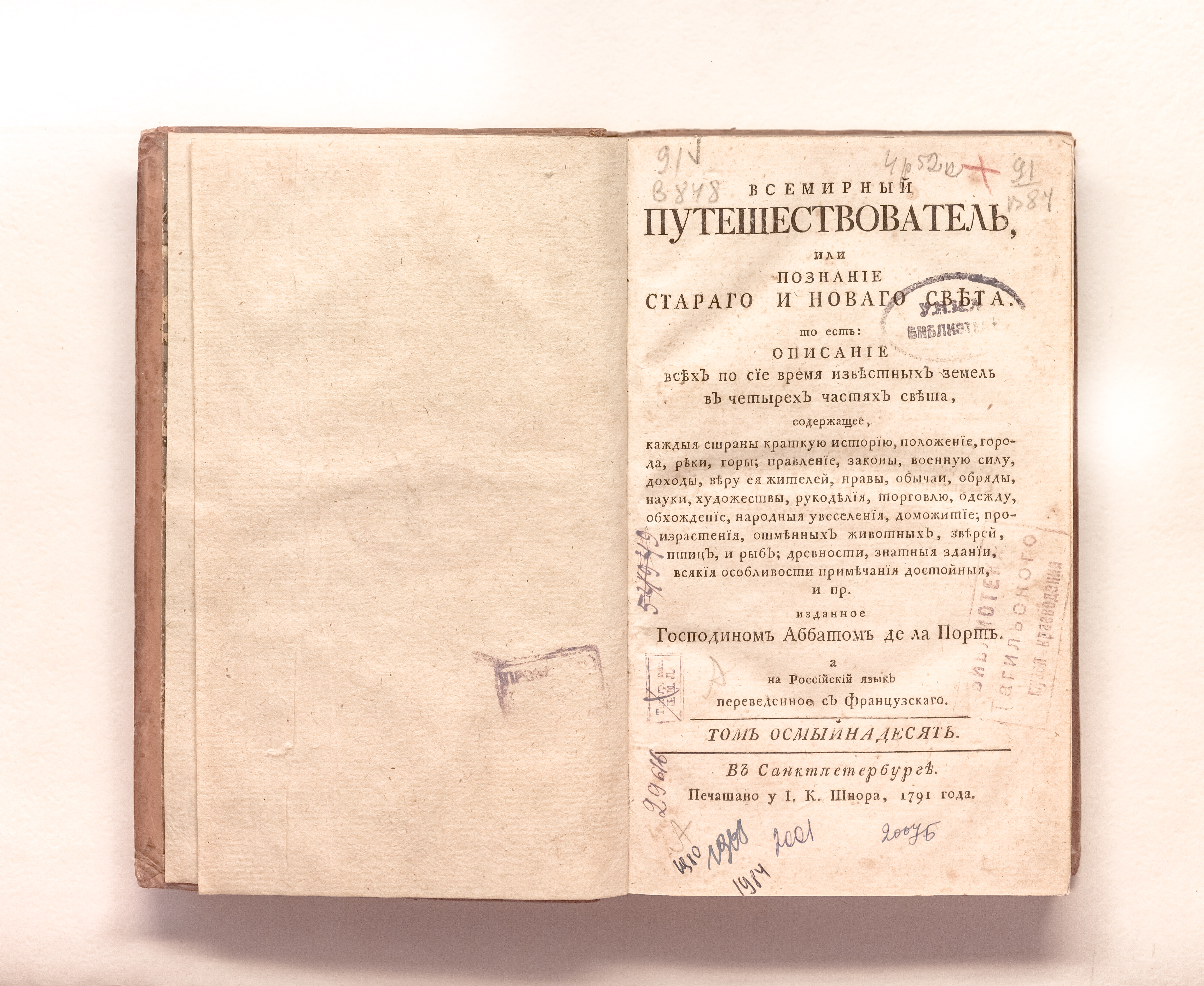 Ла Порт, Жозеф де (1713-1779). Всемирный путешествователь, или Познание Стараго и Новаго света, то есть: описание всех по сие время известных земель в четырех частях света, содержащее, каждыя страны краткую историю, положение, города, реки, горы; правление, законы, военную силу, доходы; веру ея жителей, нравы, обычаи, обряды, науки, художествы, рукоделия, торговлю, одежду, обхождение, народныя увеселения, доможитие, произрастения, отменных животных, зверей, птиц, и рыб; древности, знатныя здании, всякия особливости примечания достойныя и пр. / изданное господином аббатом де ла Порт ; а на российский язык переведенное с французскаго [Я. И. Булгаковым]. – Санкт-Петербург : печатано у I. К. Шнора, 1791. – Т. 18. – [2], 352 с. ; 21х13 см.