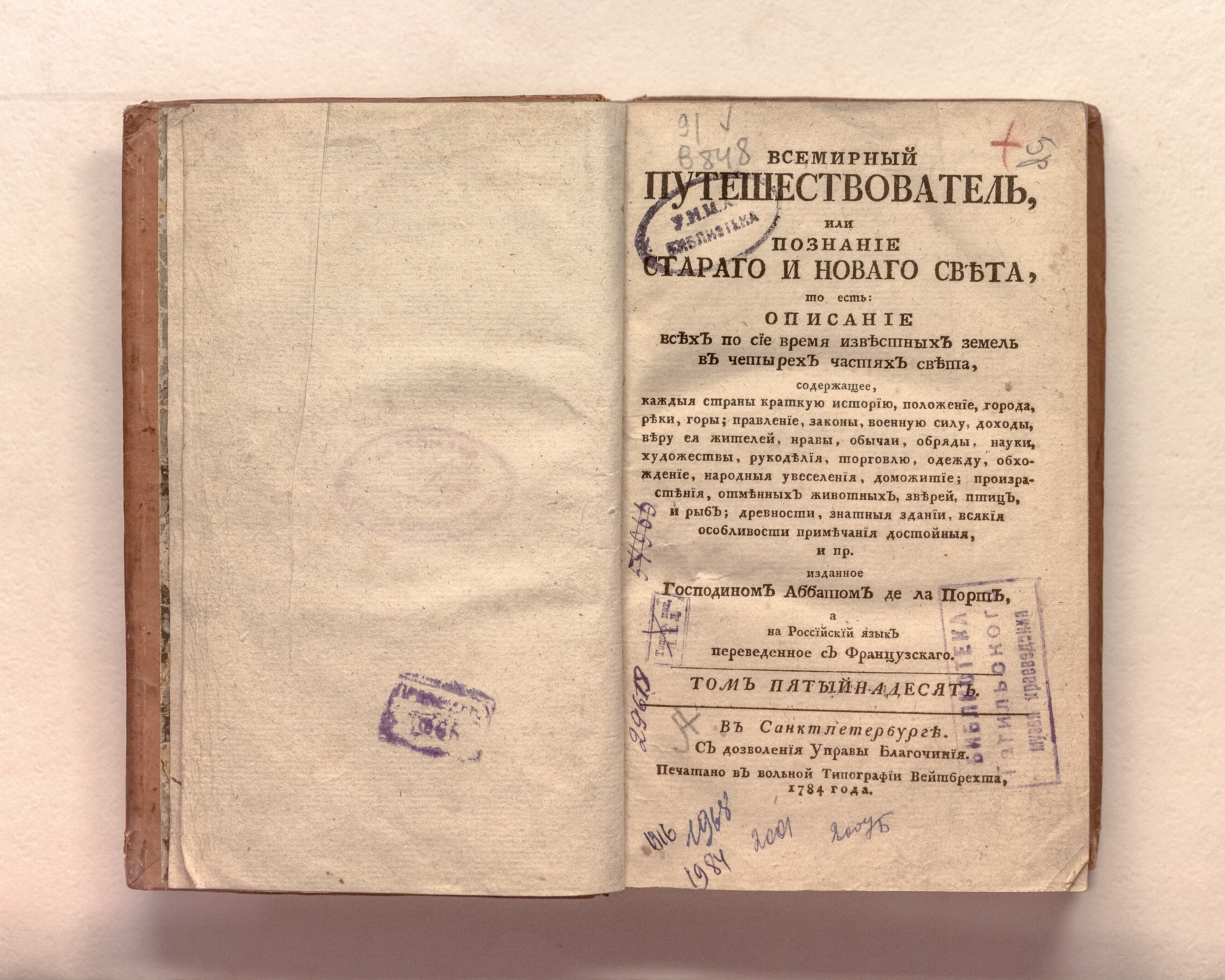 Ла Порт, Жозеф де (1713-1779). Всемирный путешествователь, или Познание Стараго и Новаго света, то есть: описание всех по сие время известных земель в четырех частях света, содержащее, каждыя страны краткую историю, положение, города, реки, горы; правление, законы, военную силу, доходы; веру ея жителей, нравы, обычаи, обряды, науки, художествы, рукоделия, торговлю, одежду, обхождение, народныя увеселения, доможитие, произрастения, отменных животных, зверей, птиц, и рыб; древности, знатныя здании, всякия особливости примечания достойныя и пр. / изданное господином аббатом де ла Порт ; а на российский язык переведенное с французскаго [Я. И. Булгаковым]. – 2-е изд. – Санкт-Петербург : тип. Вейтбрехта. 1780-1786.