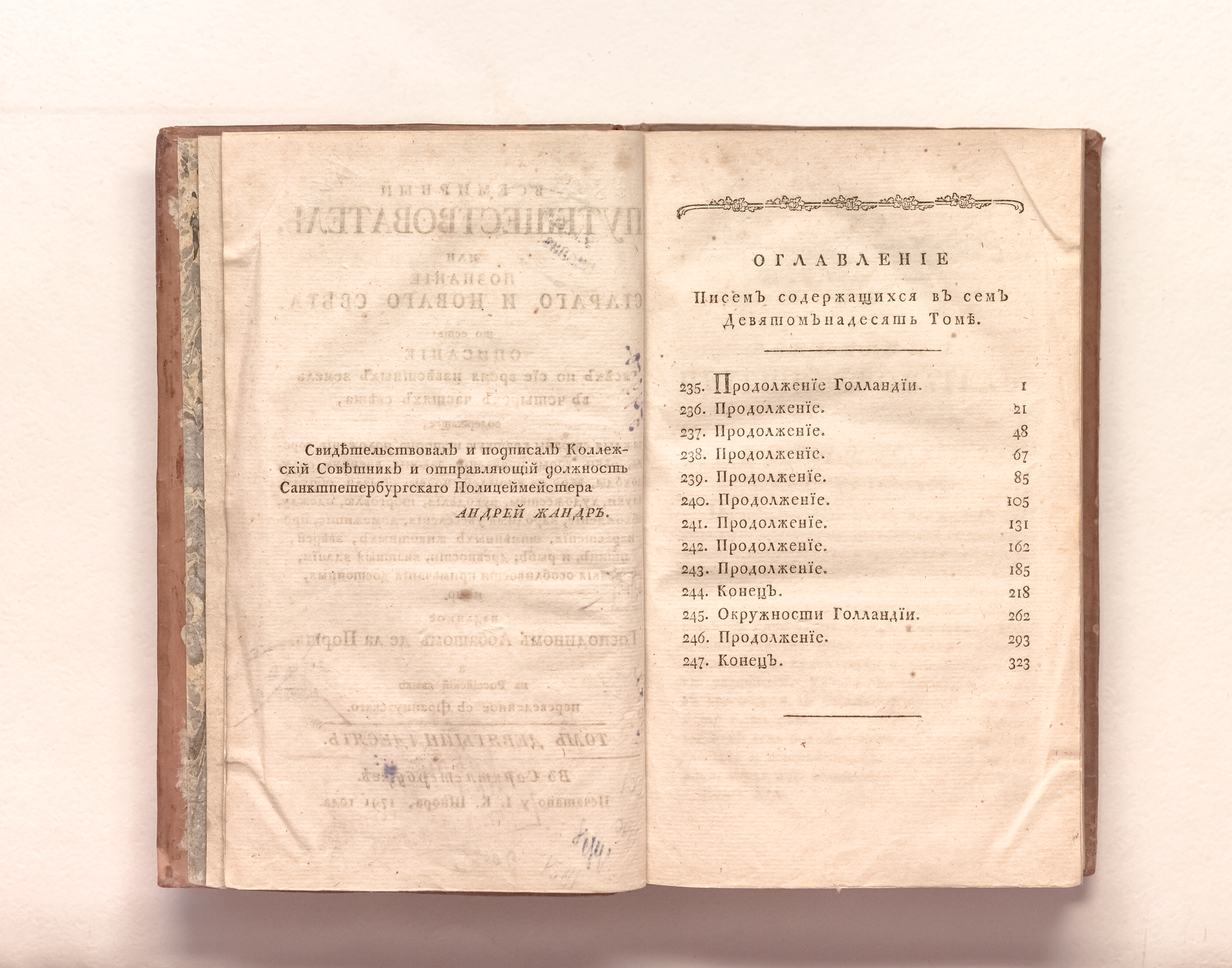 Ла Порт, Жозеф де (1713-1779). Всемирный путешествователь, или Познание Стараго и Новаго света, то есть: описание всех по сие время известных земель в четырех частях света, содержащее, каждыя страны краткую историю, положение, города, реки, горы; правление, законы, военную силу, доходы; веру ея жителей, нравы, обычаи, обряды, науки, художествы, рукоделия, торговлю, одежду, обхождение, народныя увеселения, доможитие, произрастения, отменных животных, зверей, птиц, и рыб; древности, знатныя здании, всякия особливости примечания достойныя и пр. / изданное господином аббатом де ла Порт ; а на российский язык переведенное с французскаго [Я. И. Булгаковым]. – Санкт-Петербург : печатано у I. К. Шнора, 1791. – Т. 19 – [2], 363 с. ; 21х13 см.