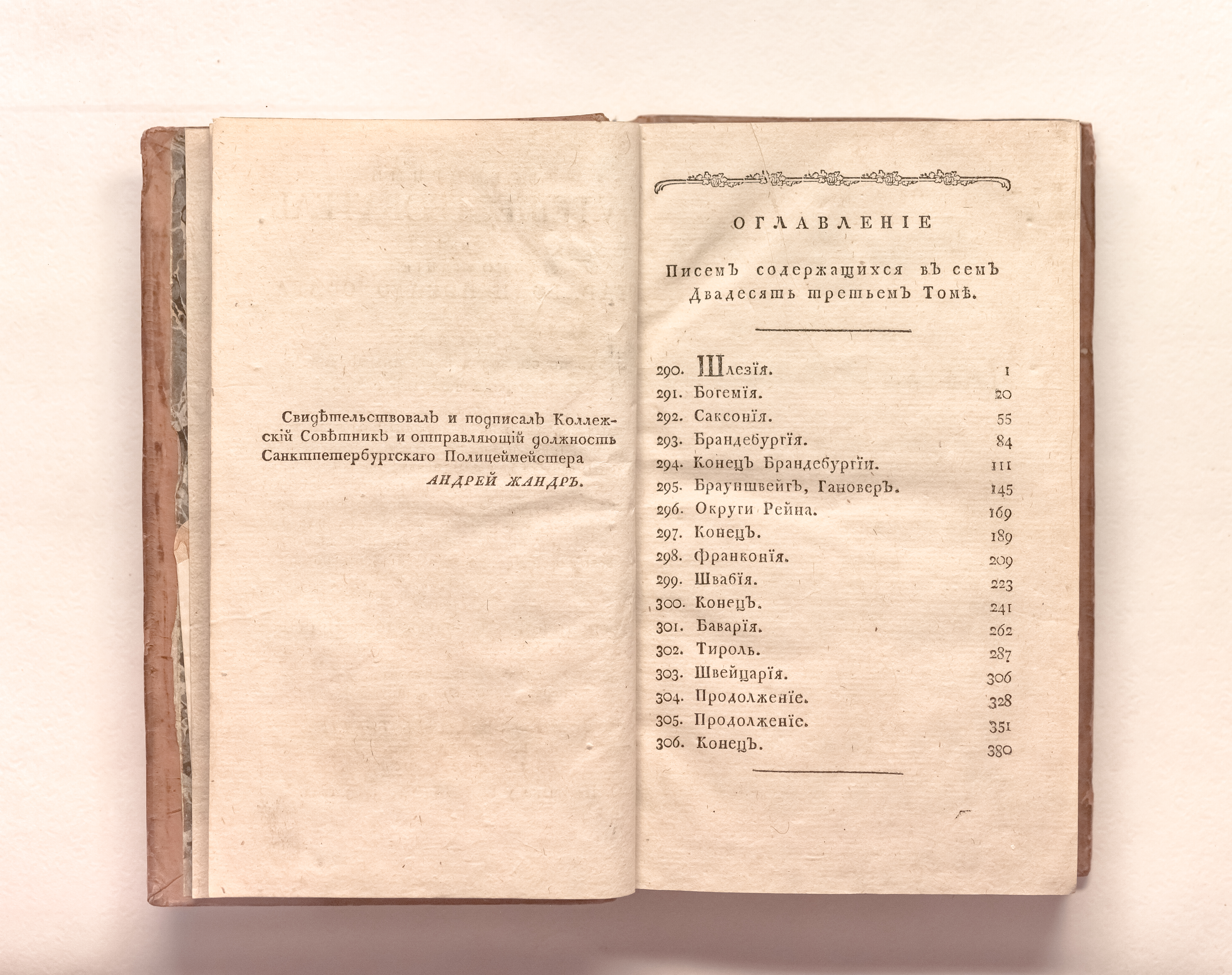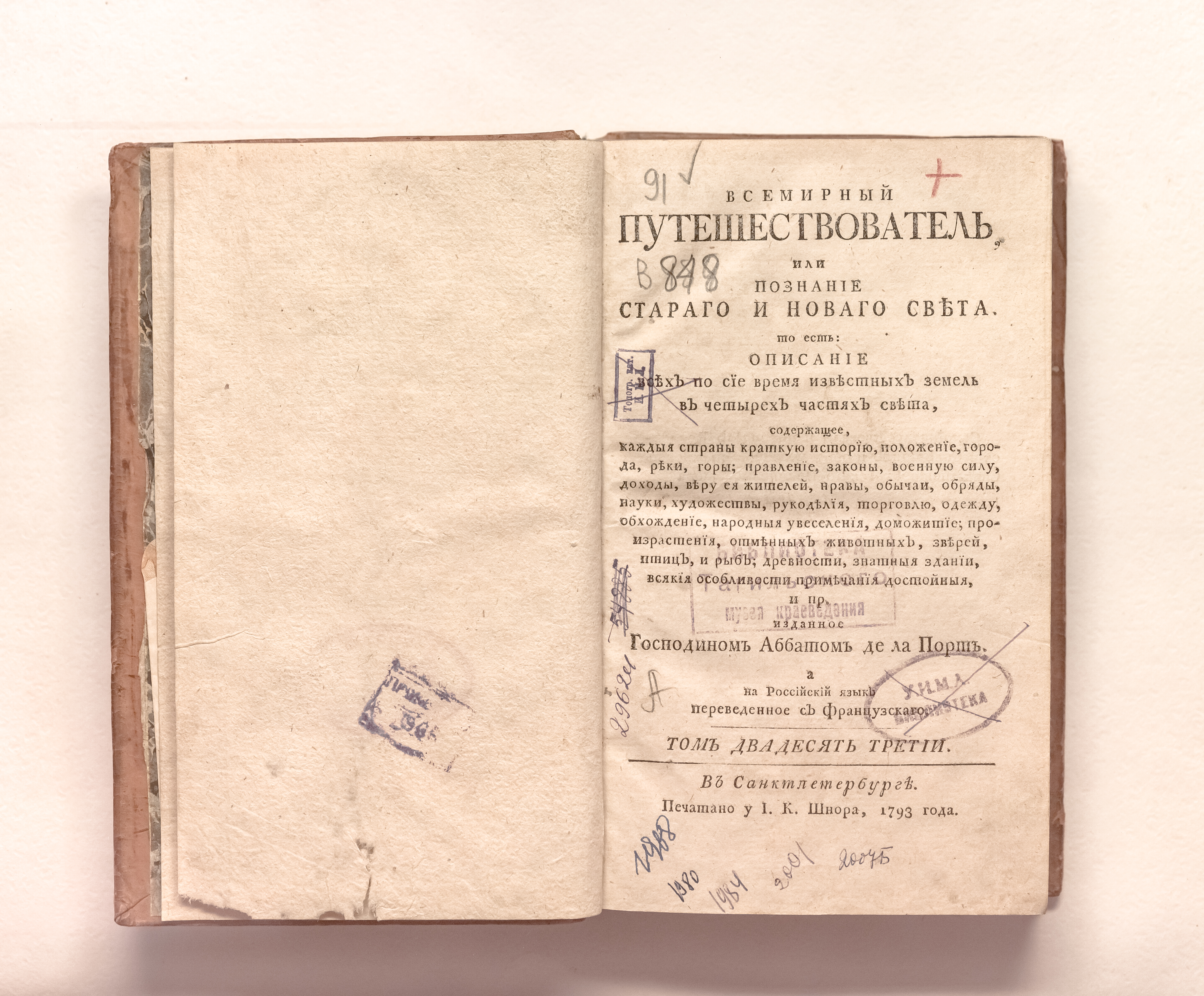 Ла Порт, Жозеф де (1713-1779). Всемирный путешествователь, или Познание Стараго и Новаго света, то есть: описание всех по сие время известных земель в четырех частях света, содержащее, каждыя страны краткую историю, положение, города, реки, горы; правление, законы, военную силу, доходы; веру ея жителей, нравы, обычаи, обряды, науки, художествы, рукоделия, торговлю, одежду, обхождение, народныя увеселения, доможитие, произрастения, отменных животных, зверей, птиц, и рыб; древности, знатныя здании, всякия особливости примечания достойныя и пр. / изданное господином аббатом де ла Порт ; а на российский язык переведенное с французскаго [Я. И. Булгаковым]. – Санкт-Петербург : печатано у I. К. Шнора, 1793. – Т. 23 – [2], 427 с. ; 21х13 см.