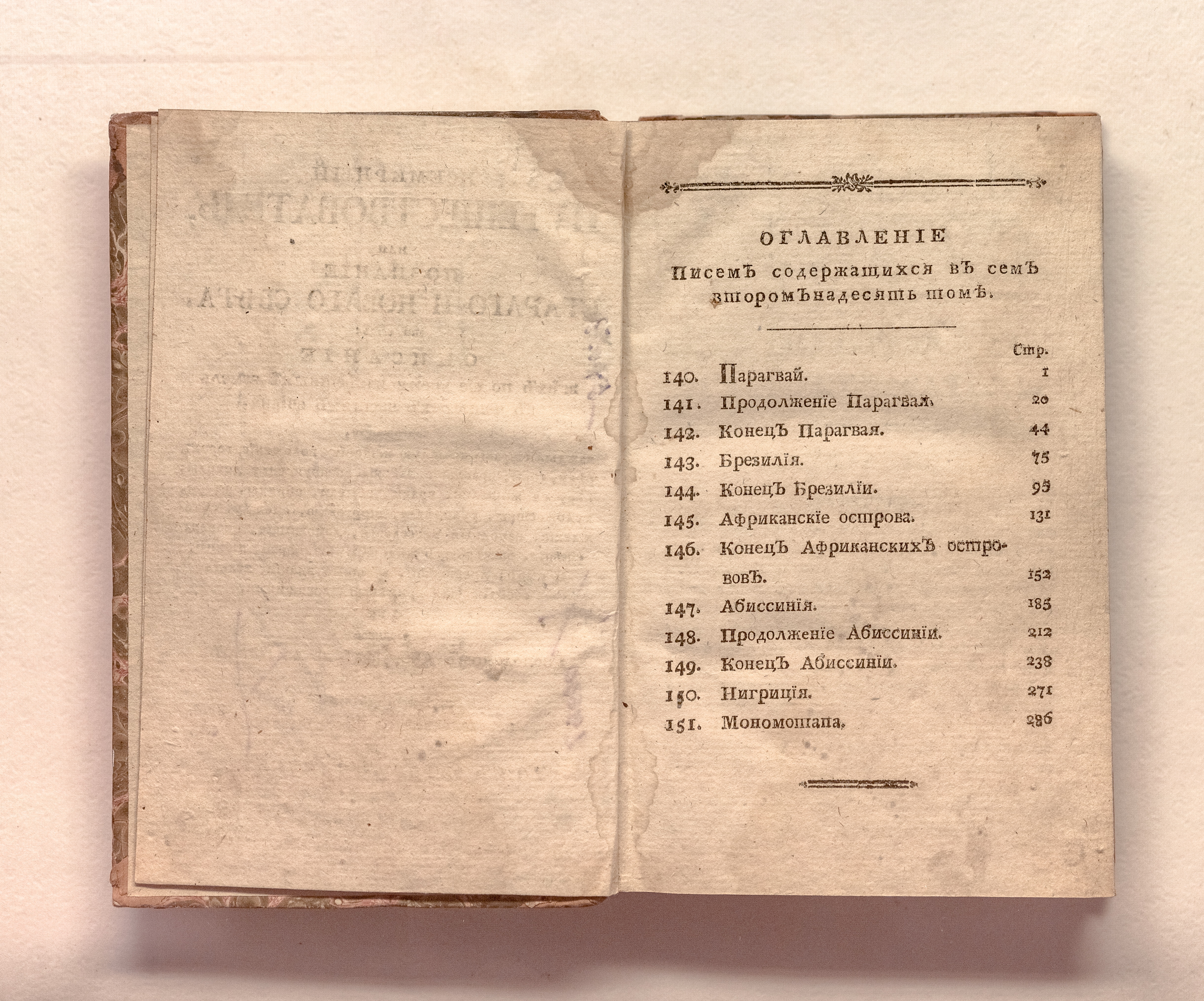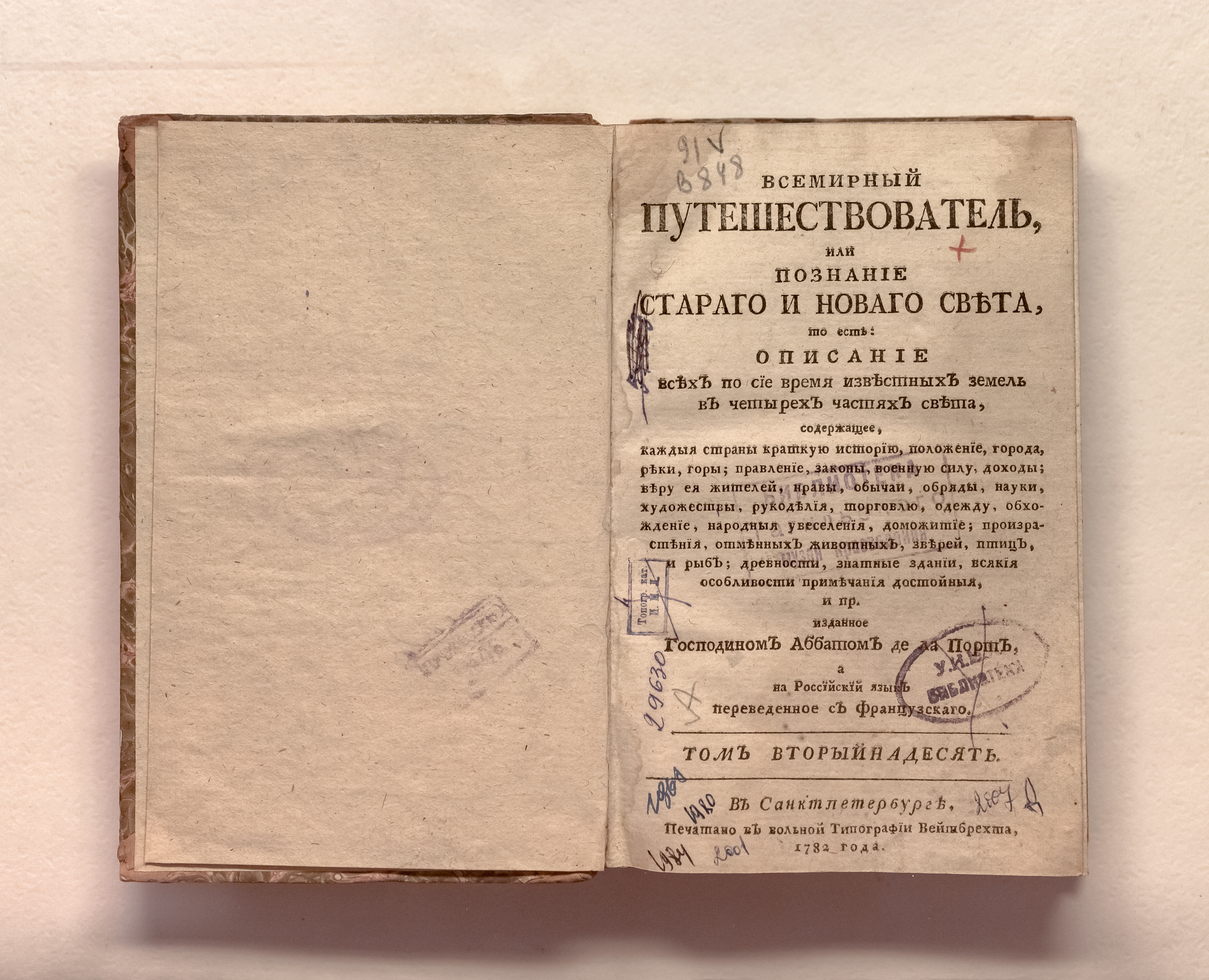 Ла Порт, Жозеф де (1713-1779). Всемирный путешествователь, или Познание Стараго и Новаго света, то есть: описание всех по сие время известных земель в четырех частях света, содержащее, каждыя страны краткую историю, положение, города, реки, горы; правление, законы, военную силу, доходы; веру ея жителей, нравы, обычаи, обряды, науки, художествы, рукоделия, торговлю, одежду, обхождение, народныя увеселения, доможитие, произрастения, отменных животных, зверей, птиц, и рыб; древности, знатныя здании, всякия особливости примечания достойныя и пр. / изданное господином аббатом де ла Порт ; а на российский язык переведенное с французскаго [Я. И. Булгаковым]. – 2-е изд. – Санкт-Петербург : тип. Вейтбрехта. 1780-1786.