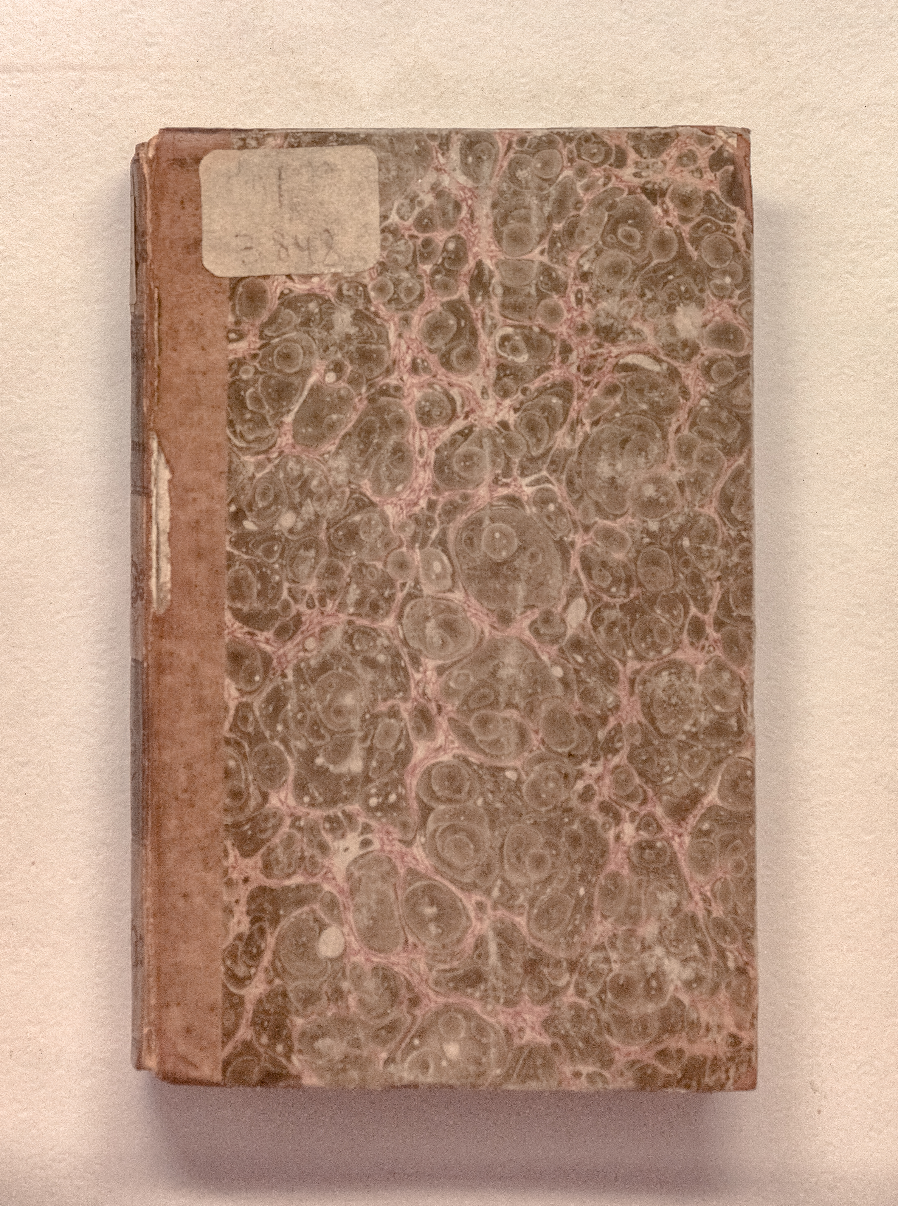 Книга в полукожаном владельческом переплете. Крышки переплета украшены бумагой с рисунком «под мрамор». Обрез тонированный. Бумага верже. Водяной знак (форзацы).