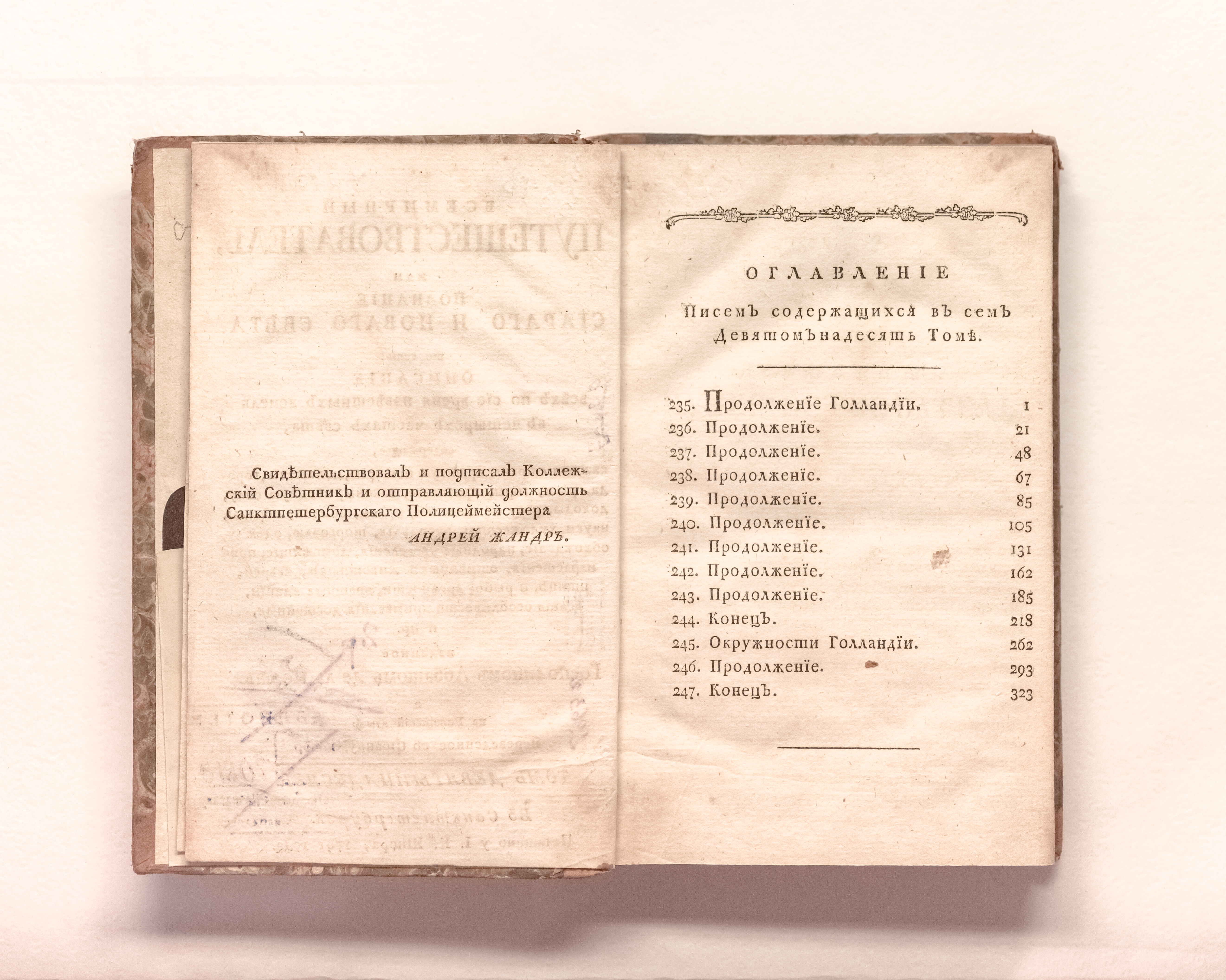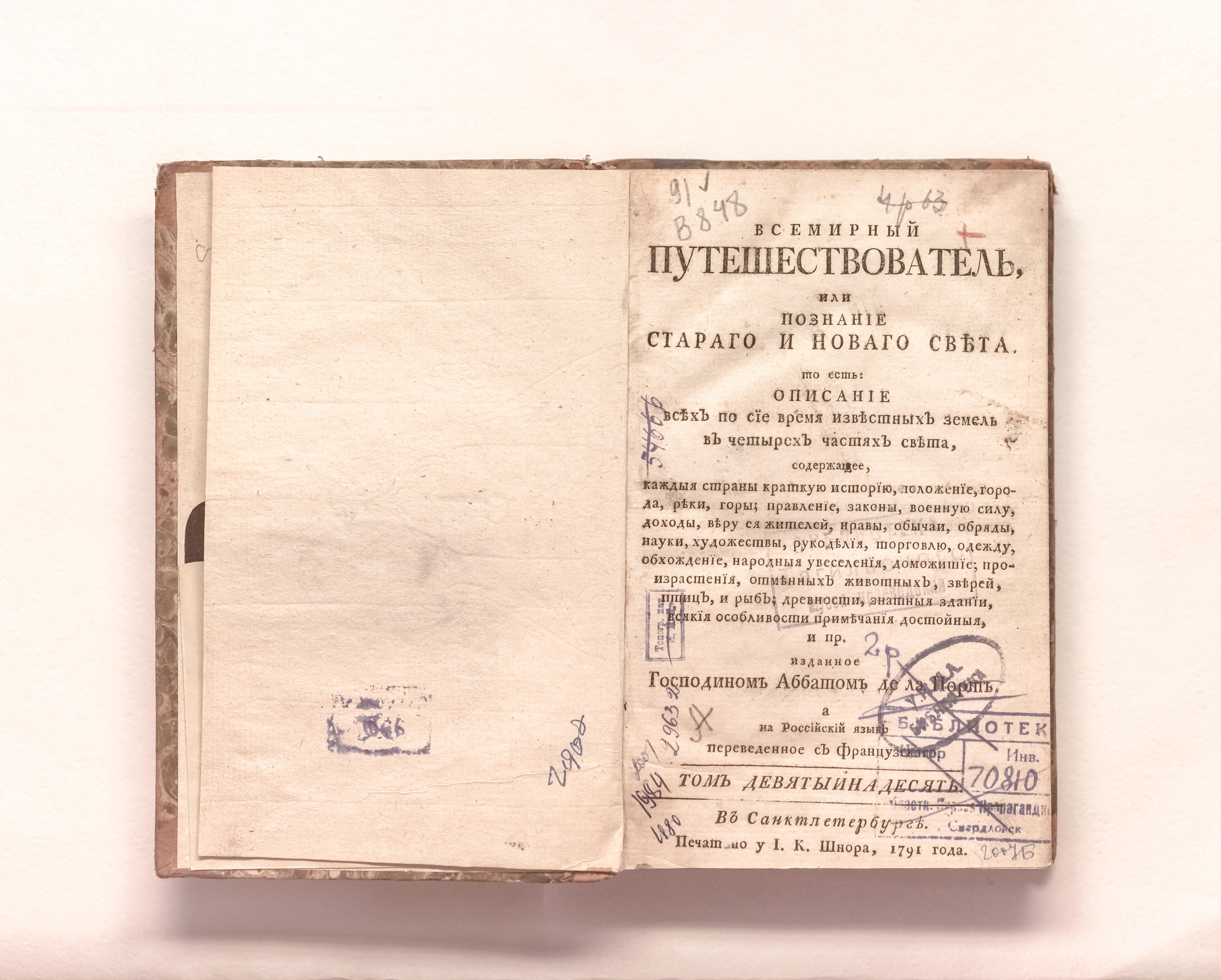 Ла Порт, Жозеф де (1713-1779). Всемирный путешествователь, или Познание Стараго и Новаго света, то есть: описание всех по сие время известных земель в четырех частях света, содержащее, каждыя страны краткую историю, положение, города, реки, горы; правление, законы, военную силу, доходы; веру ея жителей, нравы, обычаи, обряды, науки, художествы, рукоделия, торговлю, одежду, обхождение, народныя увеселения, доможитие, произрастения, отменных животных, зверей, птиц, и рыб; древности, знатныя здании, всякия особливости примечания достойныя и пр. / изданное господином аббатом де ла Порт ; а на российский язык переведенное с французскаго [Я. И. Булгаковым]. – Санкт-Петербург : печатано у I. К. Шнора, 1791. – Т. 19 – [2], 363 с. ; 19,5х13 см.