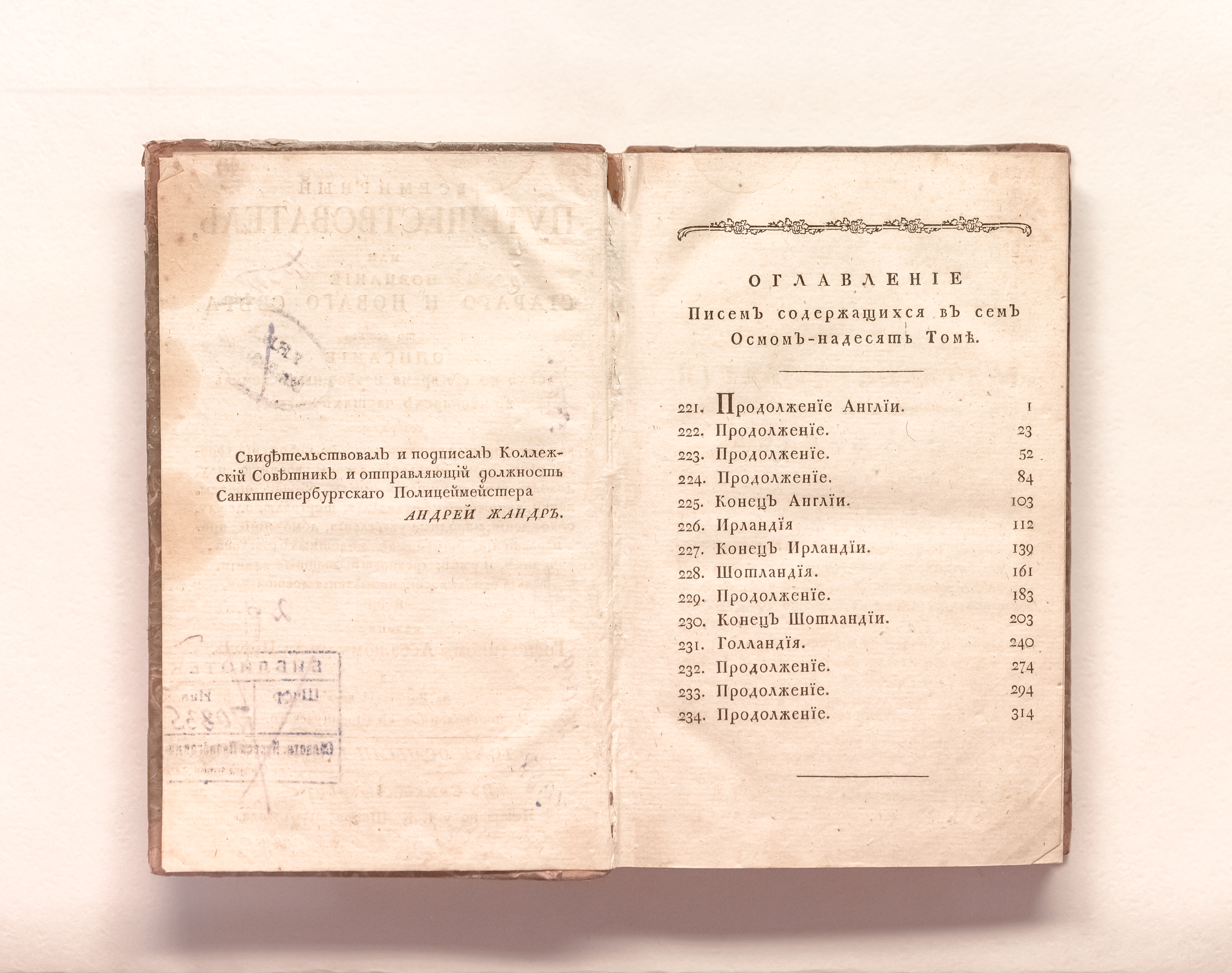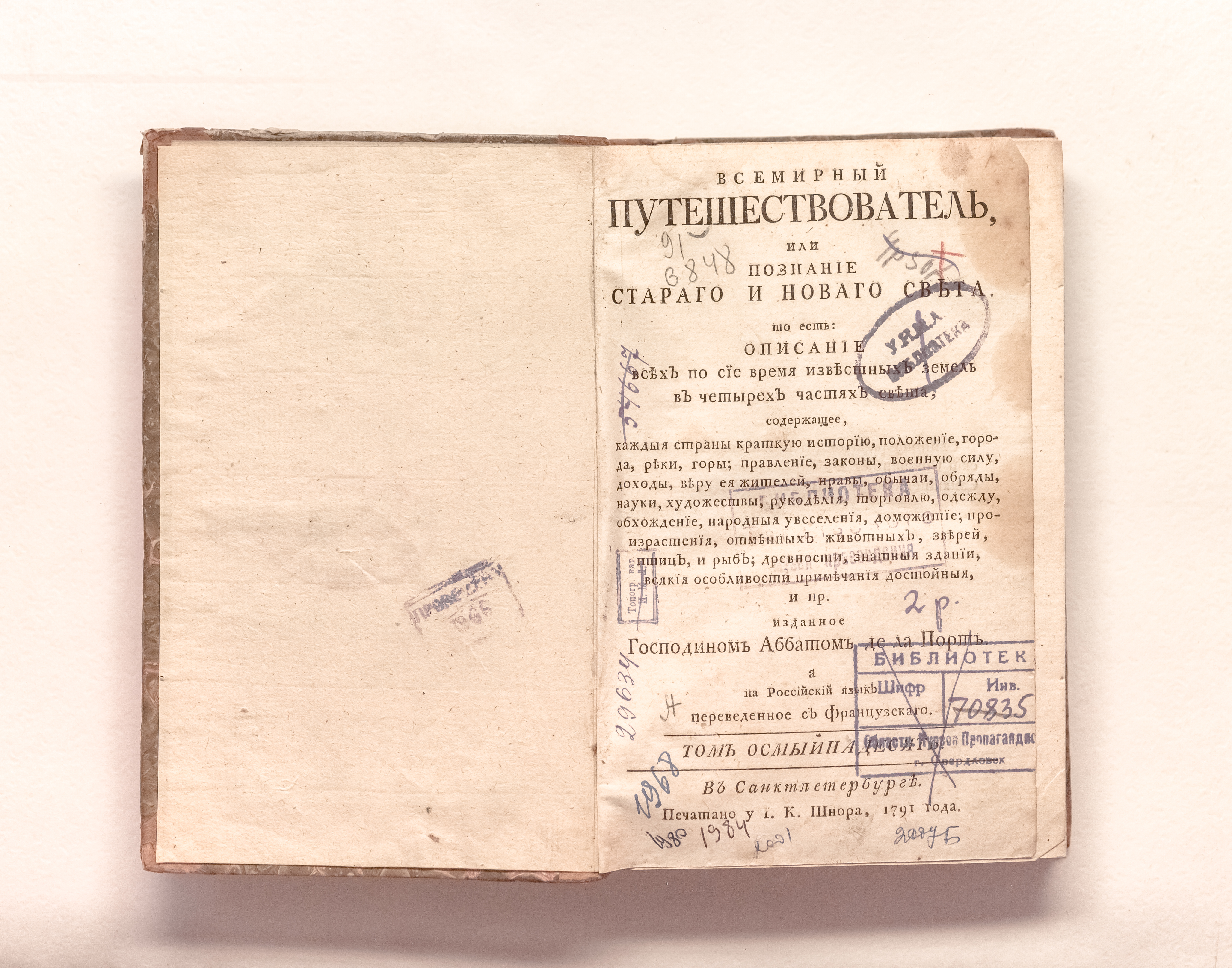 Ла Порт, Жозеф де (1713-1779). Всемирный путешествователь, или Познание Стараго и Новаго света, то есть: описание всех по сие время известных земель в четырех частях света, содержащее, каждыя страны краткую историю, положение, города, реки, горы; правление, законы, военную силу, доходы; веру ея жителей, нравы, обычаи, обряды, науки, художествы, рукоделия, торговлю, одежду, обхождение, народныя увеселения, доможитие, произрастения, отменных животных, зверей, птиц, и рыб; древности, знатныя здании, всякия особливости примечания достойныя и пр. / изданное господином аббатом де ла Порт ; а на российский язык переведенное с французскаго [Я. И. Булгаковым]. – Санкт-Петербург : печатано у I. К. Шнора, 1791. – Т. 18 – [2], 352 с. ; 19,5х13 см.