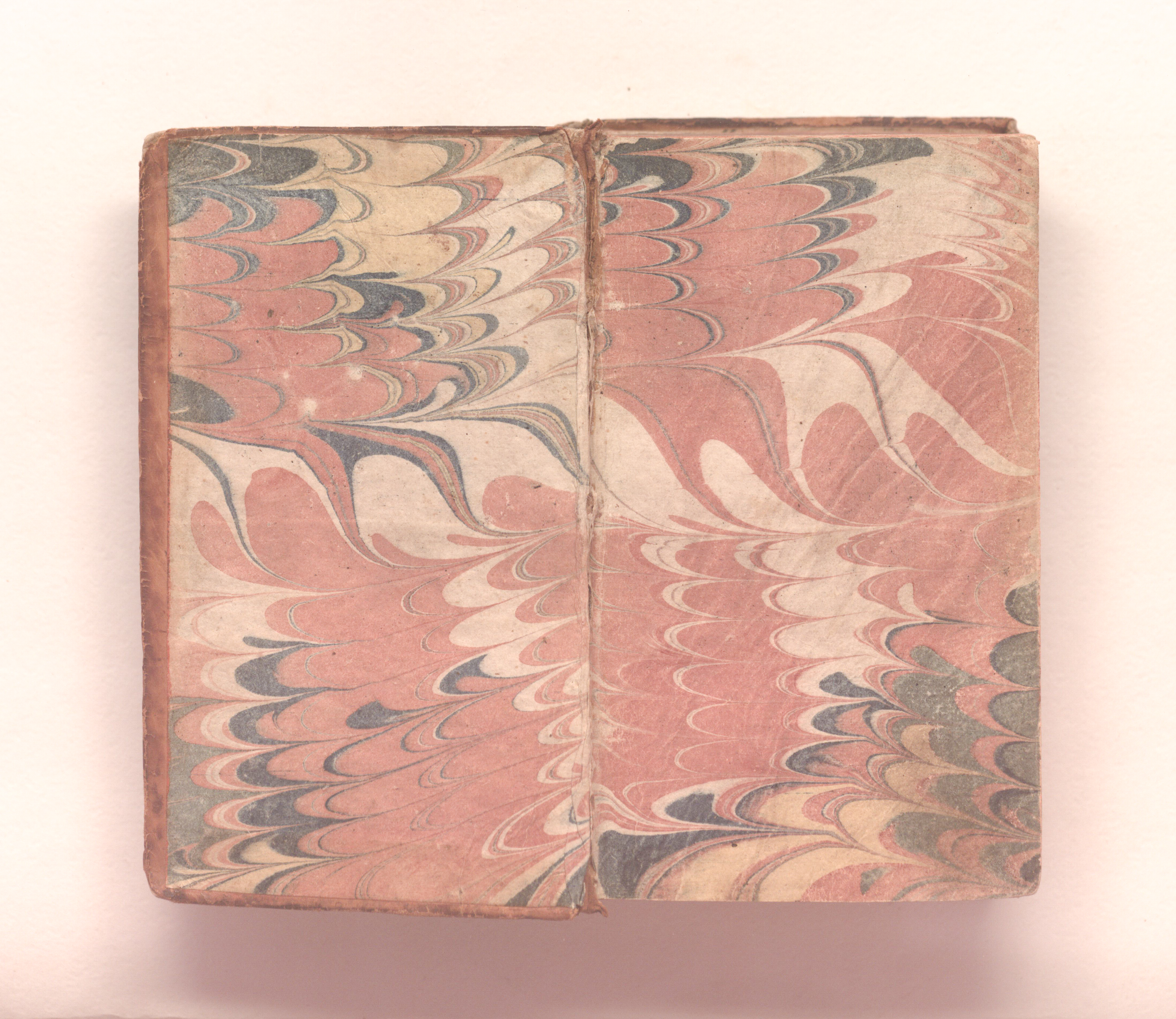 Книга в цельнокожаном владельческом переплете. Форзацы украшены бумагой с рисунком «под мрамор». Обрез тонированный. Бумага верже.