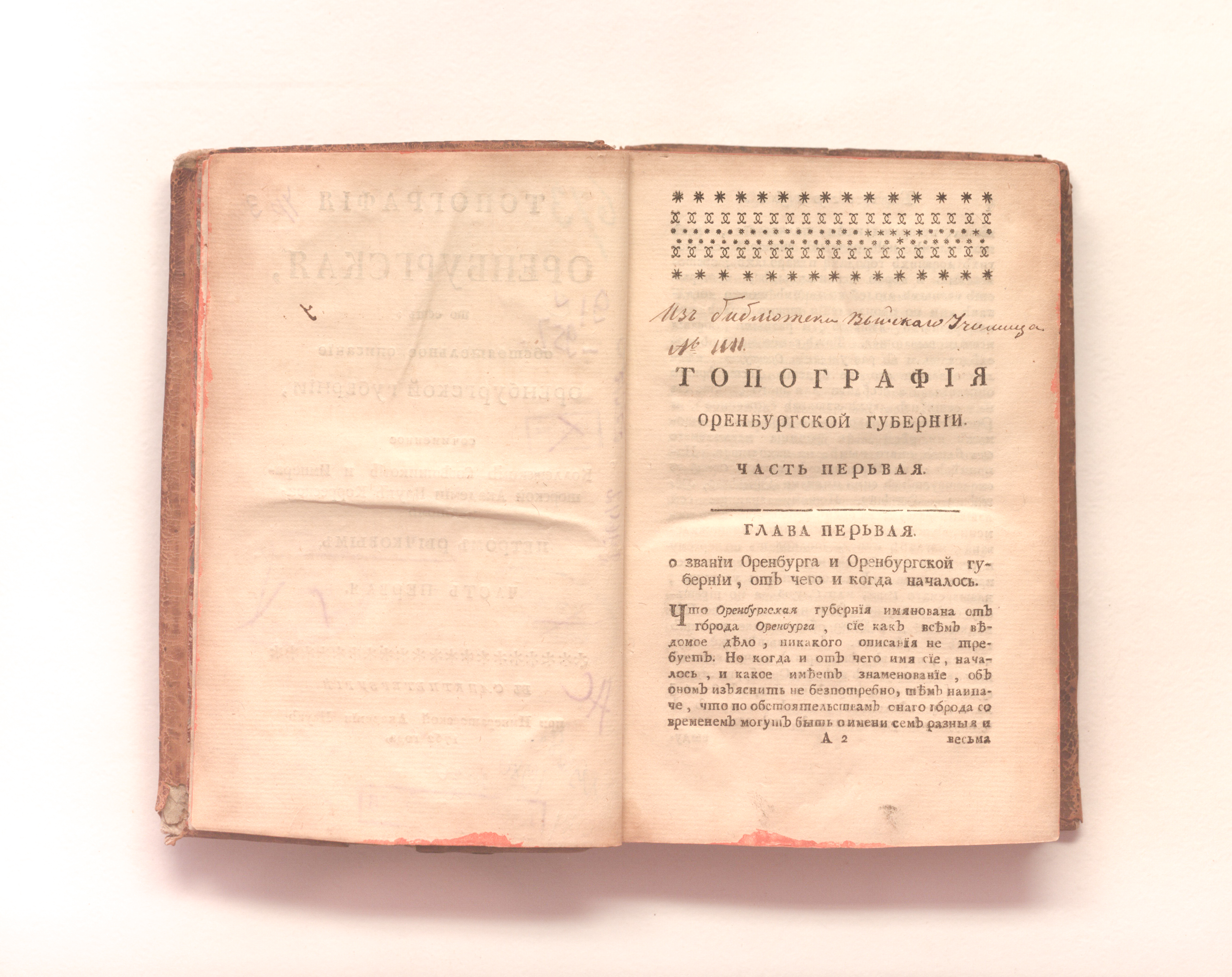 Рычков, Петр Иванович (1712-1777). Топография оренбургская, то есть: обстоятельное описание Оренбургской губернии / сочиненное коллежским советником и Императорской Академии наук корреспондентом Петром Рычковым. – Ч. 1. – Санкт-Петербург : При Имп. Акад. наук, 1762. – 331 с. ; 18,5х12,5 см.