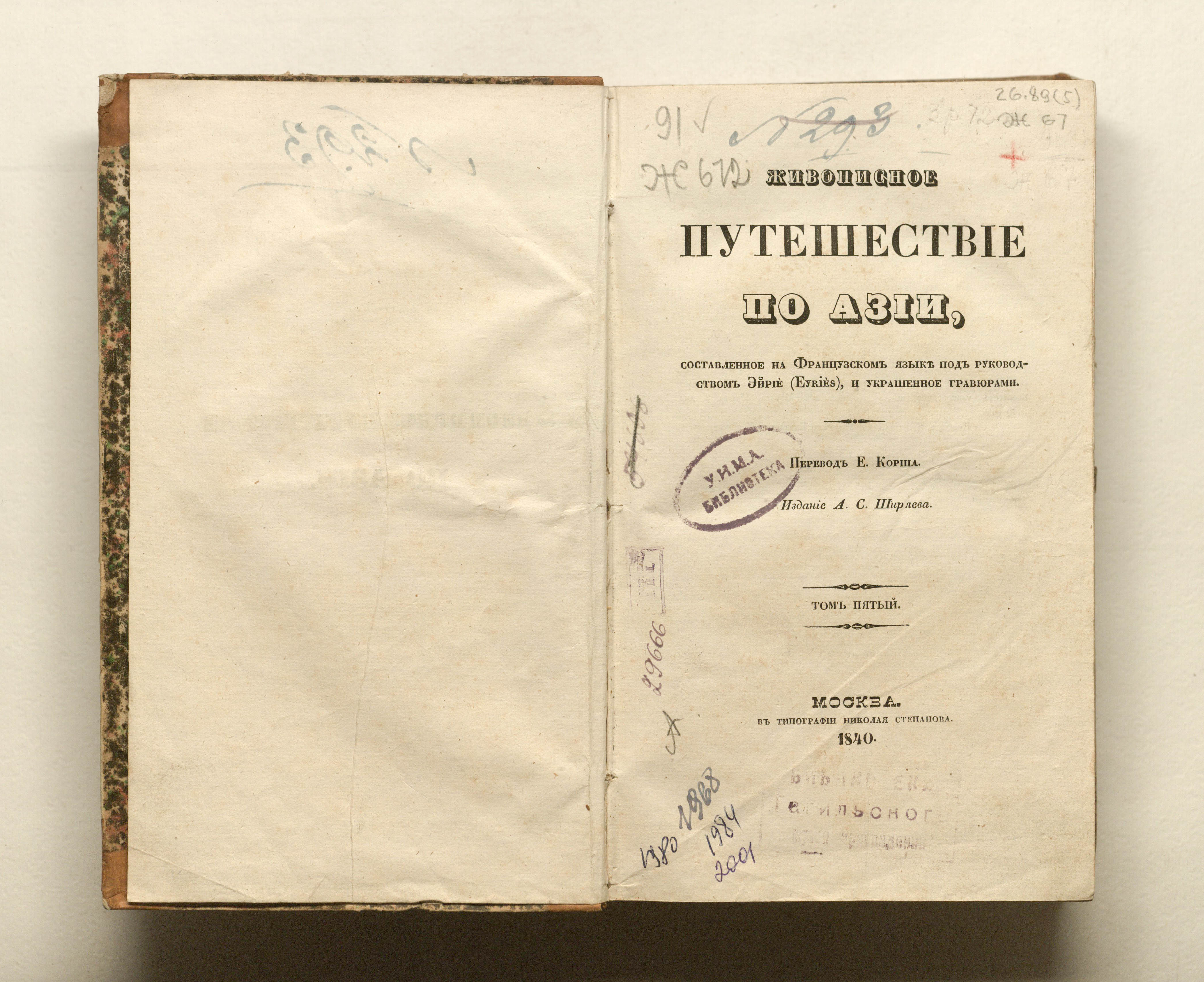 Эйрие, Жан Батист Бенуа (1767-1846). Живописное путешествие по Азии, составленное на французском языке под руководством Эйрие (Eyriès) и украшенное гравюрами. Т. 5-6 / Ж. Б. Эйрие ; пер. Е. Корша. — Москва : Издание А.С. Ширяева, 1840. — 233, [2], 272, [2] с. ; 23х14 см.