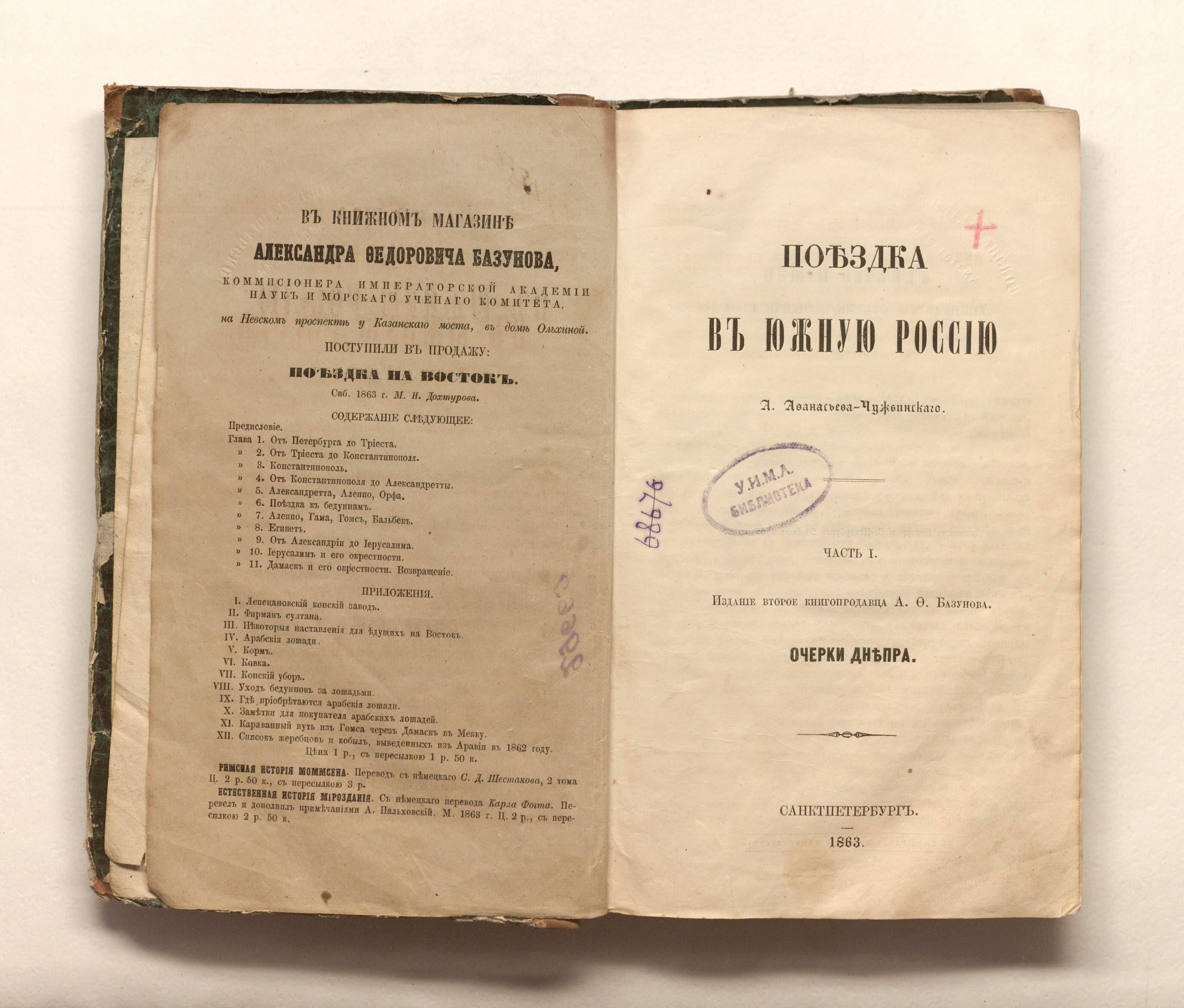Афанасьев-Чужбинский, Александр Степанович (1816-1875). Поездка в южную Россию. Ч. 1. Очерки Днепра / А. С. Афанасьев-Чужбинский. — Санкт-Петербург : издание книгопродавца А.О. Базунова, 1863. — 465, II с. ; 24х15 см.