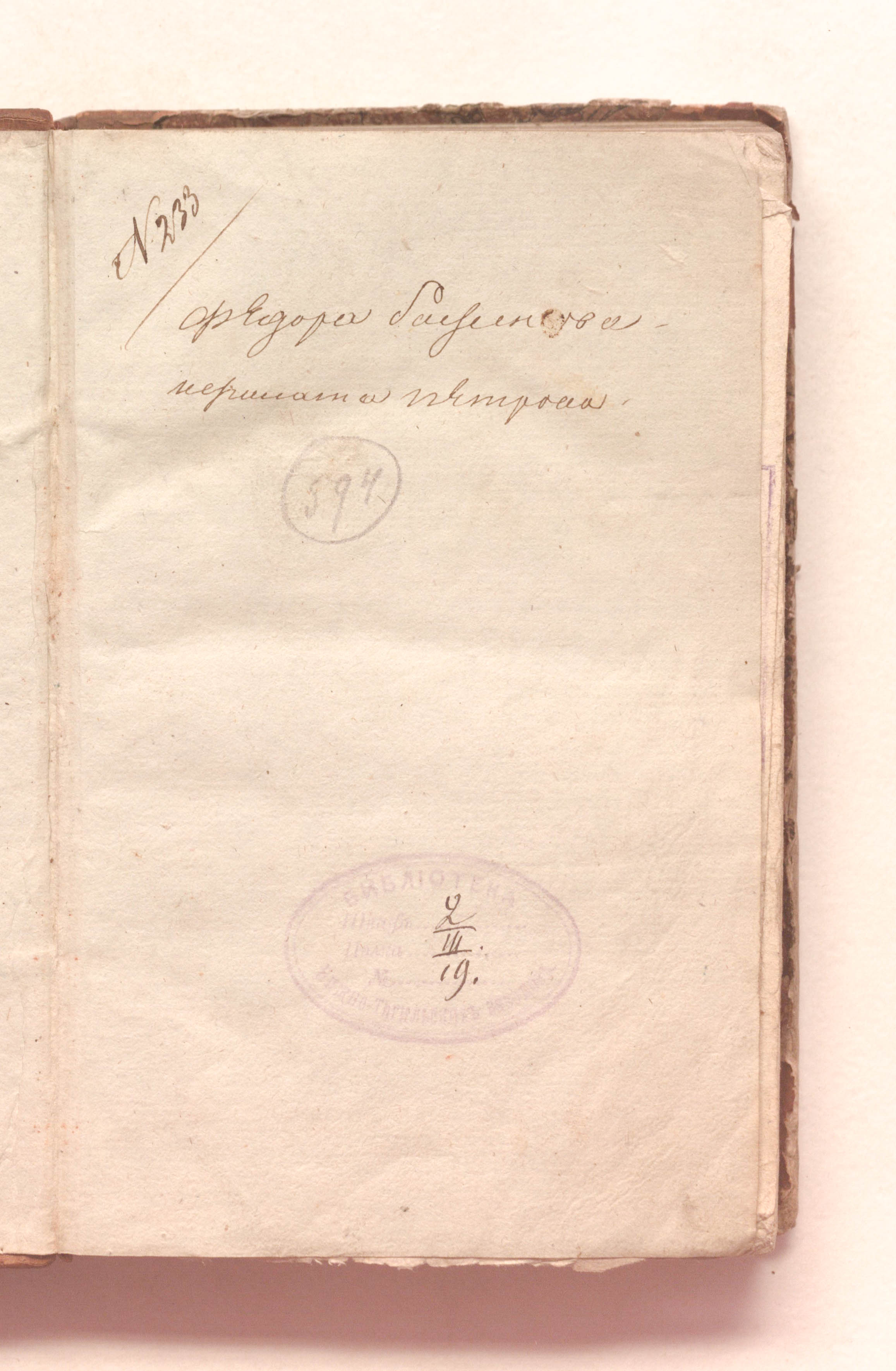 «Библиотека Нижне-Тагильских заводов. Шкаф 2. Полка III. № 19» (форзац);