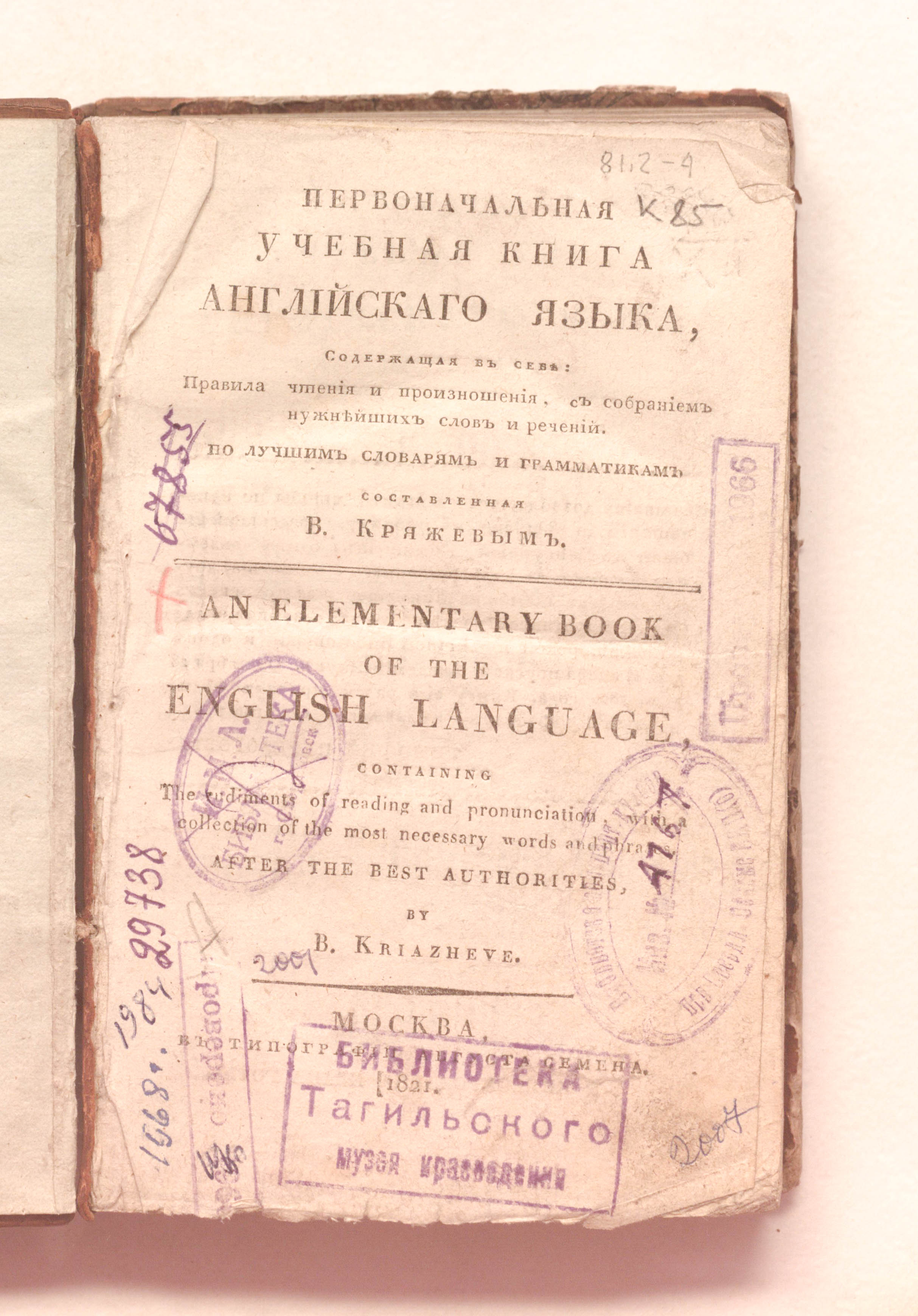 Первоначальная учебная книга английского языка : содержащая в себе: Правила чтения и произношения, с собранием нужнейших слов и речений / В. С. Кряжев = An elementary book of the English language : containing The rudiments of reading and pronunciation, with a collection of the most necessary words and phrases / After the best authorities, by B. Kriazheve. – Москва : тип. А. Семена, 1821. – 315 с. ; 18х11,5 см.