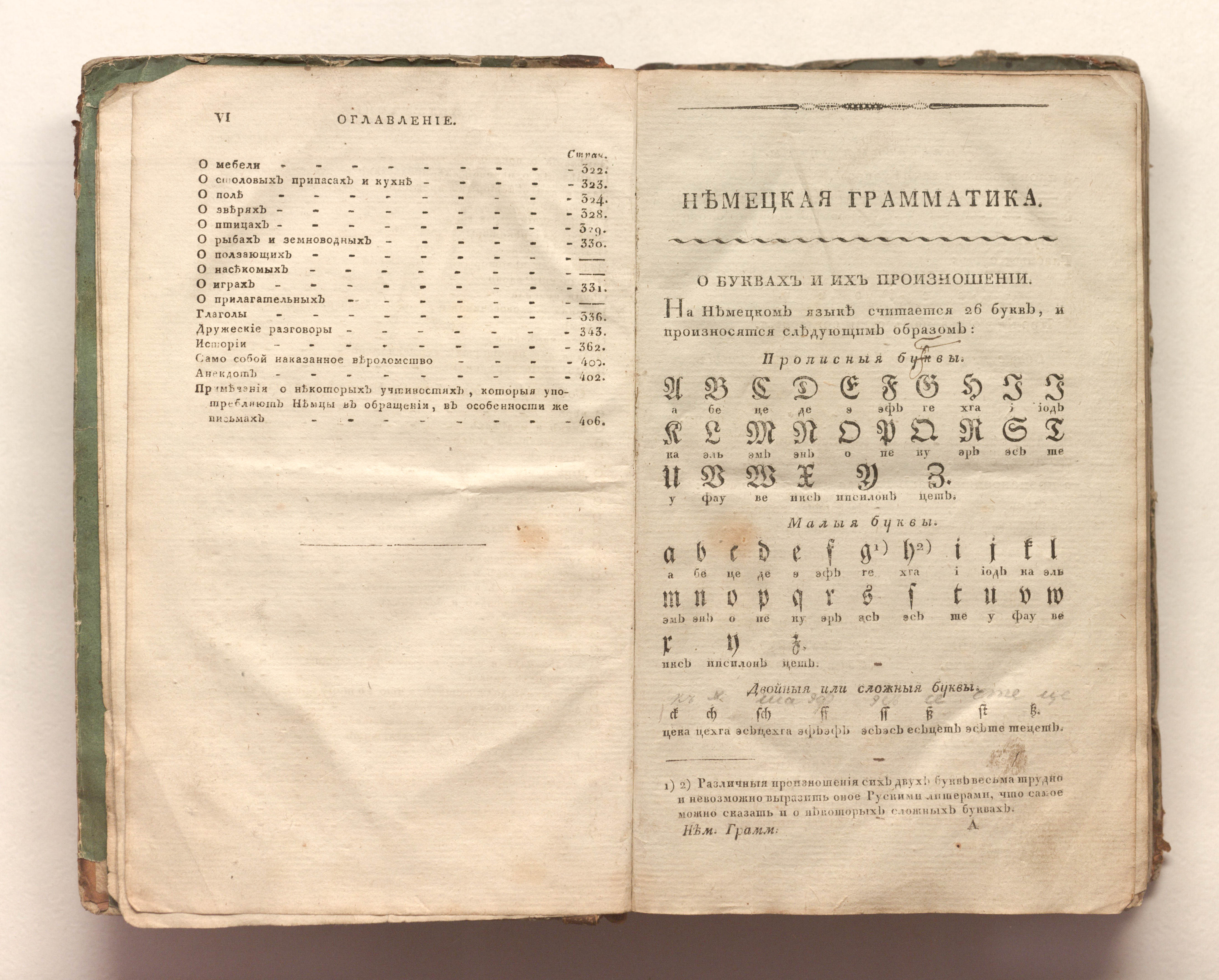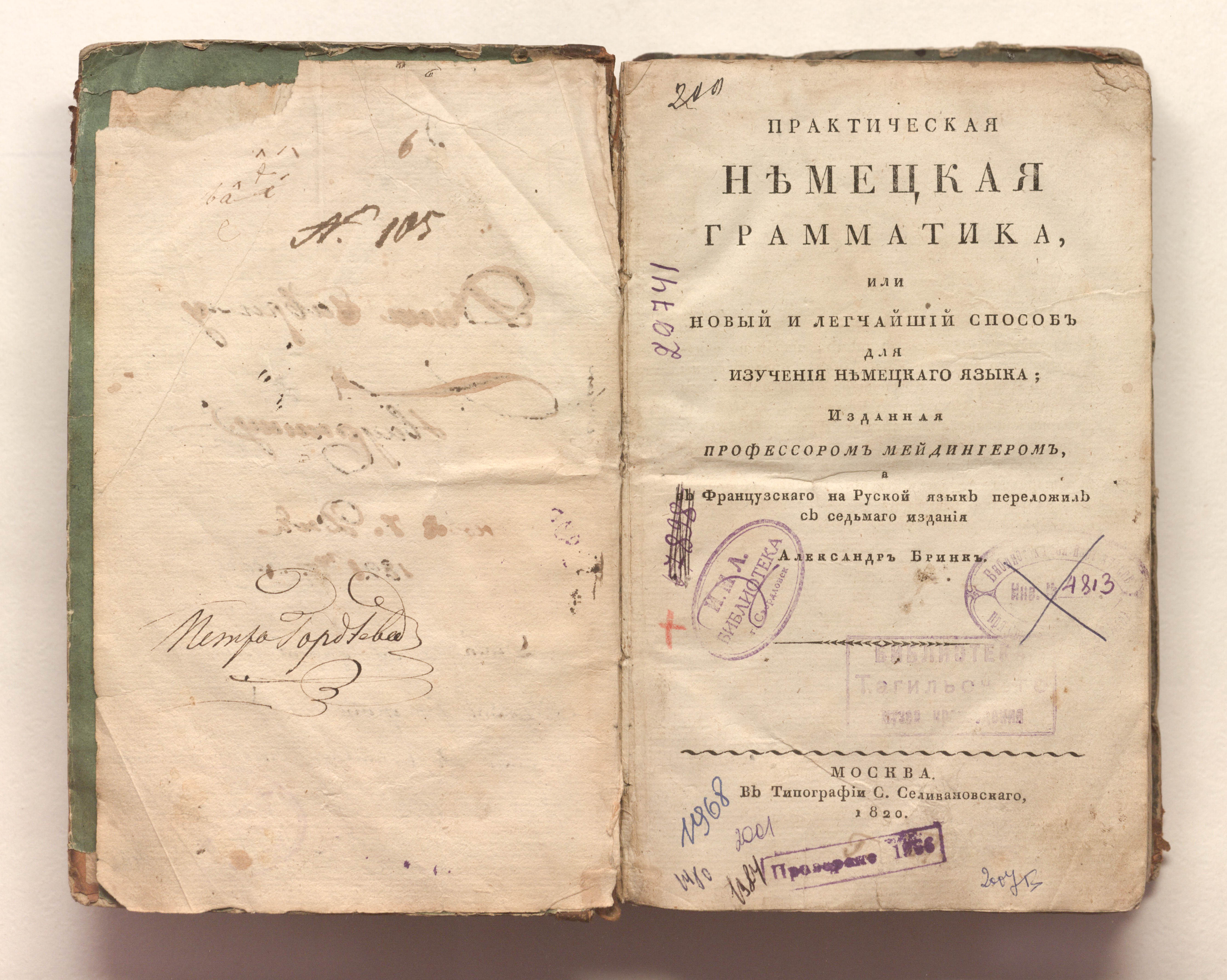 Практическая немецкая грамматика, или Новый и легчайший способ для изучения немецкого языка / изданная профессором Мейдингером, а с французского на русский язык переложил с седьмого издания Александр Бринк. – Москва : в типографии С. Селивановскаго, 1820. – VI, 414 с. ; 22х14 см.