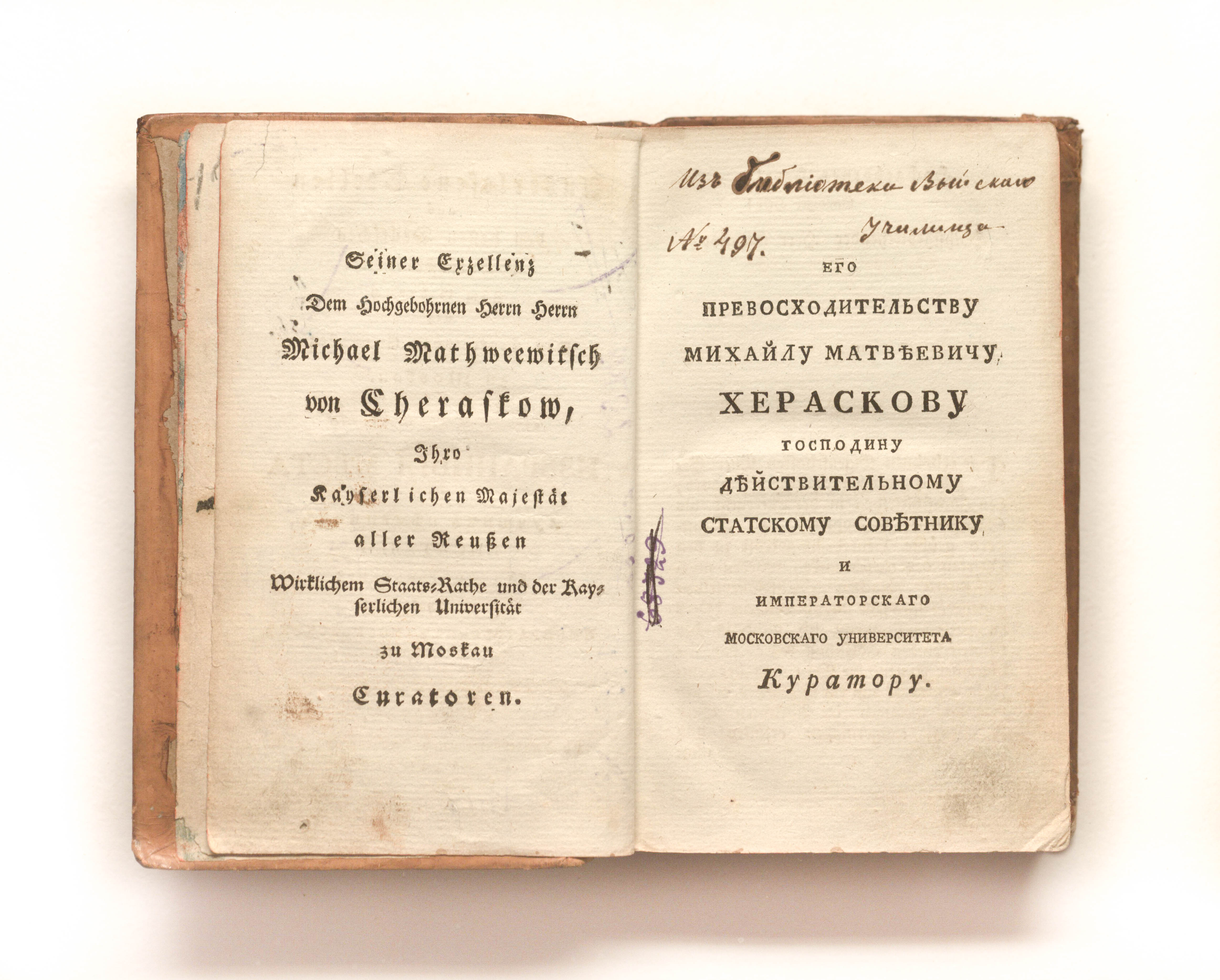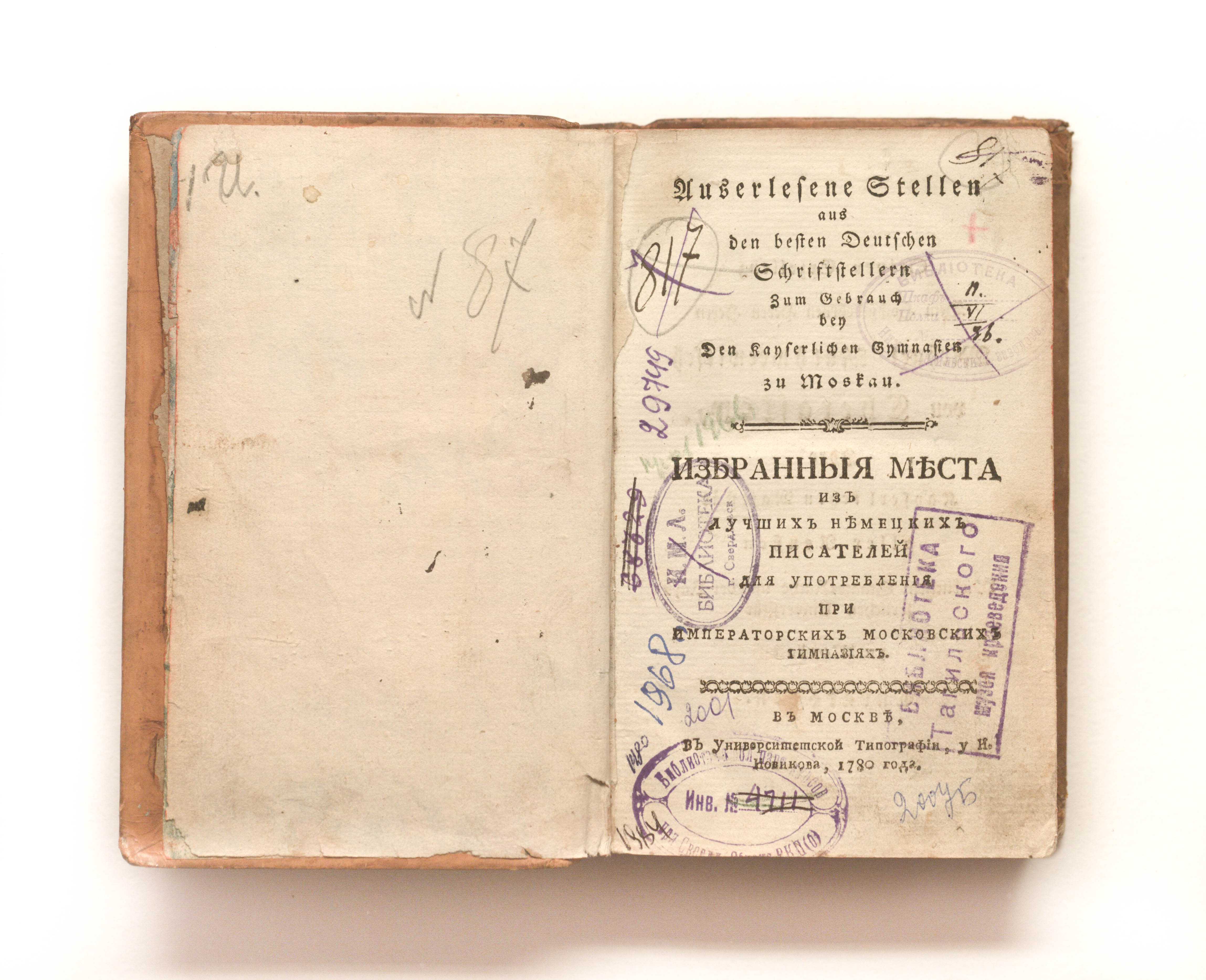 Избранныя места из лучших немецких писателей для употребления при императорских московских гимназиях / перевод. Ф. И. Сапожников. — Москва : Университетская типография у Н. Новикова, 1780. — 379 с. ; 17х11 см.