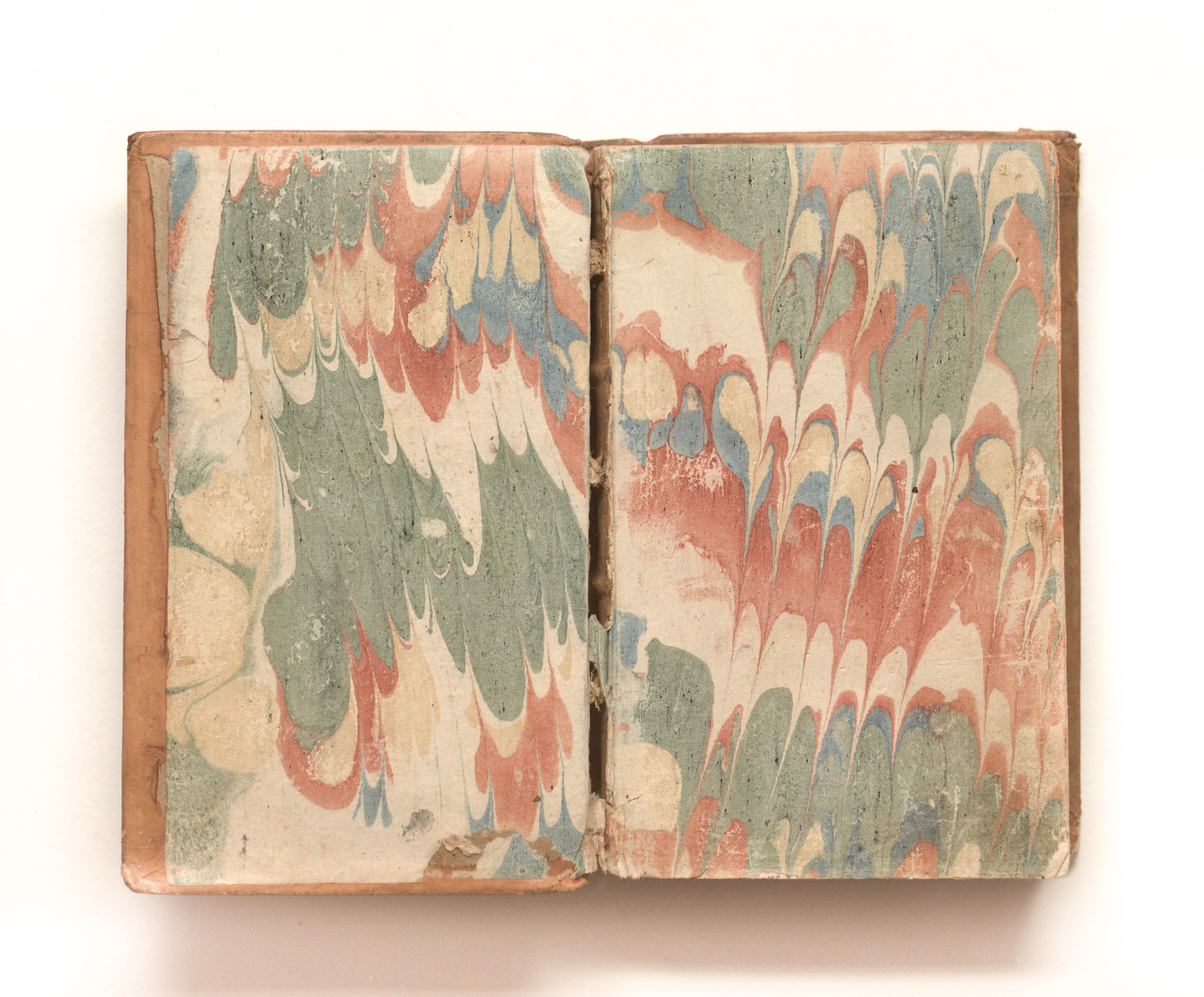 Книга в цельнокожаном владельческом переплете. Форзацы украшены бумагой с рисунком «павлинье перо». Обрез тонированный. Бумага верже.