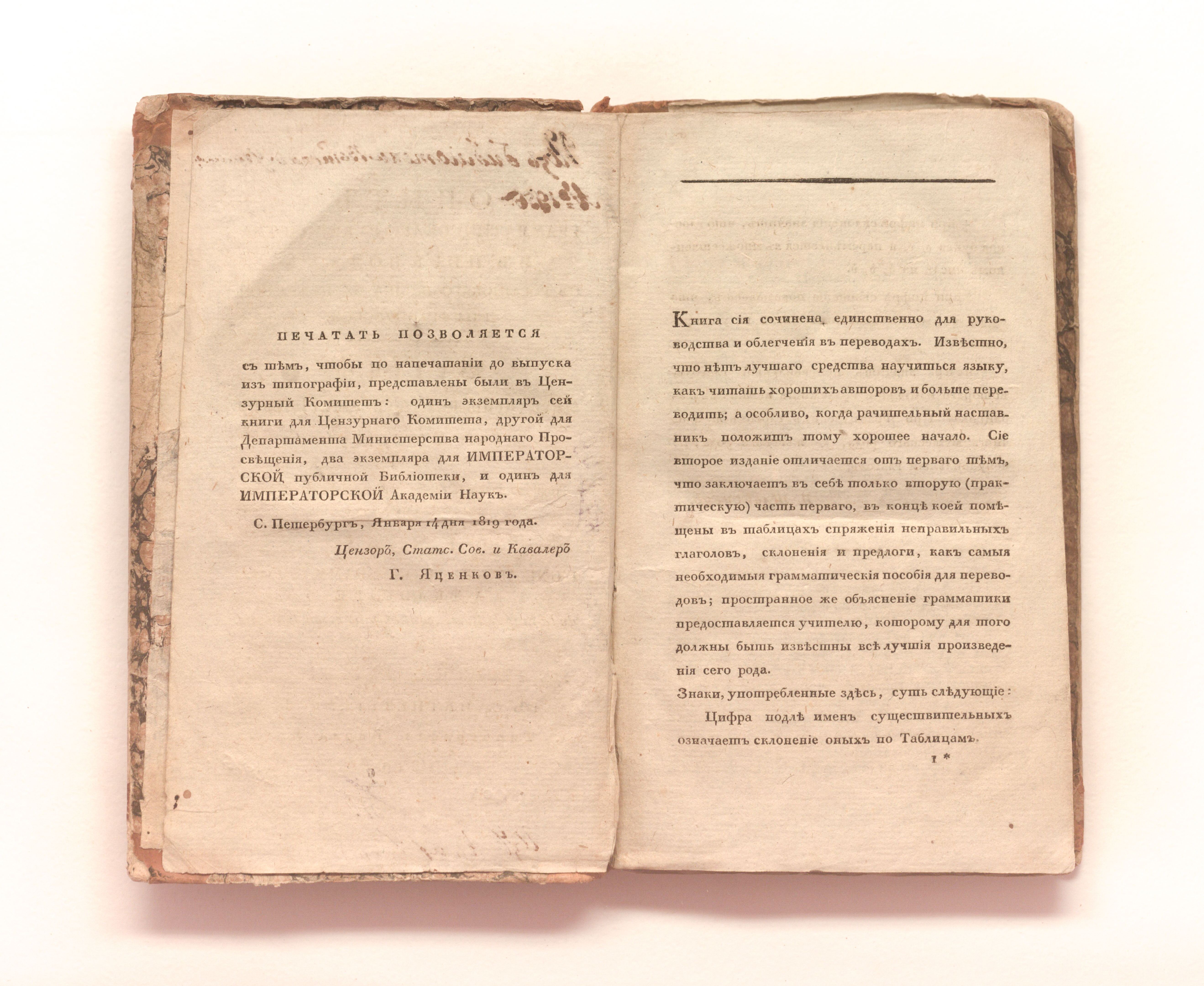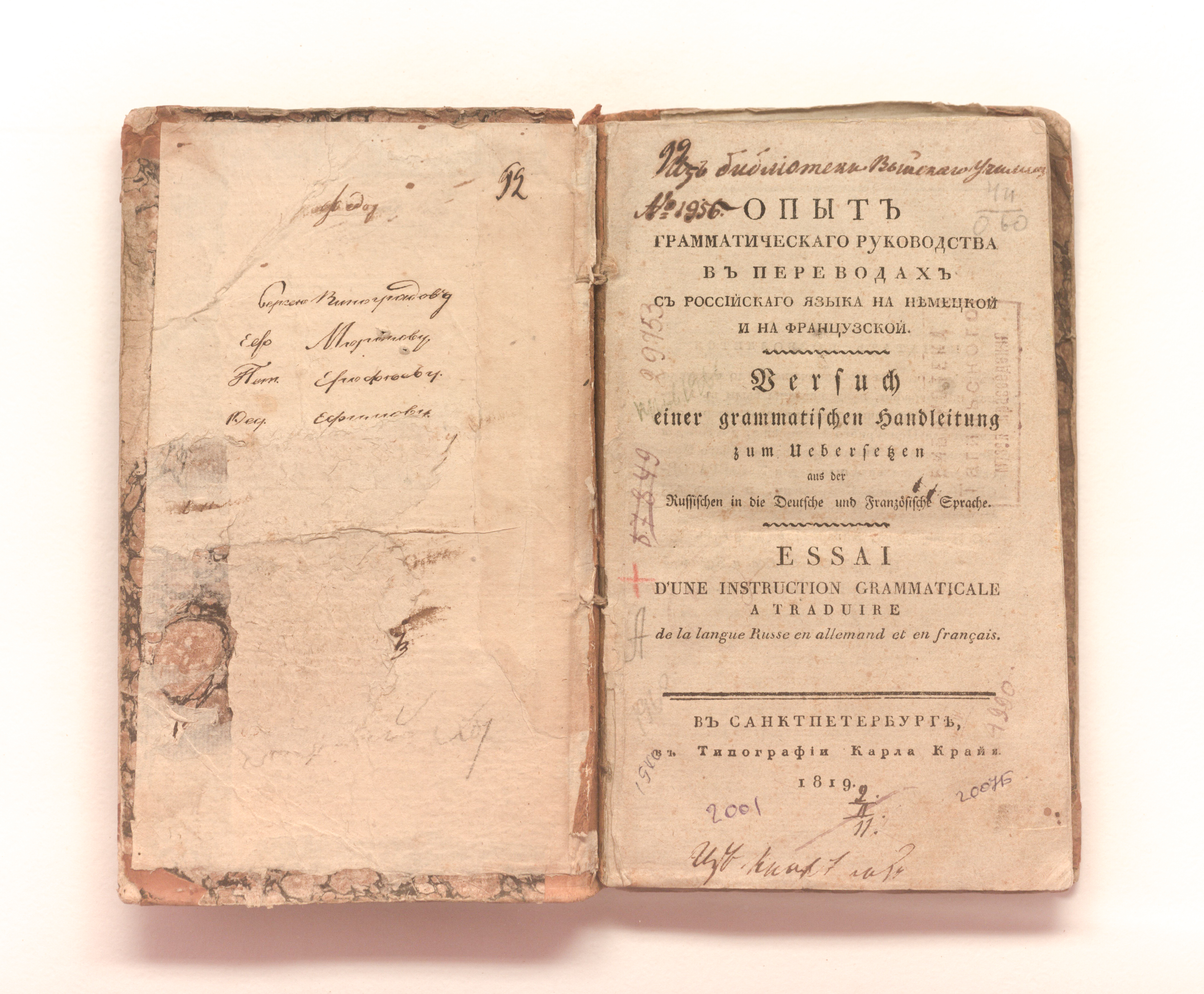 Шлейснер, Павел Христианович (ок. 1760-1838). Опыт грамматическаго руководства в переводах с российскаго языка на немецкой и на французской / П. Х. Шлейснер. — Санкт-Петербург : типография Карла Крайя, 1819. — 181, 19 с. ; 1 л. табл. ; 21х12,5 см.