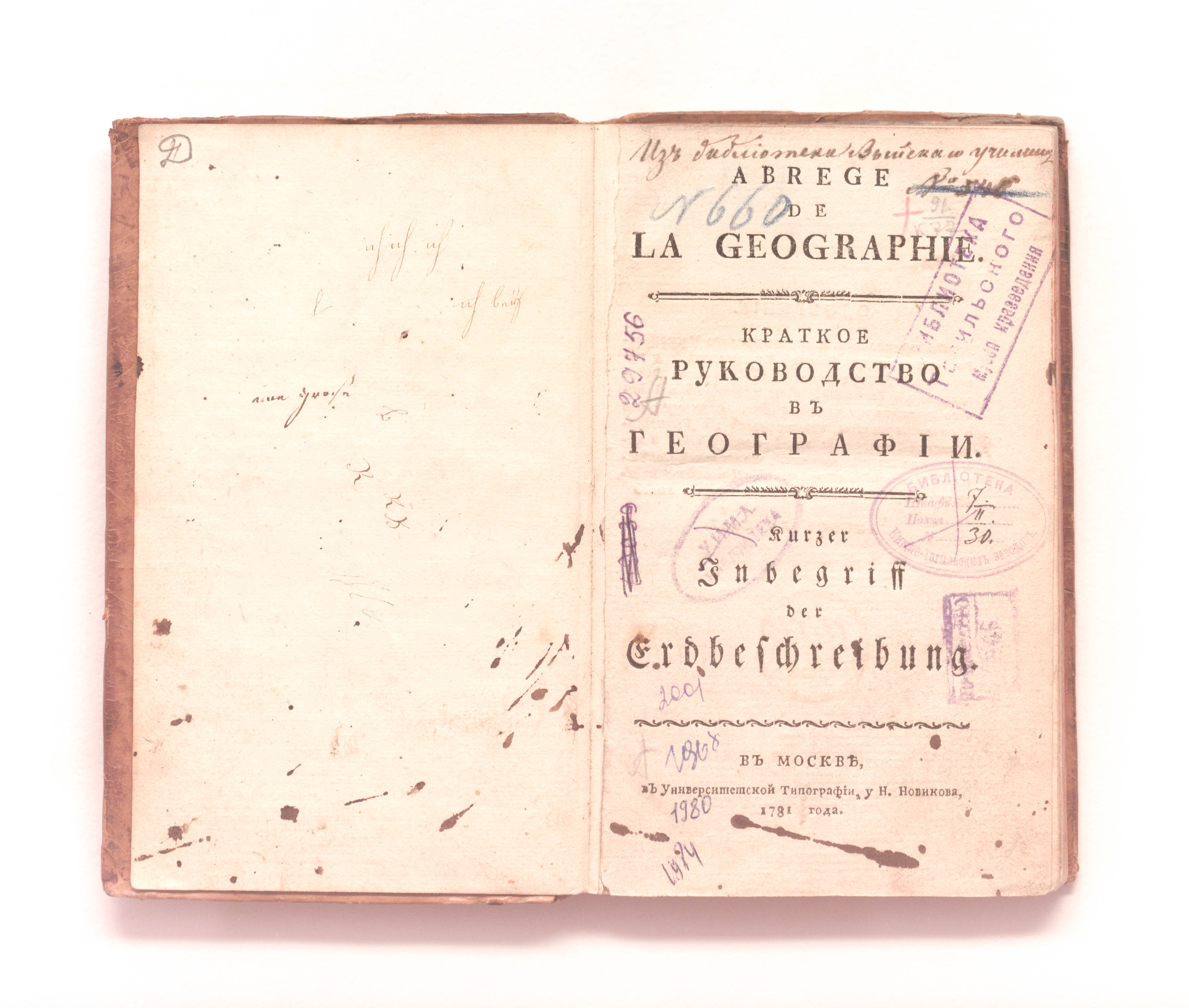 Краткое руководство в географии. — Москва : в Университетской типографии у. Н. Новикова, 1781. — 128 с. ; 20х12 см.