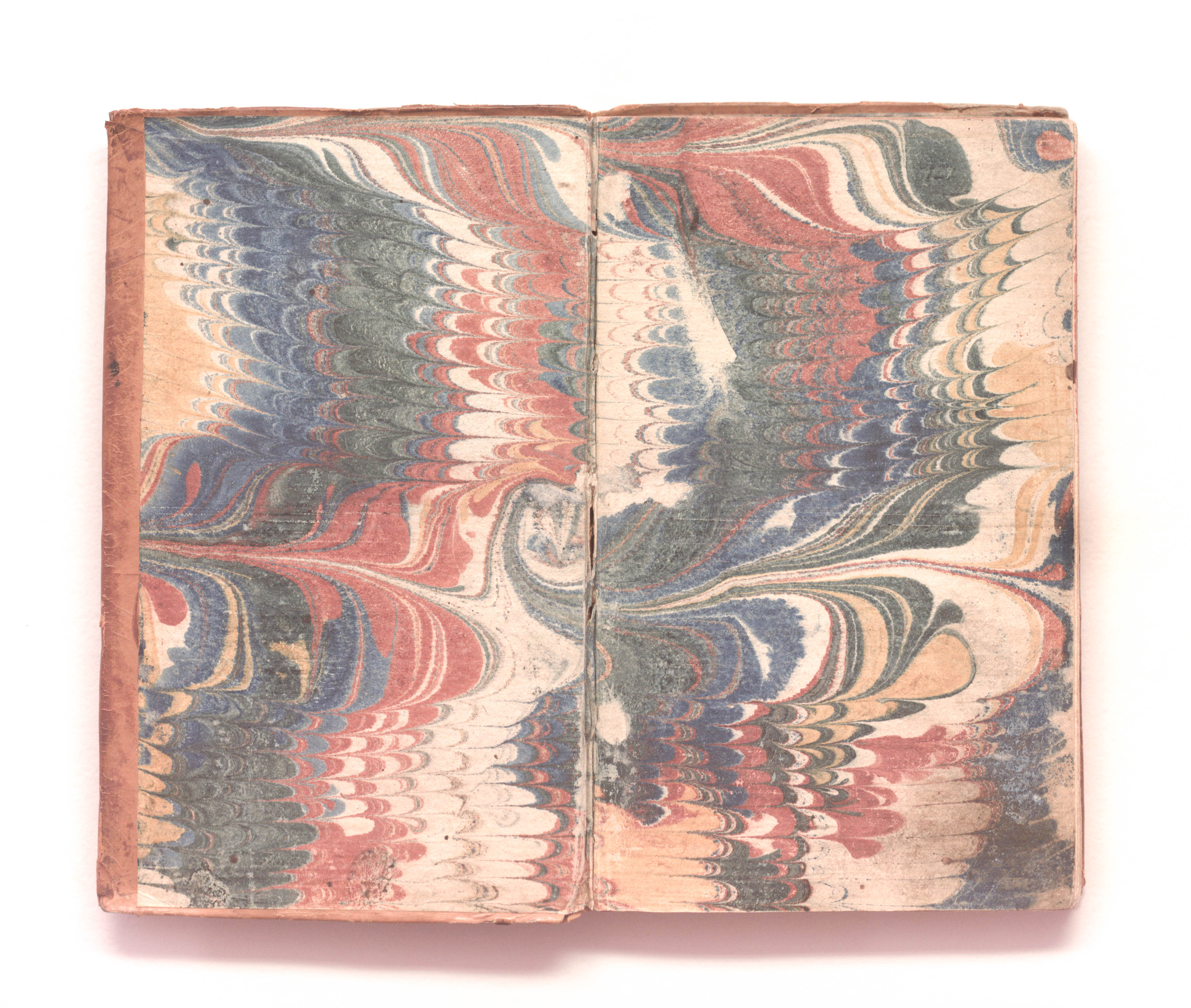 Книга в цельнокожаном владельческом переплете. Форзацы украшены бумагой с рисунком «павлинье перо». Обрез тонированный. Бумага верже.