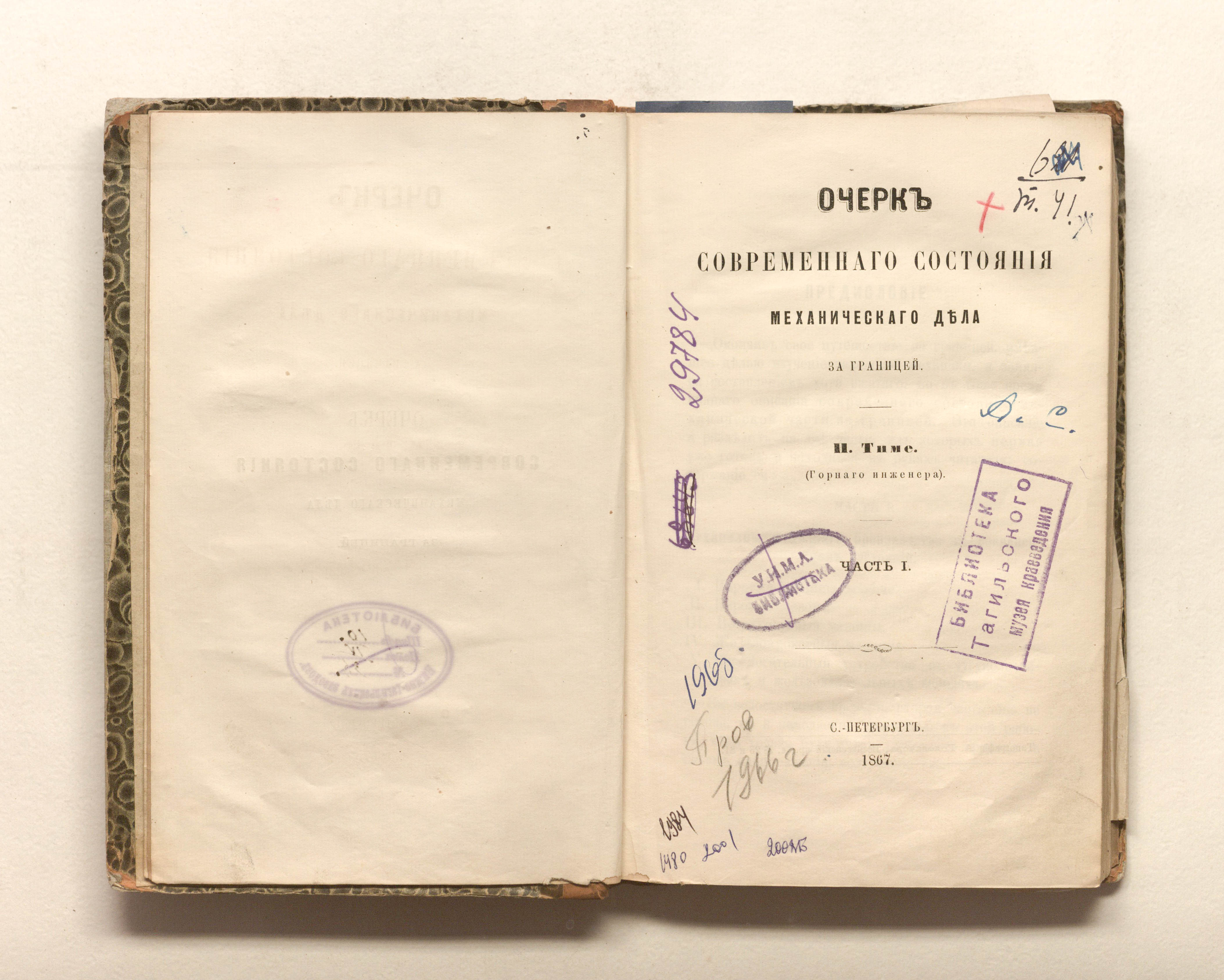 Очерк современного состояния механического дела за границей. Ч. 1 / И. А. Тиме. — Санкт-Петербург : тип. А. Головачова, 1867. — [4], IV, 216 с. : 28 л. черт. ; 22,5х14,5 см.