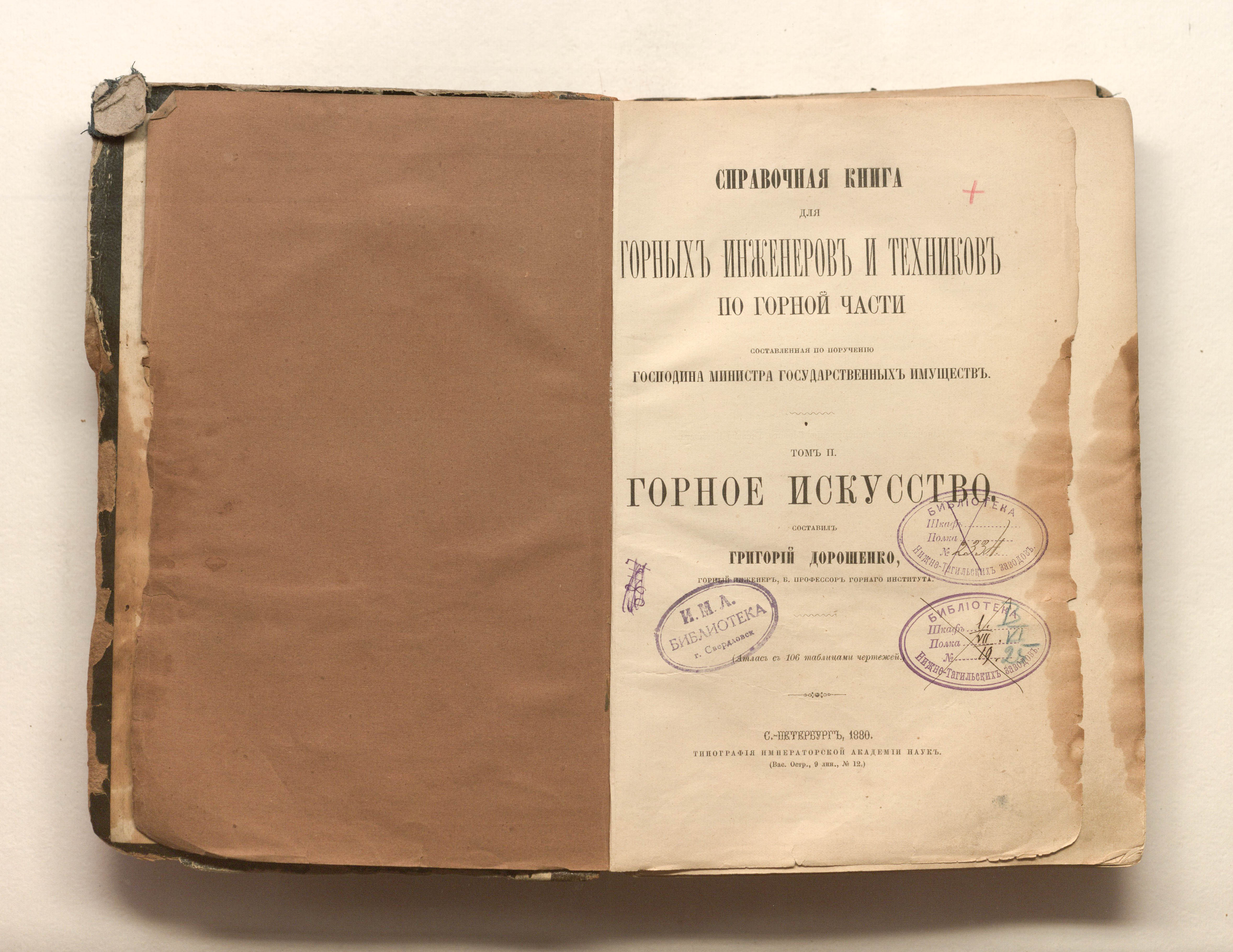 Справочная книга для горных инженеров и техников по горной части : составленная по поручению господина министра государственных имуществ. Т. 2. Горное искусство / Г. Я. Дорошенко. — Санкт-Петербург : тип. Имп. Акад. наук, 1880. — XXVII, 528, [5] с. ; 24х16 см.