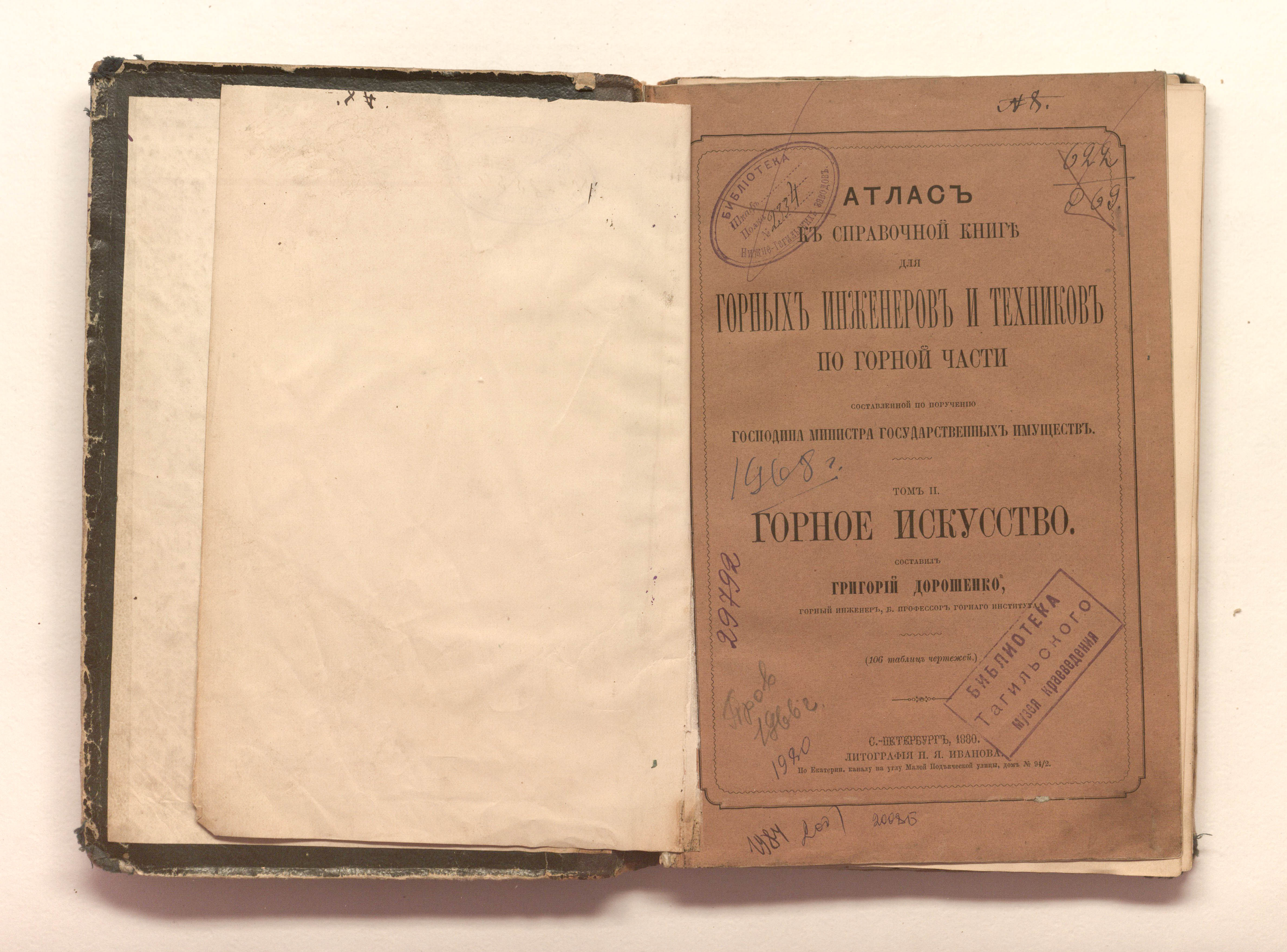 Дорошенко, Григорий Яковлевич (1846-1910). Атлас к справочной книге для горных инженеров и техников по горной части, составленная по поручению господина министра государственных имуществ. Т. 2. Горное искусство / Сост. Григорий Дорошенко, горн. инж., б. проф. Горн. ин-та. — Санкт-Петербург : литография П. Я. Иванова, 1880. — 2 с. : 106 л. черт. ; 24х16 см.