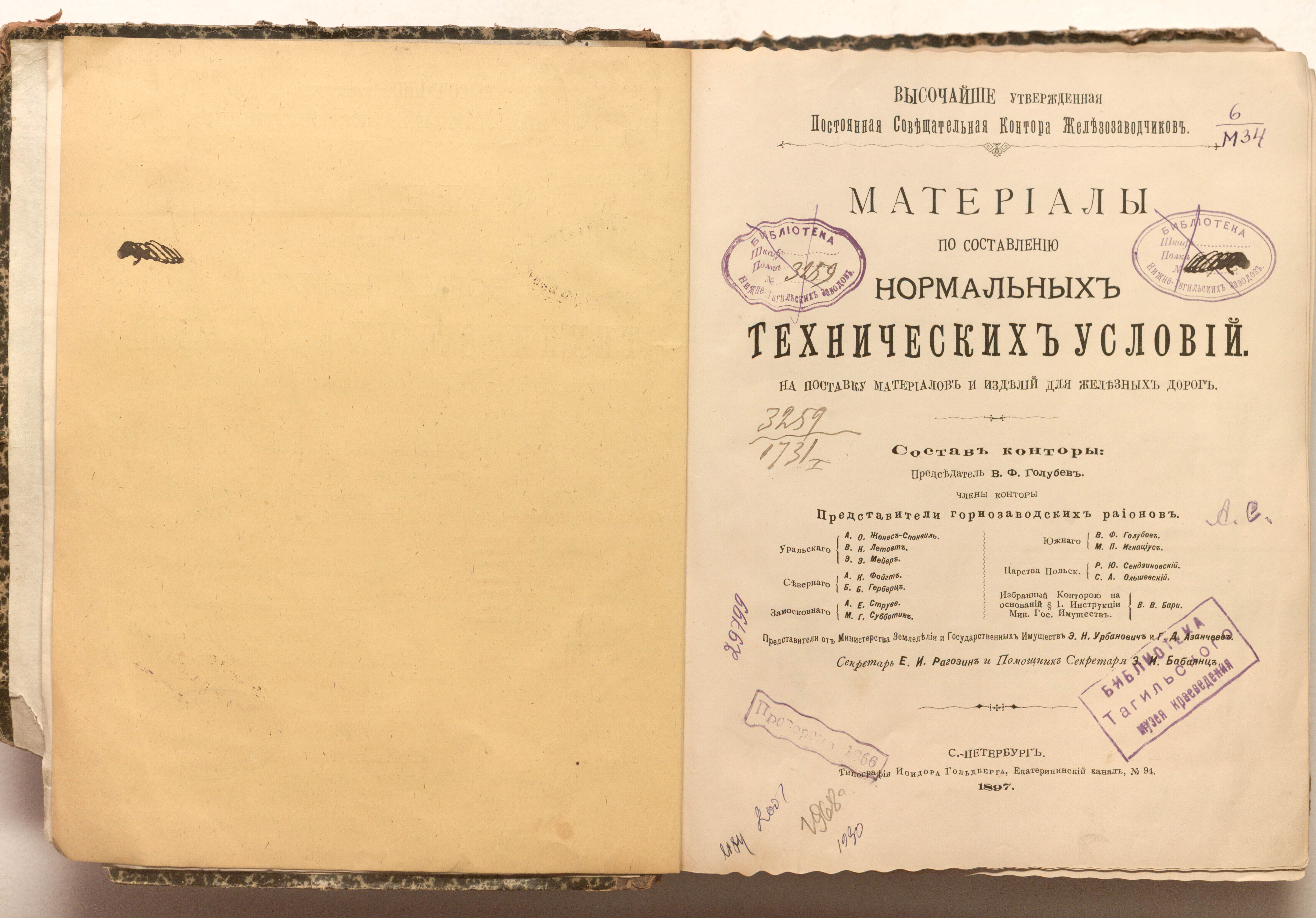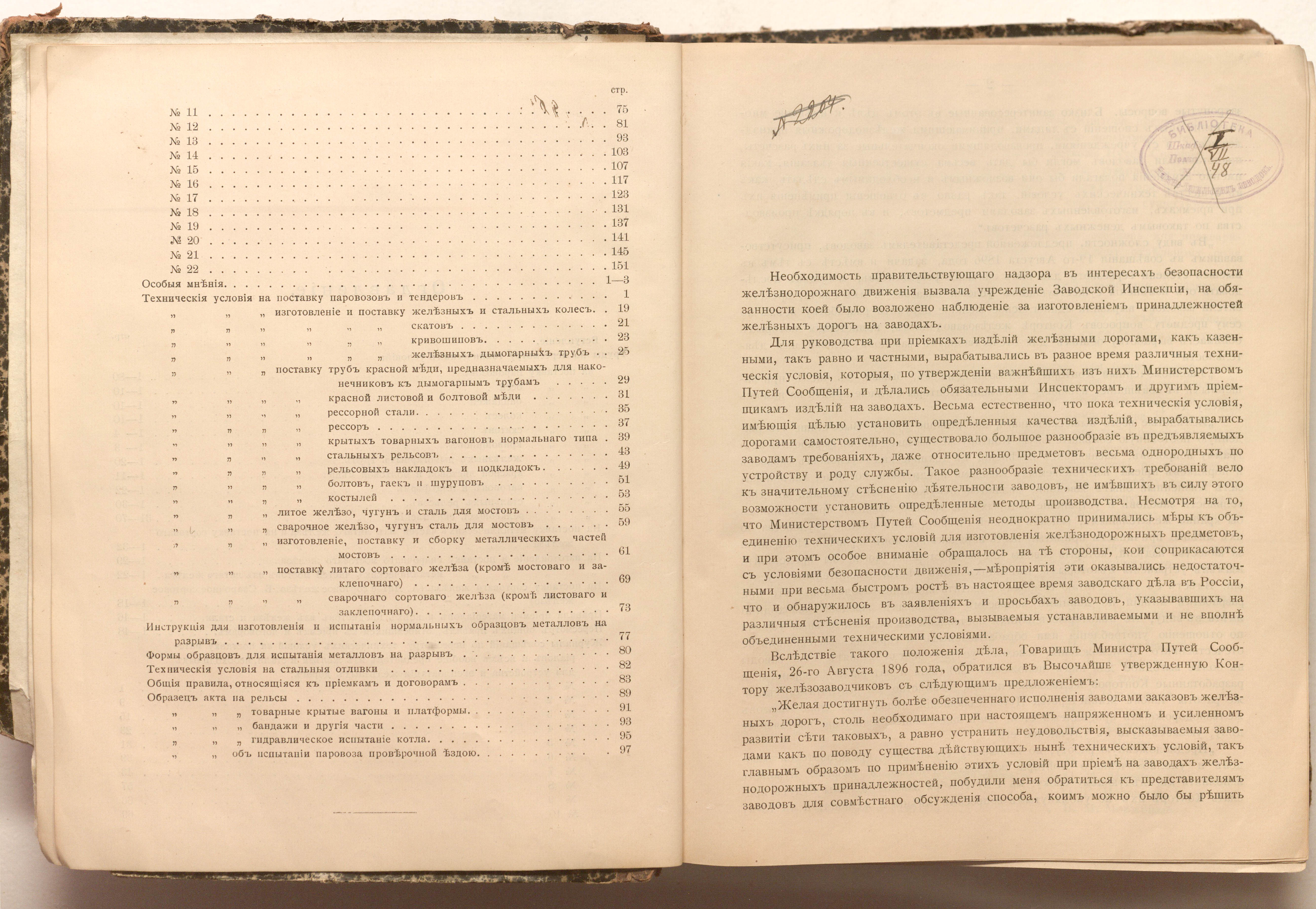 Материалы по составлению нормальных технических условий на поставку материалов и изделий для железных дорог / Высочайше утвержденная Постоян. совещат. контора железозаводчиков. — Санкт-Петербург : тип. Исидора Гольдберга, 1897. — разд. Паг. ; 27,5х22 см.