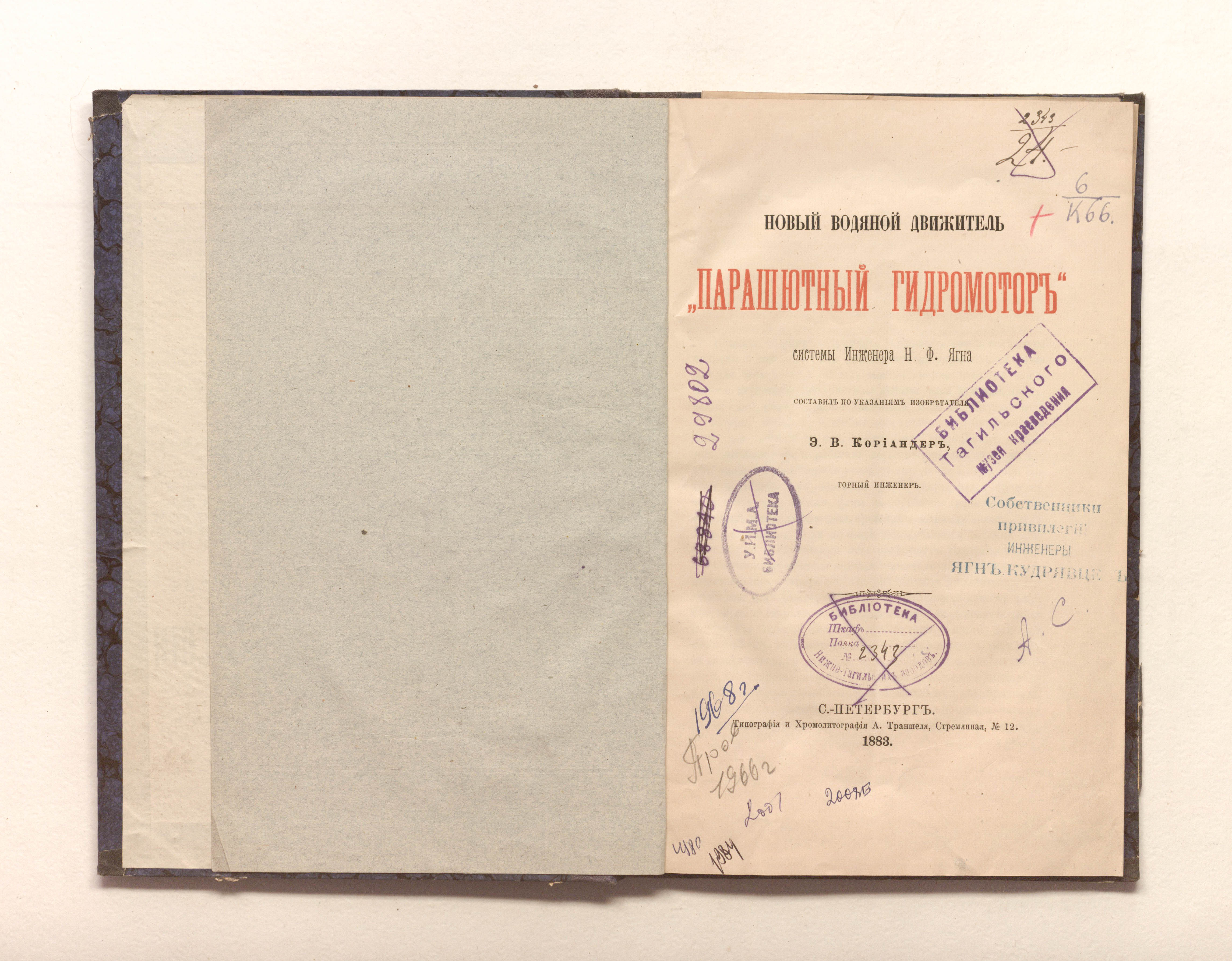 Новый водяной движитель "Парашютный гидромотор" системы инженера Н.Ф. Ягна / сост. по указаниям изобретателя Э.В. Кориандер, горн. инж. — Санкт-Петербург : тип. и хромолит. А. Траншеля, 1883. — 31 с. : 4 л. черт. ; 24х16 см.
