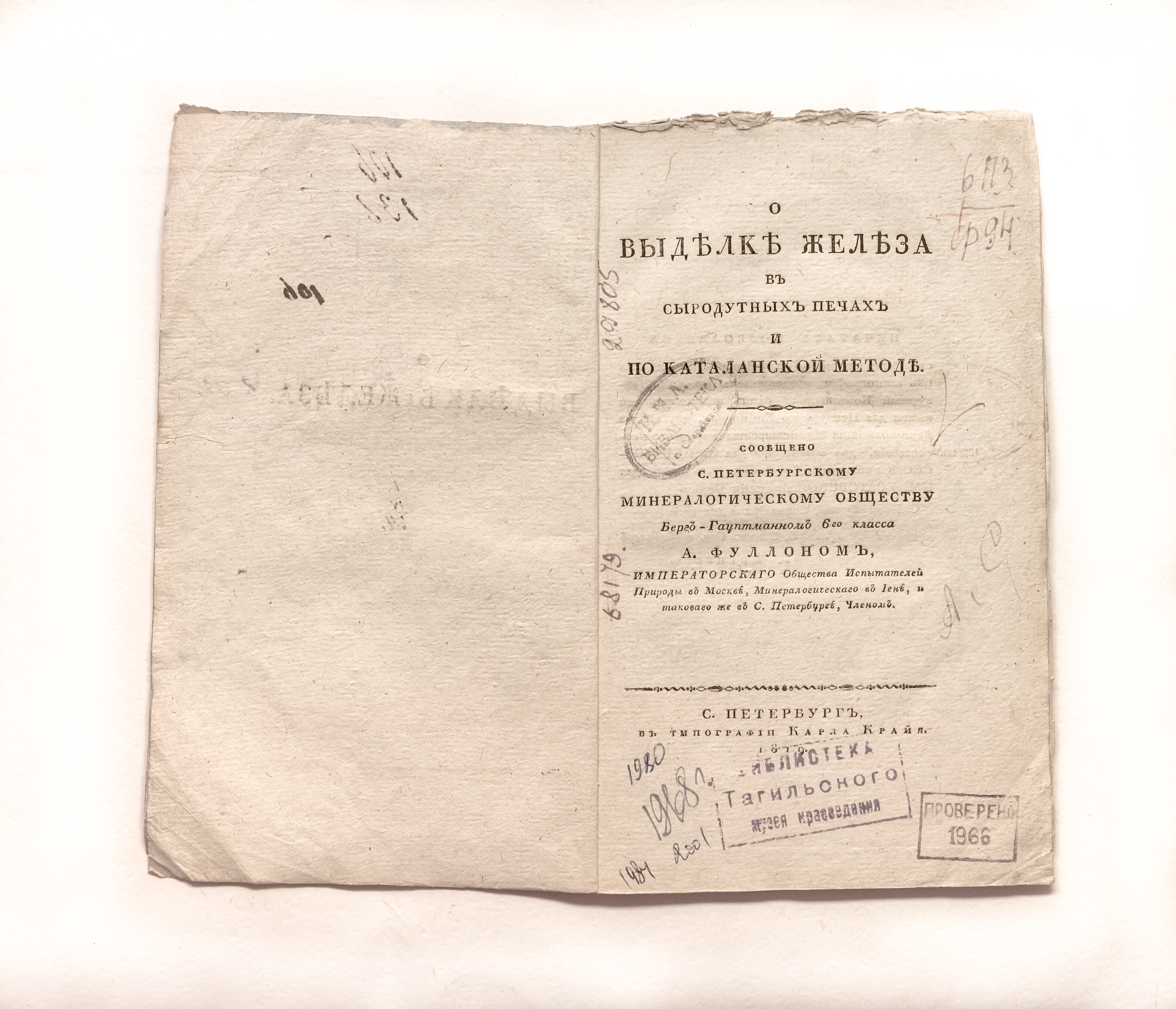 Фуллон, А. А. (1764-1844). О выделке железа в сыродутных печах и по каталанской методе / сообщено С. Петербургскому Минералогическому обществу Берг-гауптманом 6 го класса А. Фуллоном, Императорскаго общества испытателей природы в Москве, Минералогическаго в Иене, и такаваго же в С. Петербурге, членом. – Санкт-Петербург : в тип. Карла Крайя, 1819. – XVI, 44 с. : 2 л. черт. ; 23х13 см.