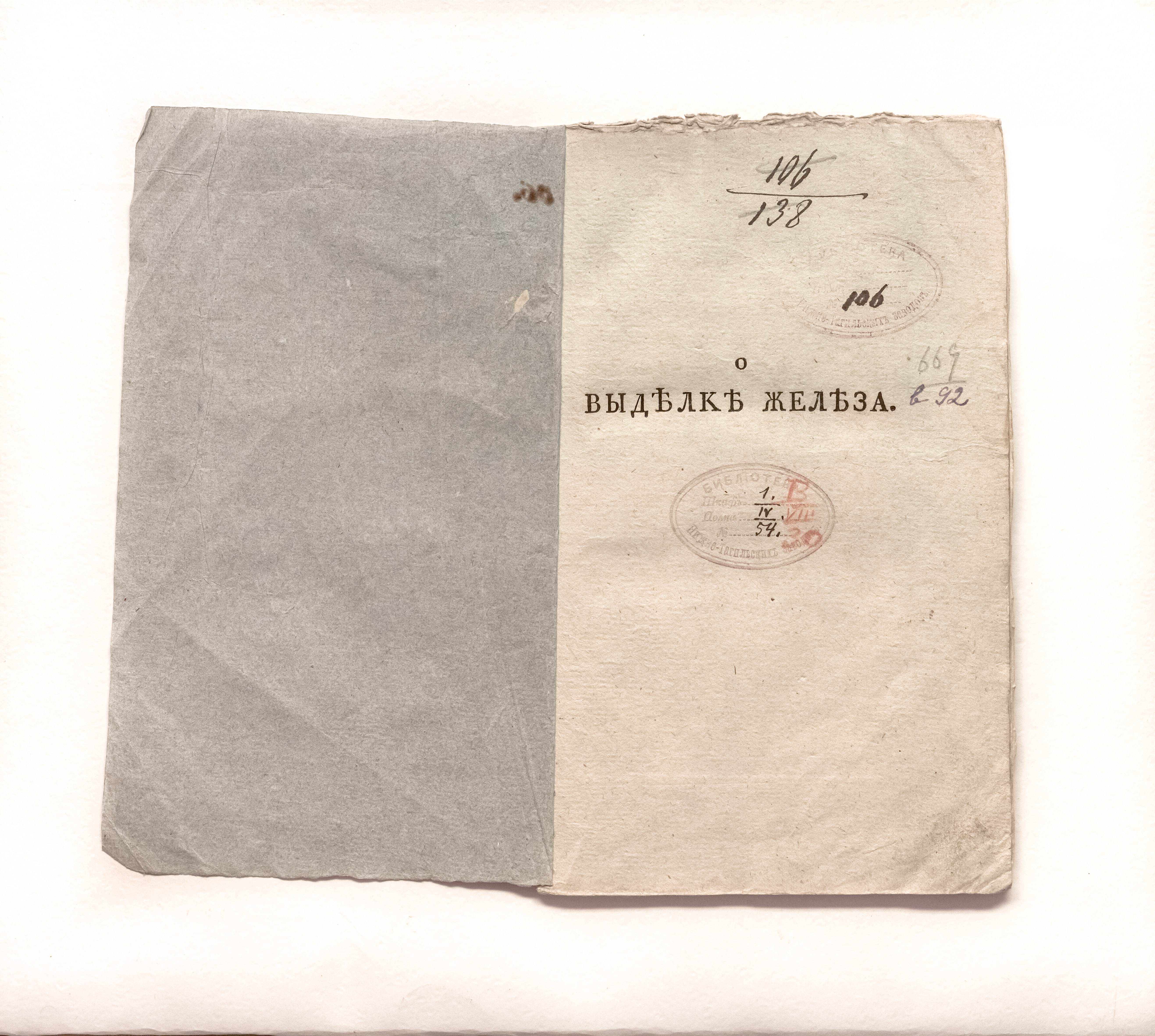 «Библиотека Нижне-Тагильских заводов. Шкаф 1. Полка IV. № 54» (авантитул); "И.М.Л. Библиотека. г. Свердловск" (тит. л.).