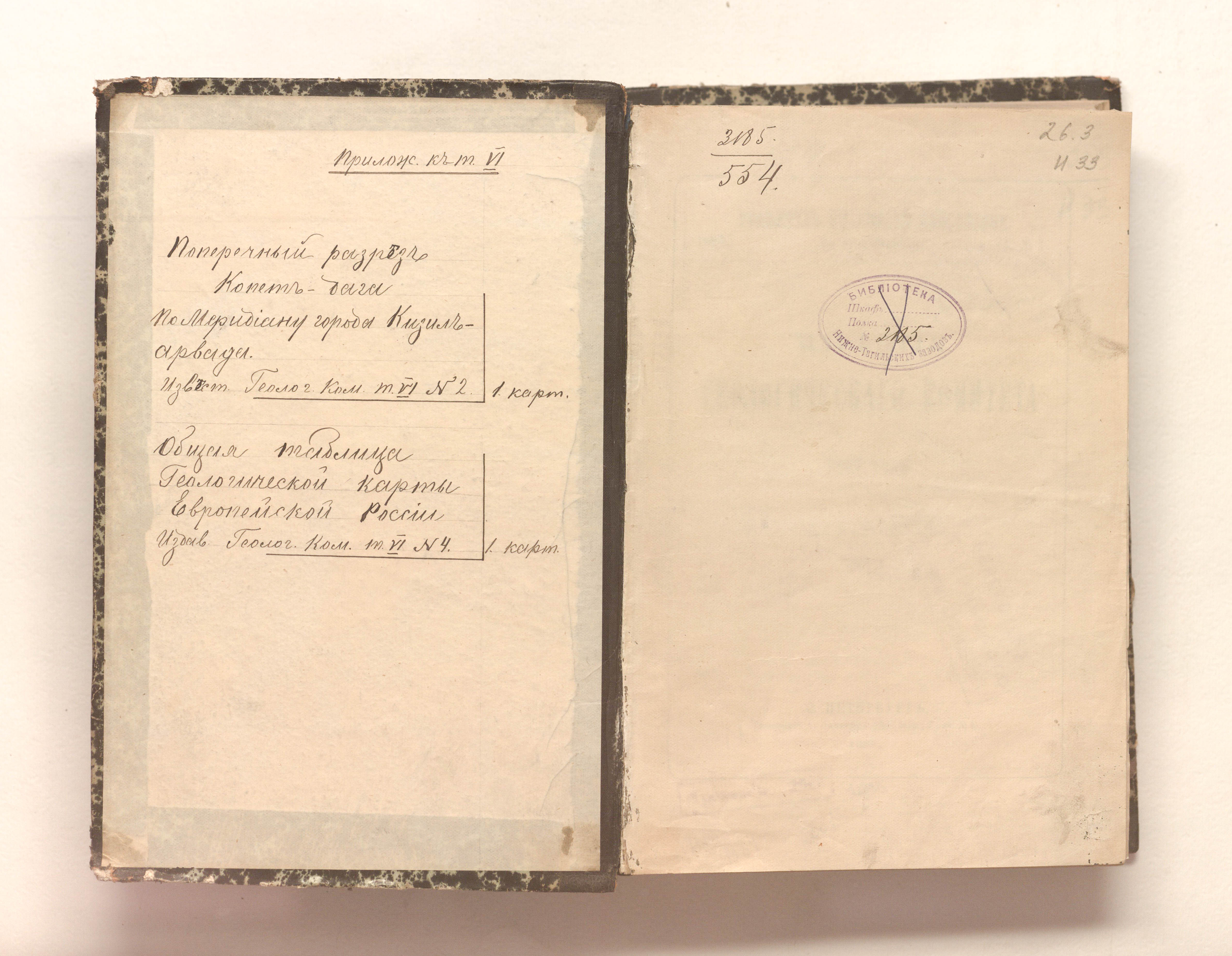 «Библиотека Нижне-Тагильских заводов. № 3185» (форзац, тит. л.);