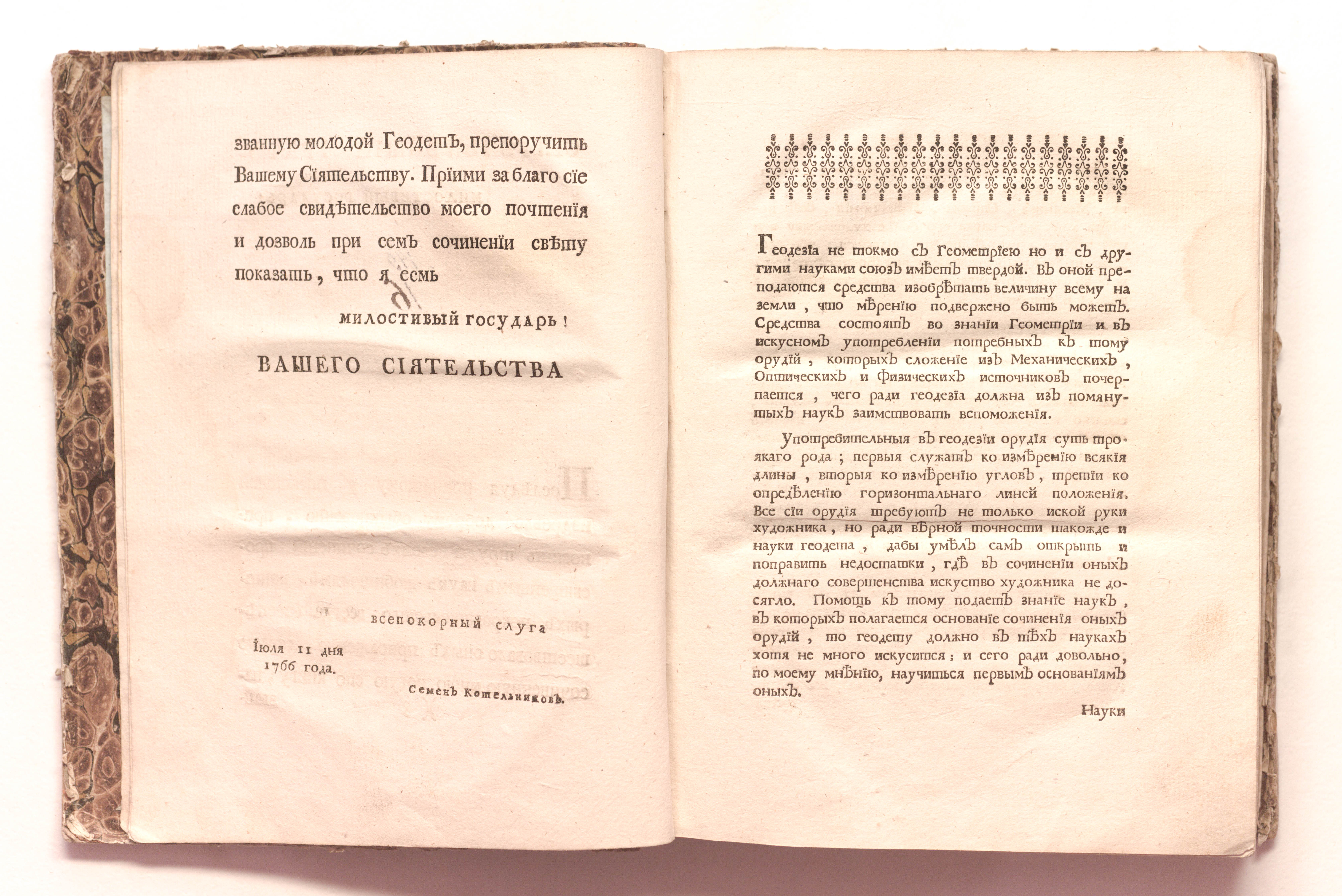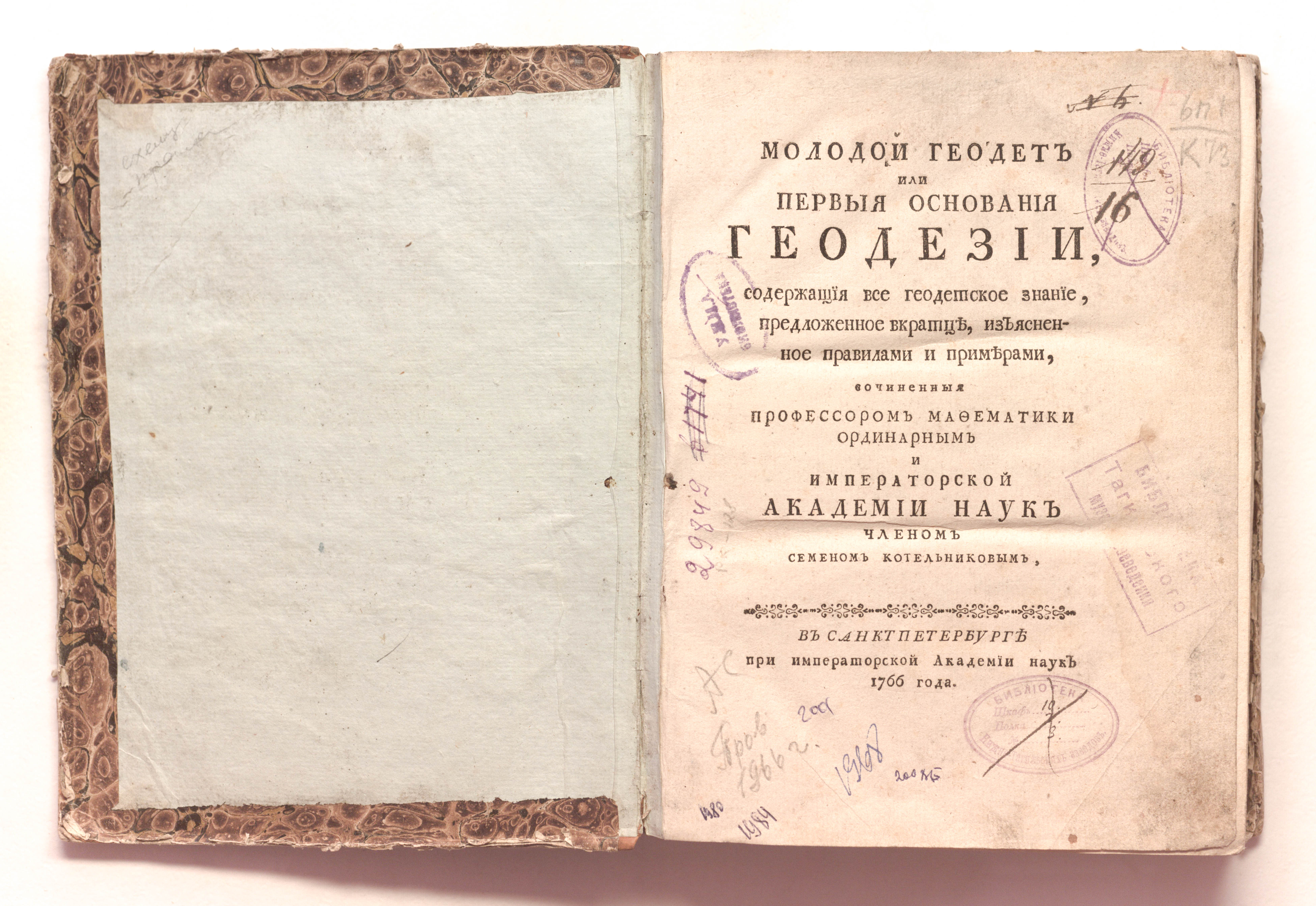 Молодой геодет или Первыя основания геодезии, : содержащия все геодетское знание, предложенное вкратце, изъясненное правилами и примерами [Ч.1-3] / сочиненныя профессором мафематики ординарным и Императорской Академии наук членом Семеном Котельниковым. – В Санктпетербурге : при Императорской Академии наук, 1766. – [14], 340 с. : 5 л. черт. ; 24,5х19 см.