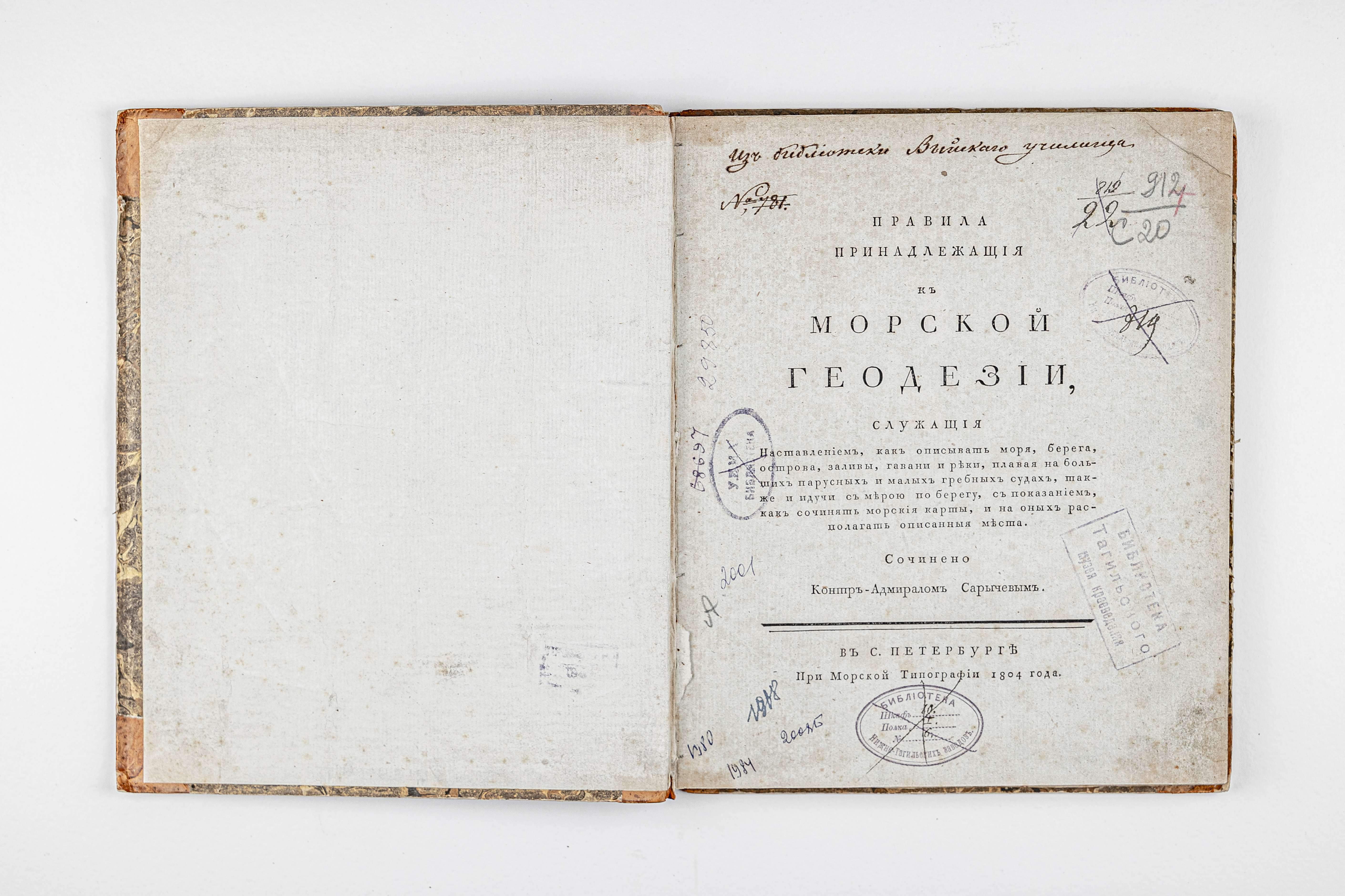 Сарычев, Г. А. (1763-1831). Правила принадлежащия к морской геодезии, служащия наставлением, как описывать моря, берега, острова, заливы, гавани и реки, плавая на больших парусных и малых гребных судах, также и идучи с мерою по берегу, с показанием, как сочинять морские карты, и на оных располагать описанныя места / Сочинено контр-адмиралом Сарычевым. – Санкт-Петербург : при Морской тип., 1804 – [6], IV, 126 с. : 8 л. ил., черт. ; 25х20,5 см.