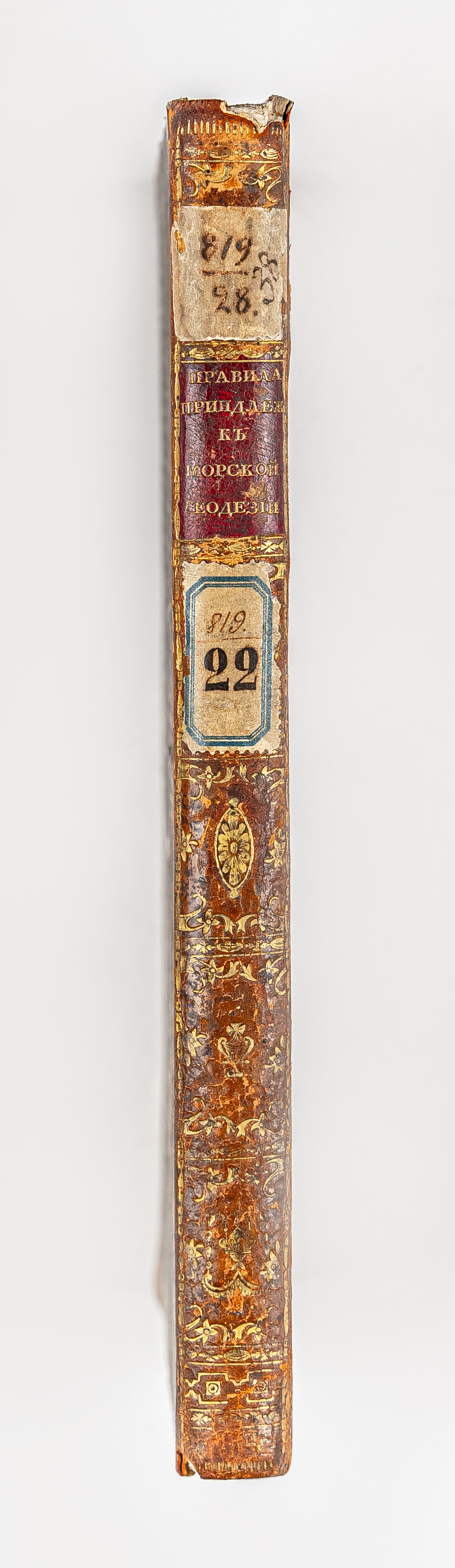 Золототисненое заглавие «Правила принадлеж. к морской геодезии» (на корешке перепл.).