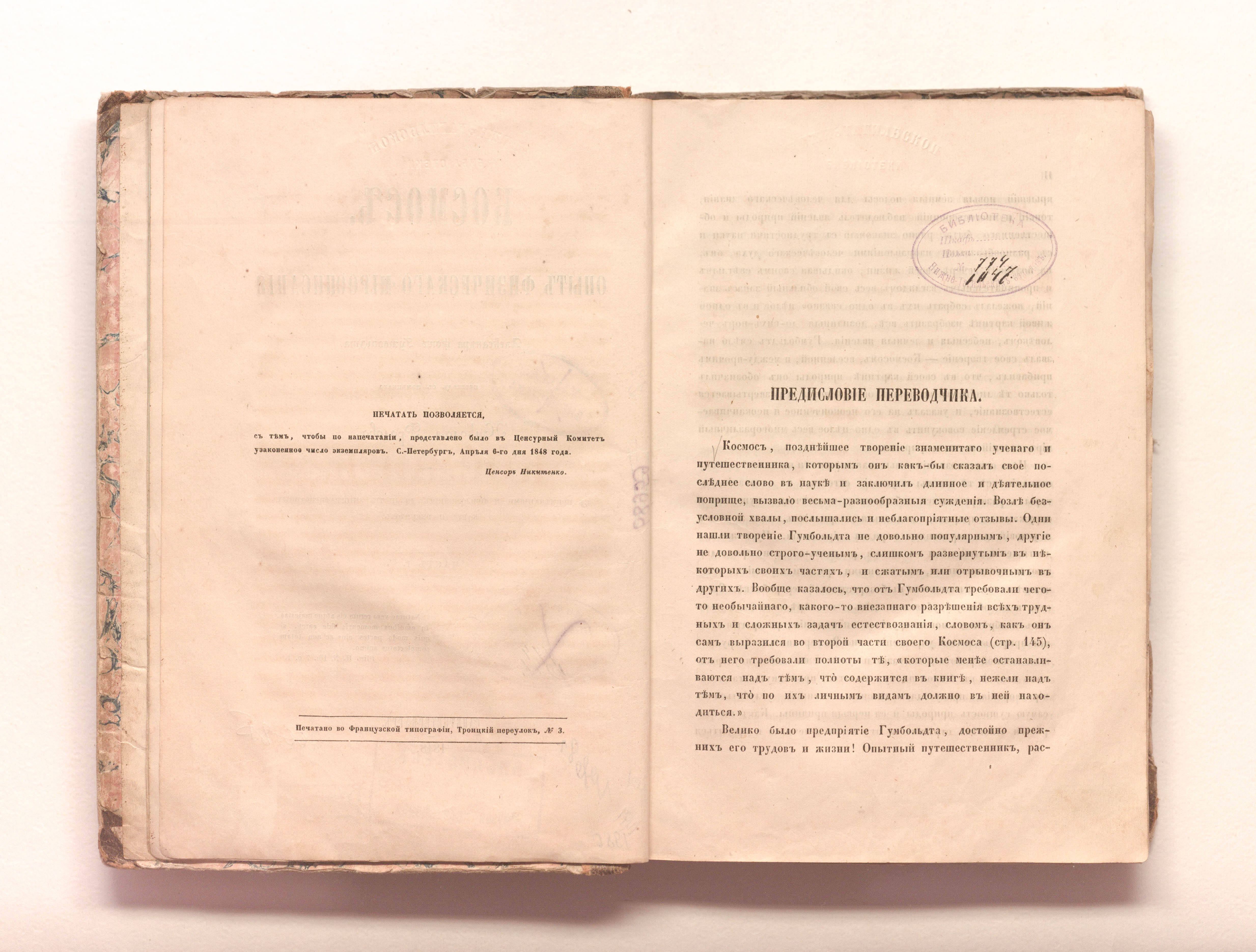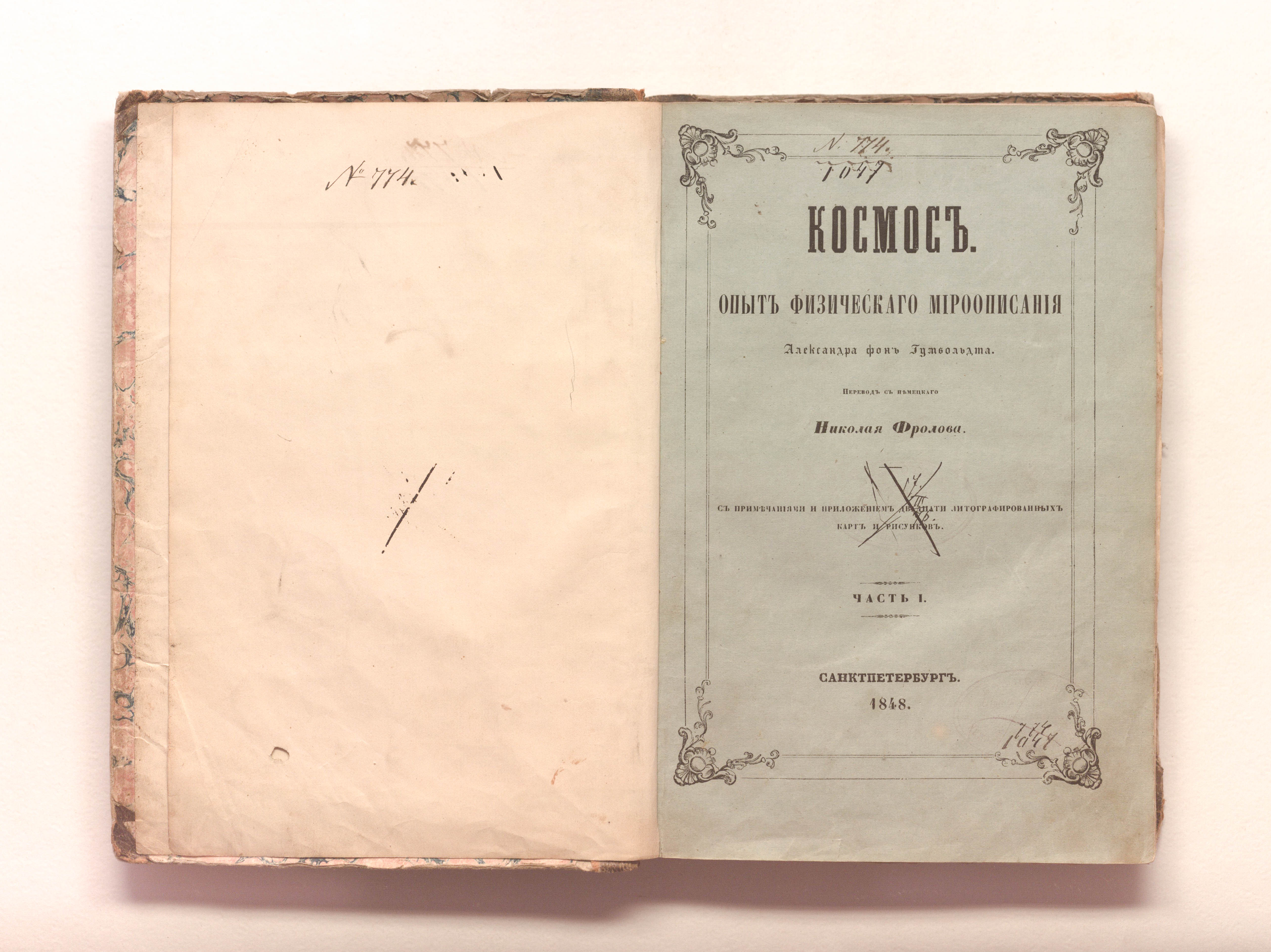 Гумбольдт, Александр Фридрих (1769-1859). Космос. Опыт физическаго мироописания / А. фон Гумбольдт ; перевод с немецкаго Николая Фролова. — Ч. 1. — Санкт-Петербург : печатано во французской типографии, 1848. — X, 331 с. : лит. ; 25х17 см.