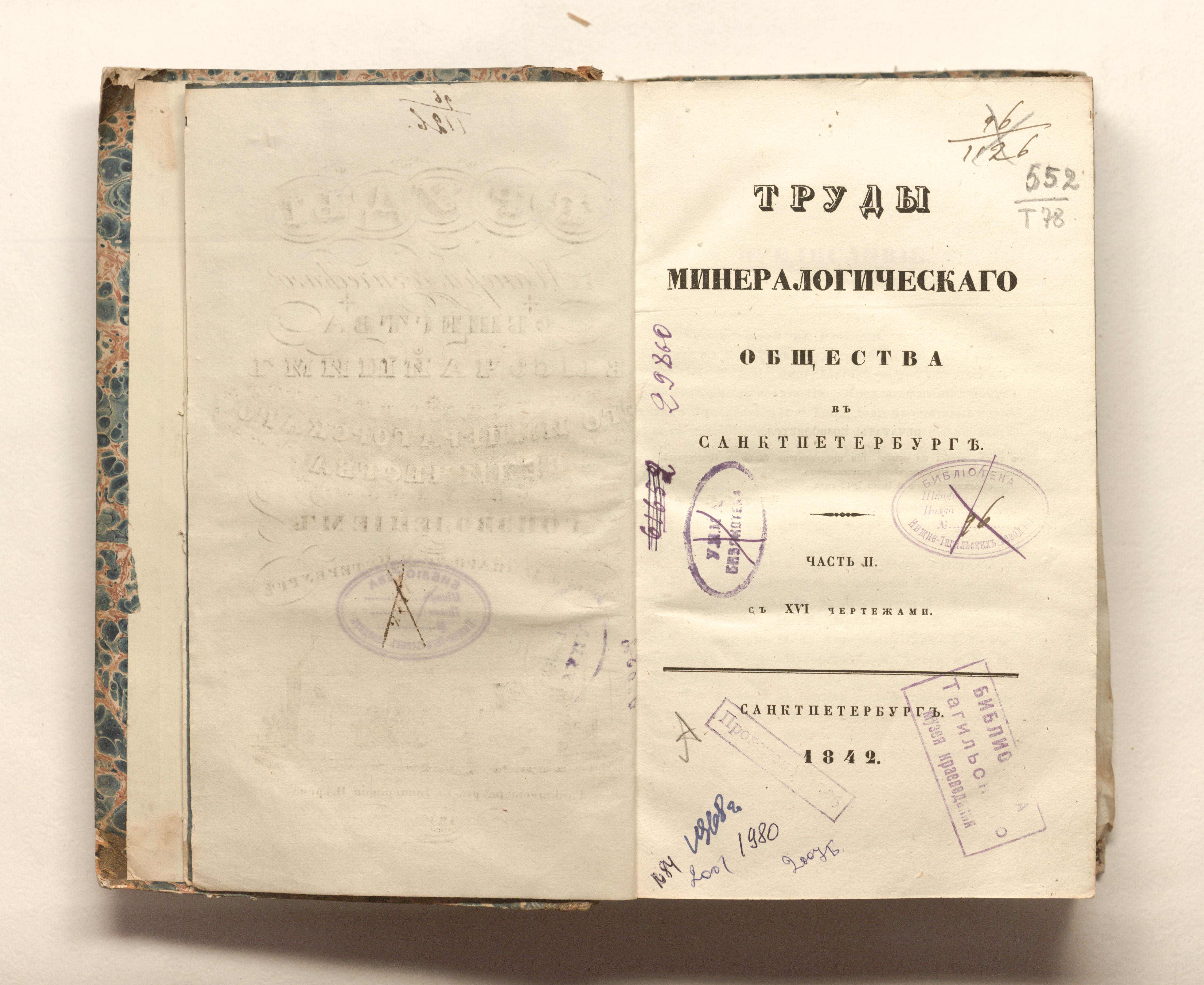 Труды Минералогического Общества в Санктпетербурге. Ч. 2. — Санкт-Петербург : типография Н. Греча, 1842. — [6], 452 с. : табл. ; 25х15,5 см.