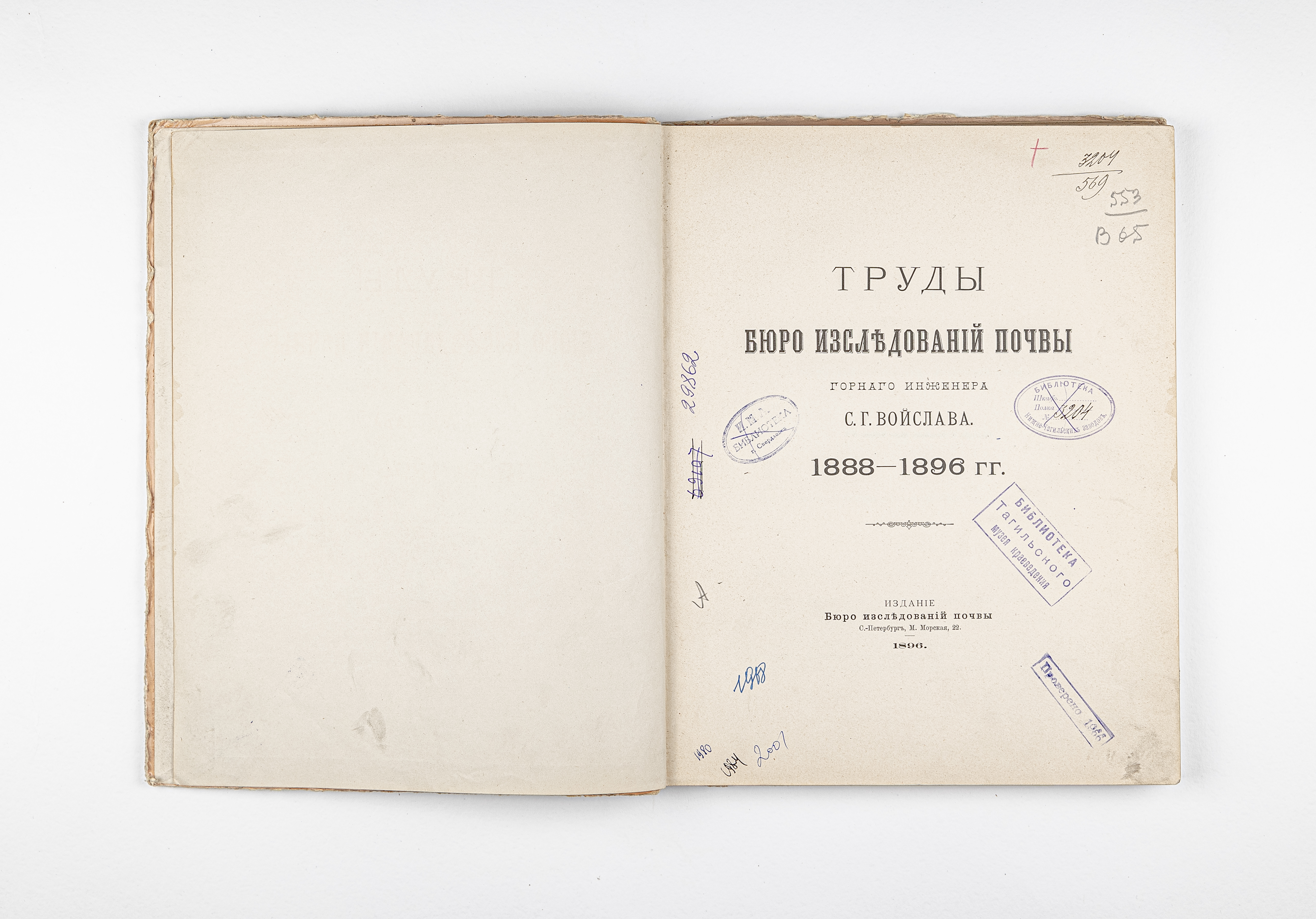 Труды бюро изследований почвы горнаго инженера С. Г. Войслава / сост. С. Г. Войслав. – Санкт-Петербург : тип. Н. Финдейзена, 1896. – [7], 123 с. ; 31х25 см.