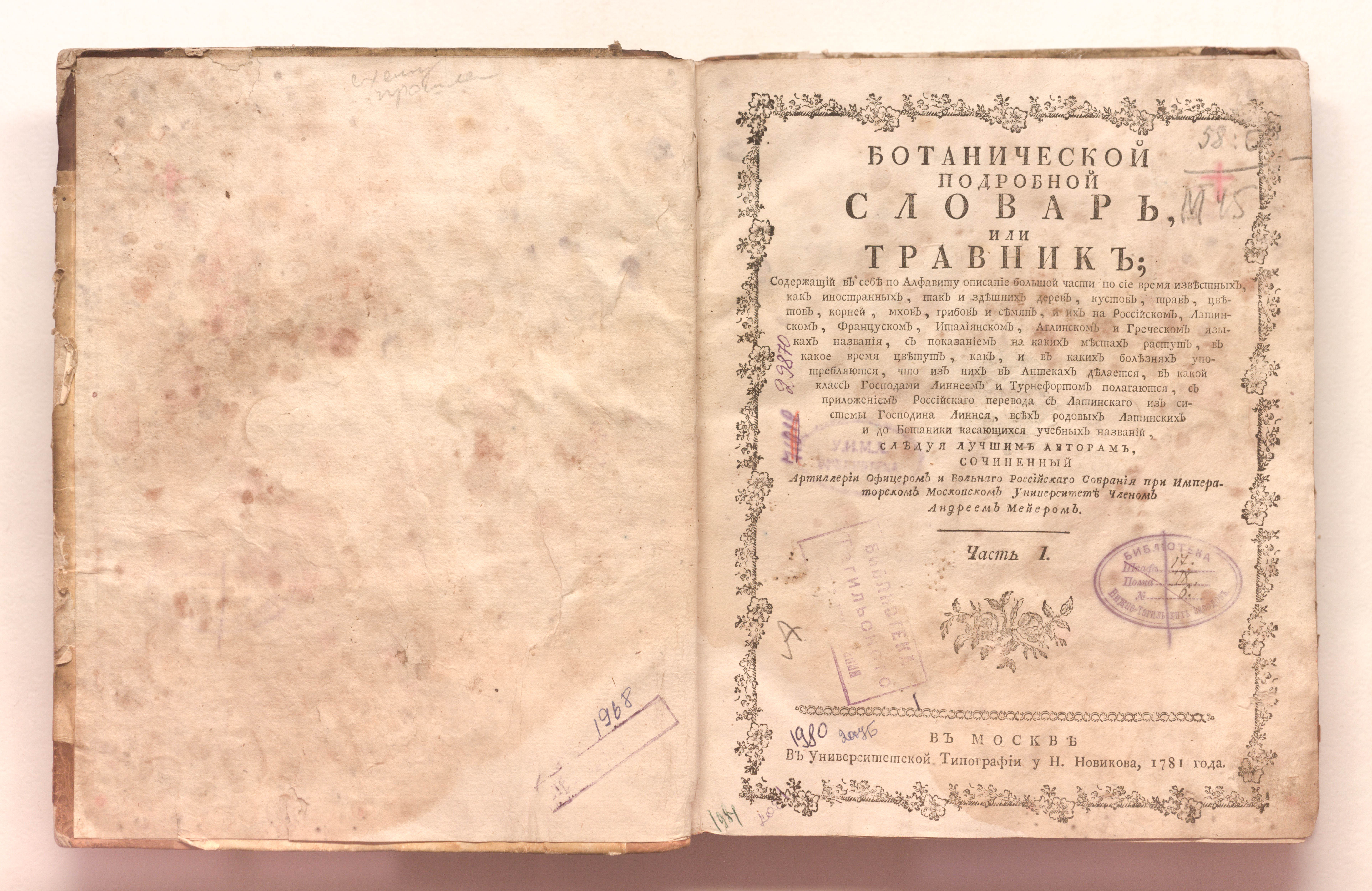 Ботанической подробной словарь или Травник... : содержащий в себе по алфавиту описание большой части по сие время известных, как иностранных, так и здешних дерев, кустов, трав, цветов, корней, мхов, грибов и семян, и их на российском, латинском, француском, италиянском, аглинском и греческом языках названия, : С показанием на каких местах растут, в какое время цветут, как, и в каких болезнях употребляются, что из них в аптеках делается, в какой класс господами Линнеем и Турнефортом полагаются, : С приложением российскаго перевода с латинскаго из системы господина Линнея, всех родовых латинских и до ботаники касающихся названий,.