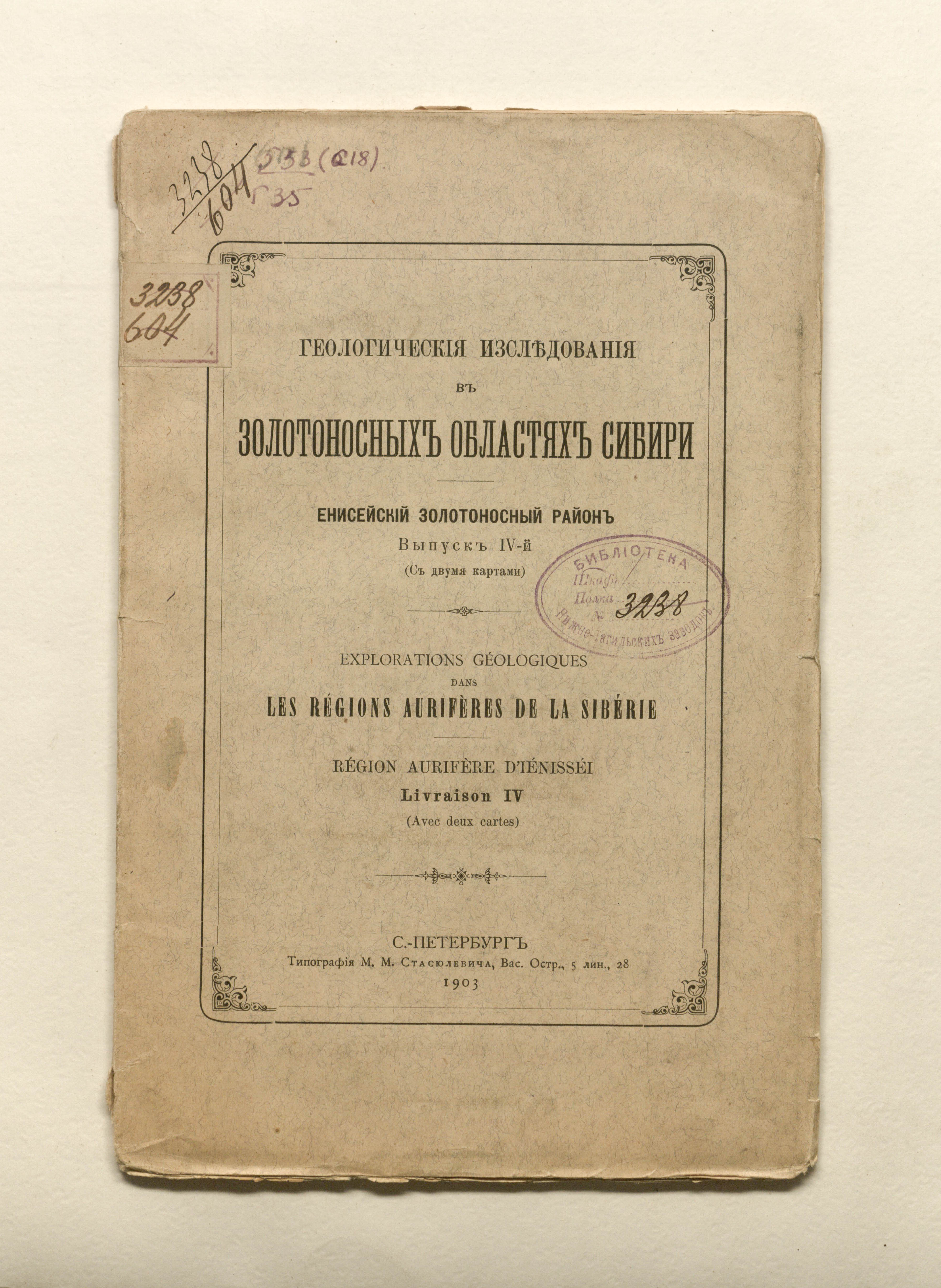 Геологические исследования в золотоносных областях Сибири. Вып. IV. Енисейский золотоносный район. — Санкт-Петербург : тип. М.М. Стасюлевича, 1903. — [4], 79 с. : карты. ; 25х16,5 см.