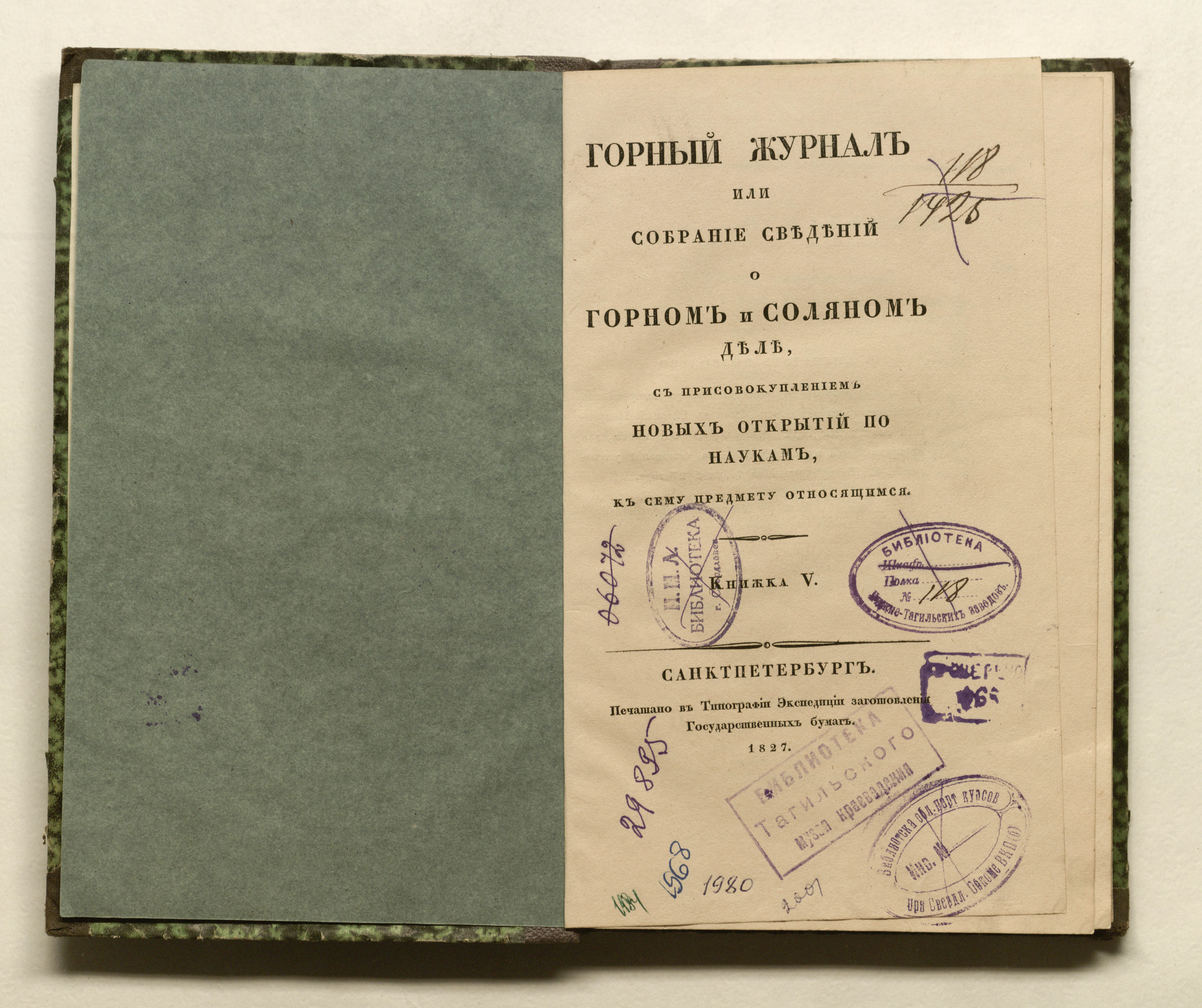 Кн. 5. — Санктпетербург : печатано в типографии Экспедиции заготовления Государственных бумаг, 1827. — [4], 169, [1] с. : [2] л. черт. ; 24х14,5 см.
